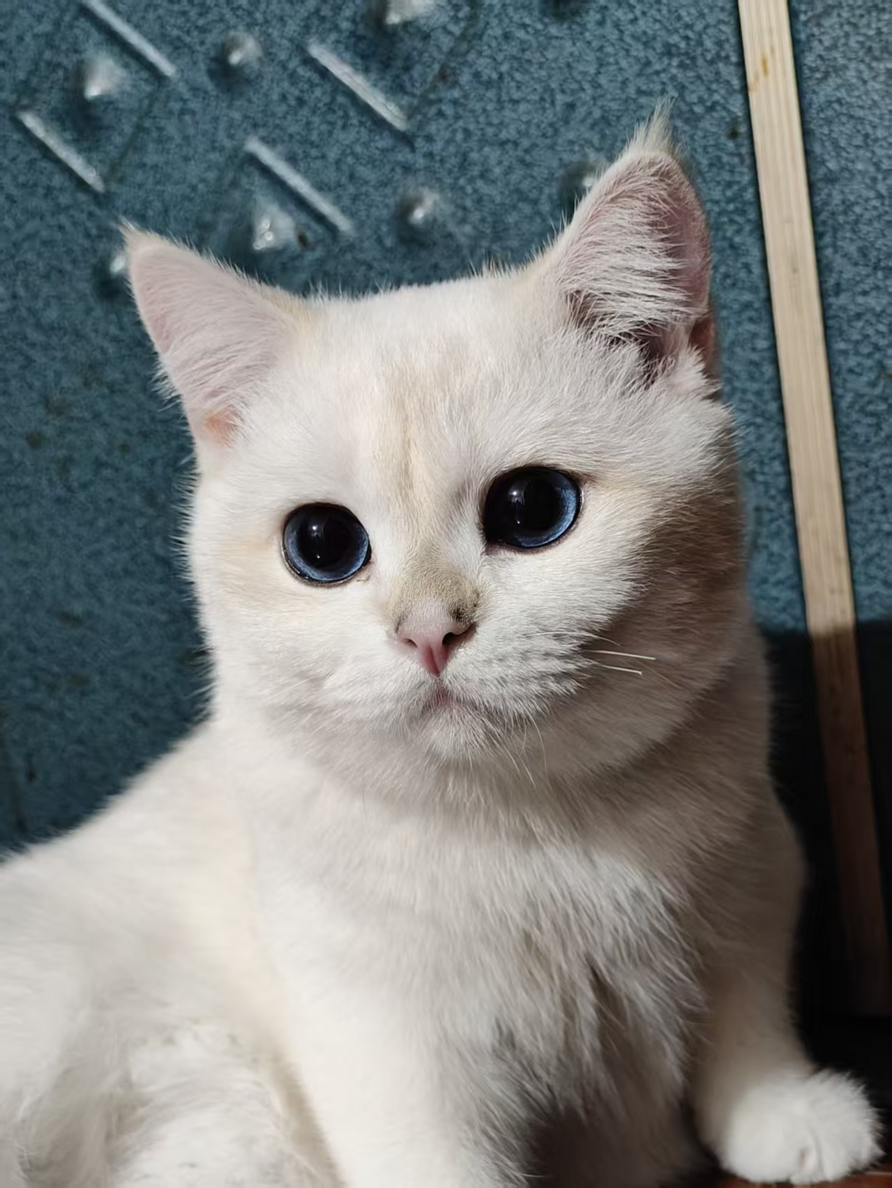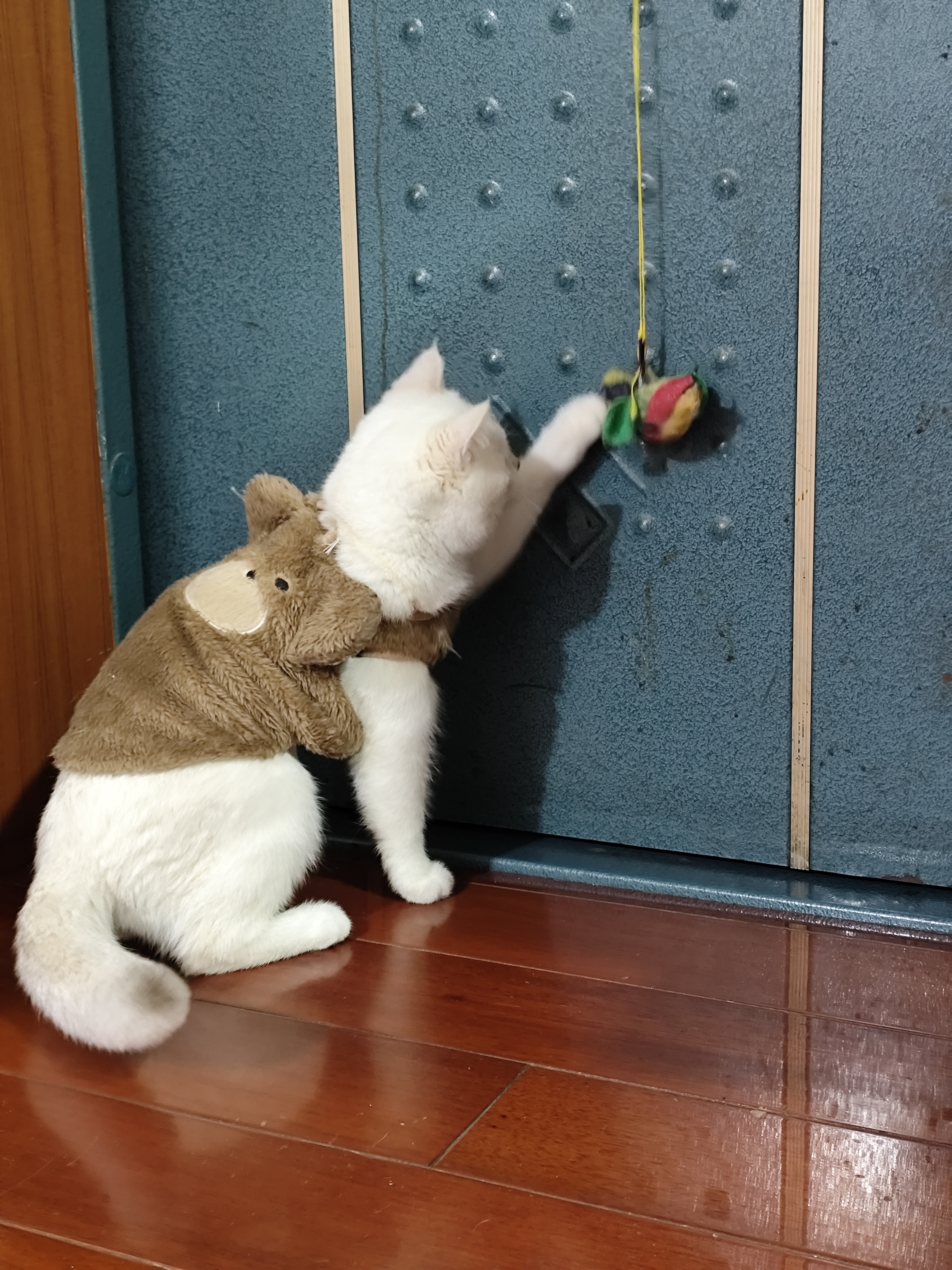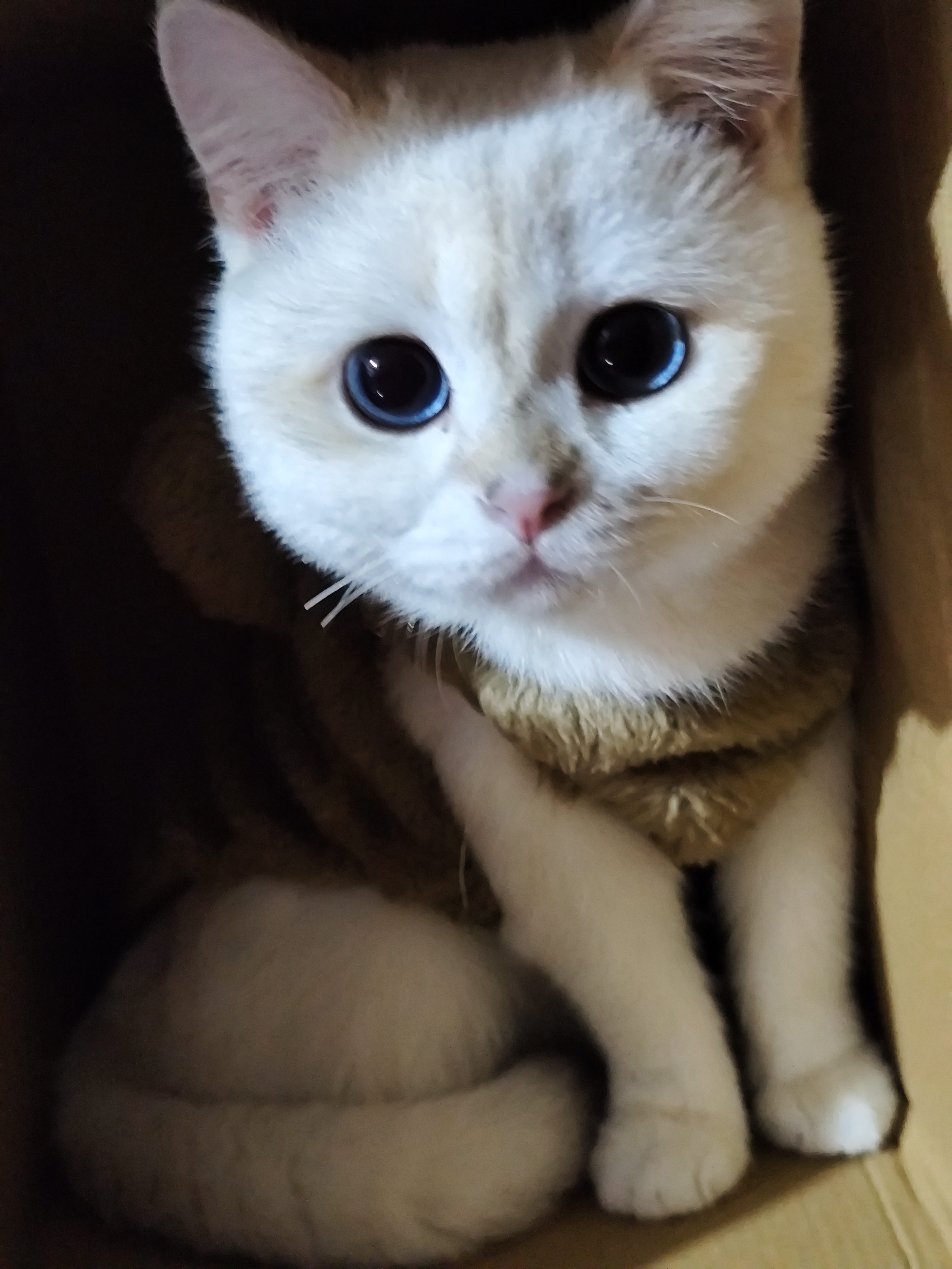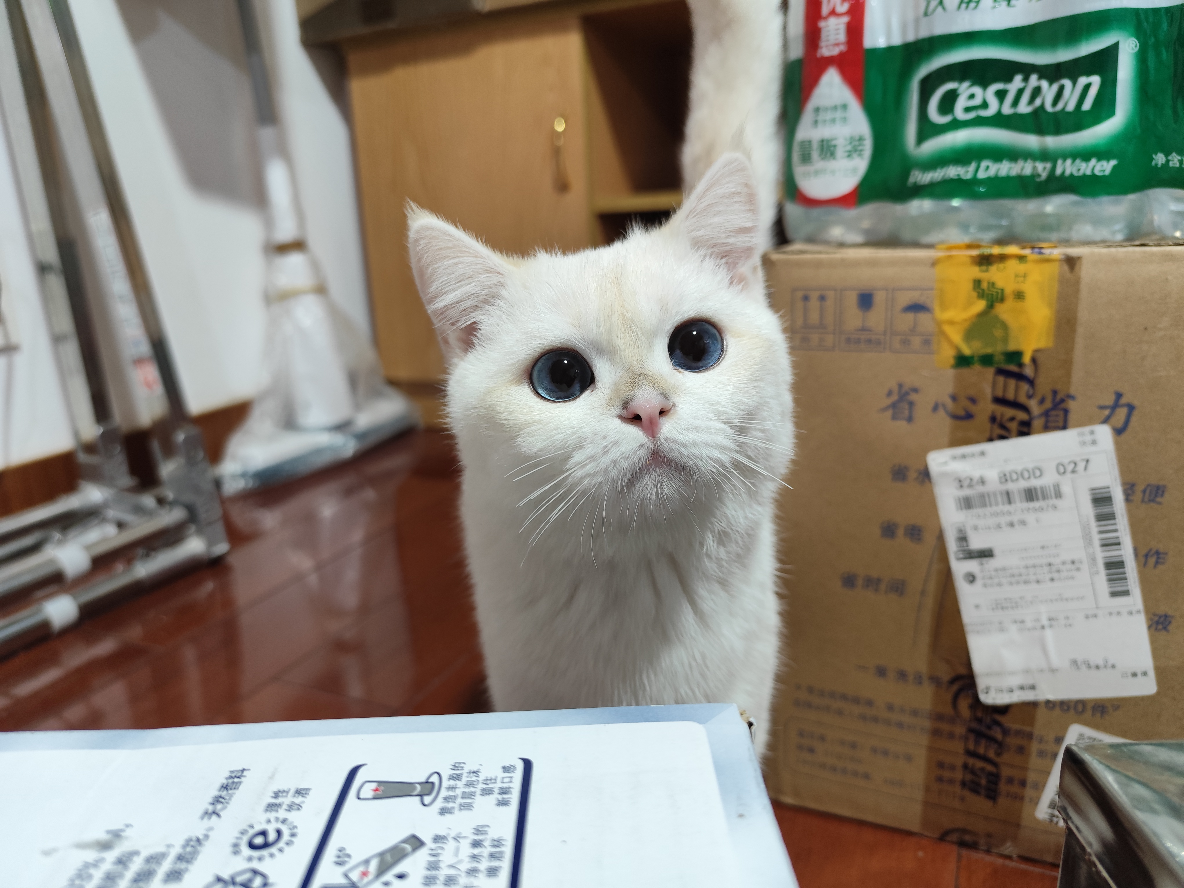 木地板上,蓝眼小雪球追着纸箱玩,毛茸茸一团撞翻了Cestbon,快递盒子成了新猫窝~