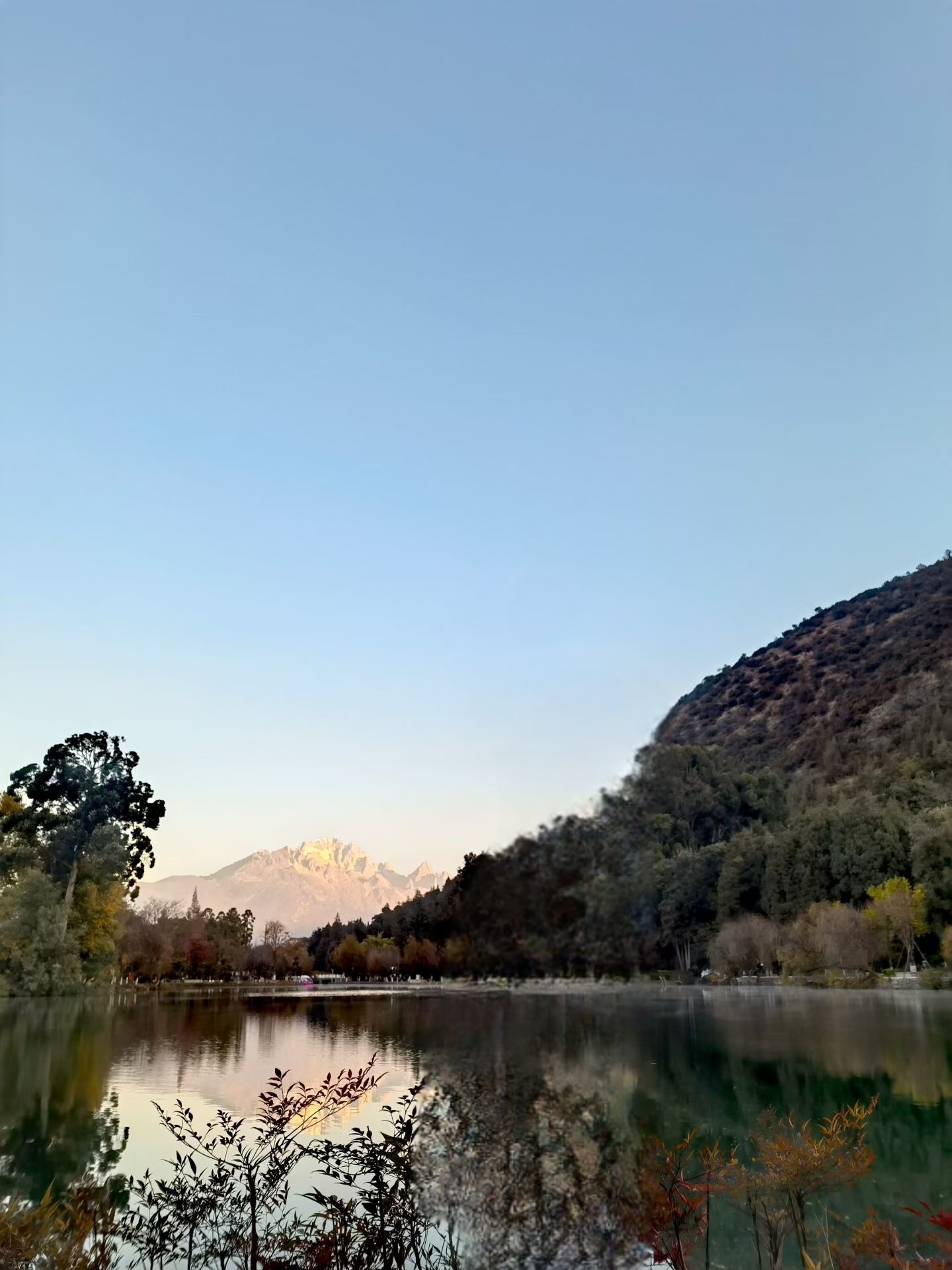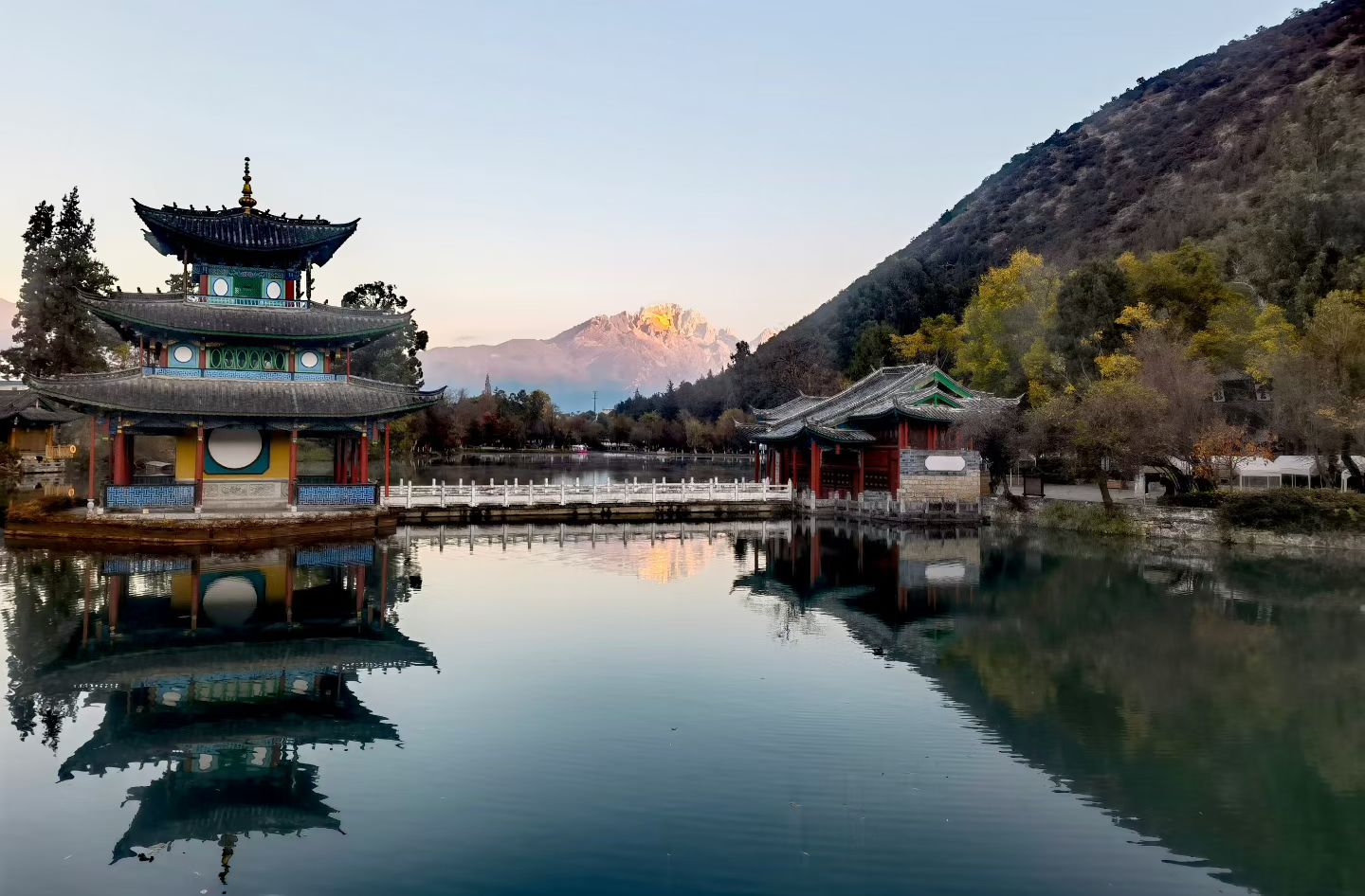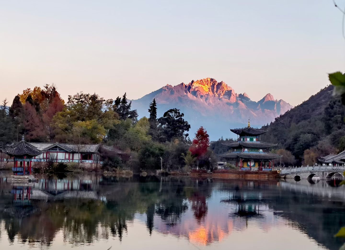 云南的丽江古城,清晨远眺日照金山,现场安静地欣赏它慢慢亮起来的震撼远大于图像的拍摄效果。