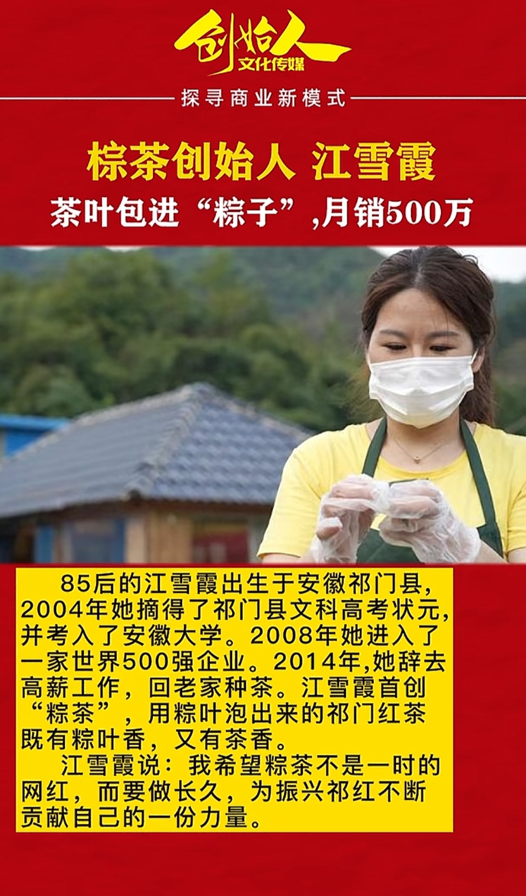 【祁门红“粽”的初心与远方:一位90后女孩的返乡“茗”片】 🌿 当清冽粽叶遇见祁门香 她让故乡茶山飘出新故事 “为什么大城市留不住年轻人? 也许,我们缺的不是机会, 而是一个让传统重新发光的可能。” 2018年,江雪霞辞去上海白领工作 回到黄山祁门县大山深处 所有人都说:“这书白读了” 直到她把祖传茶香包进端午粽叶 “祁门粽茶”横空出世—— 三片高山槠叶种茶叶 + 两缕箬叶清香 在沸水中苏醒成琥珀色的乡愁 🏆 如今她的茶厂年销超千万 带动200多位乡亲就业 让平均年龄60岁的采茶阿婆 笑着说出:“我家孙女也说要回来学手艺” ✨ 这不仅是商业成功 更是一场文化破局: · 古法制茶技艺获非遗认证 · 茶旅融合让老屋变民宿 · 短视频里阿婆泡茶成“网红课堂” “茶叶不只是商品, 是我们和土地的血脉契约。” ——江雪霞在茶园这样说时 远山正升起今年第一缕晨雾 🌱 返乡创业的深意 从来不是“逃离都市” 而是把根扎进最熟悉的土壤 让传统长出惊艳时代的模样 #新农人浪潮 #非遗新生 #乡村振兴实践 #有一种乡愁叫创造价值 (欢迎分享你身边的“返乡创变者”故事👇) 返乡不只是地理的回归, 更是与故土一次创造性的重逢。 当传统被岁月浸透成标本, 总有人选择让它重新抽枝发芽。 江雪霞和她的祁门粽茶, 让我们看见: 根扎得越深,枝叶越能触摸天空。 原来“传承”二字最动人的写法, 不是小心翼翼地供奉, 而是勇敢地让它走入今天的生活, 走入年轻人的茶杯, 走入这个时代的叙事脉络。 她用一片茶叶证明了: 乡村不是背景板, 而是可以书写未来的舞台; 传统不是包袱, 而是我们飞翔时最稳的凭依。 在这个常讨论“离开与留下”的时代, 她给出了第三种答案—— 归来,并让归来之地焕然一新。 这缕祁门粽茶的香气里, 有山的记忆,也有风的方向, 更有一种温柔的启示: 最深厚的创新, 往往始于对来处最深情的凝望。 愿每个游子都能找到自己的“茶山”, 愿每片故土都等来它的点灯人。