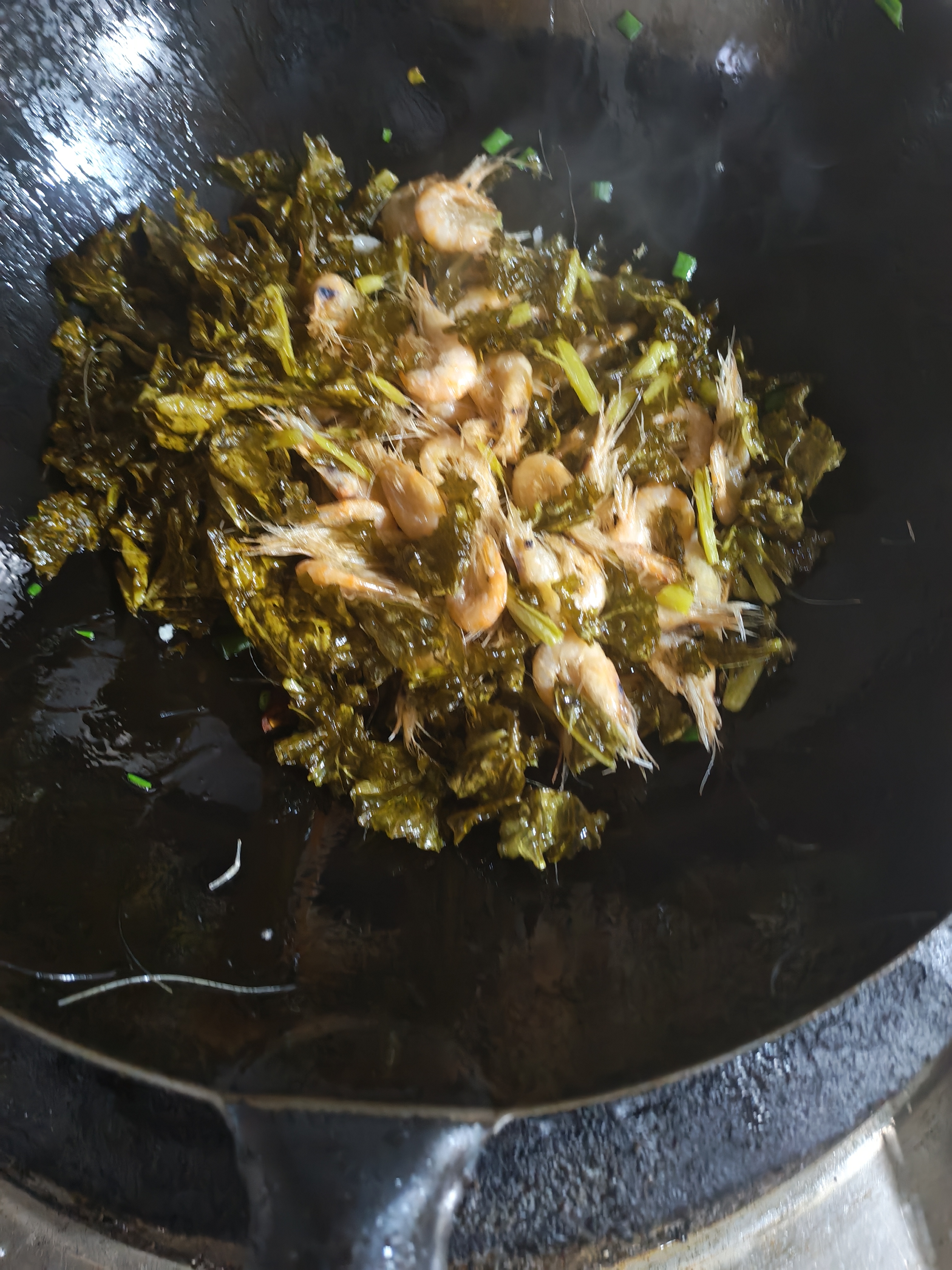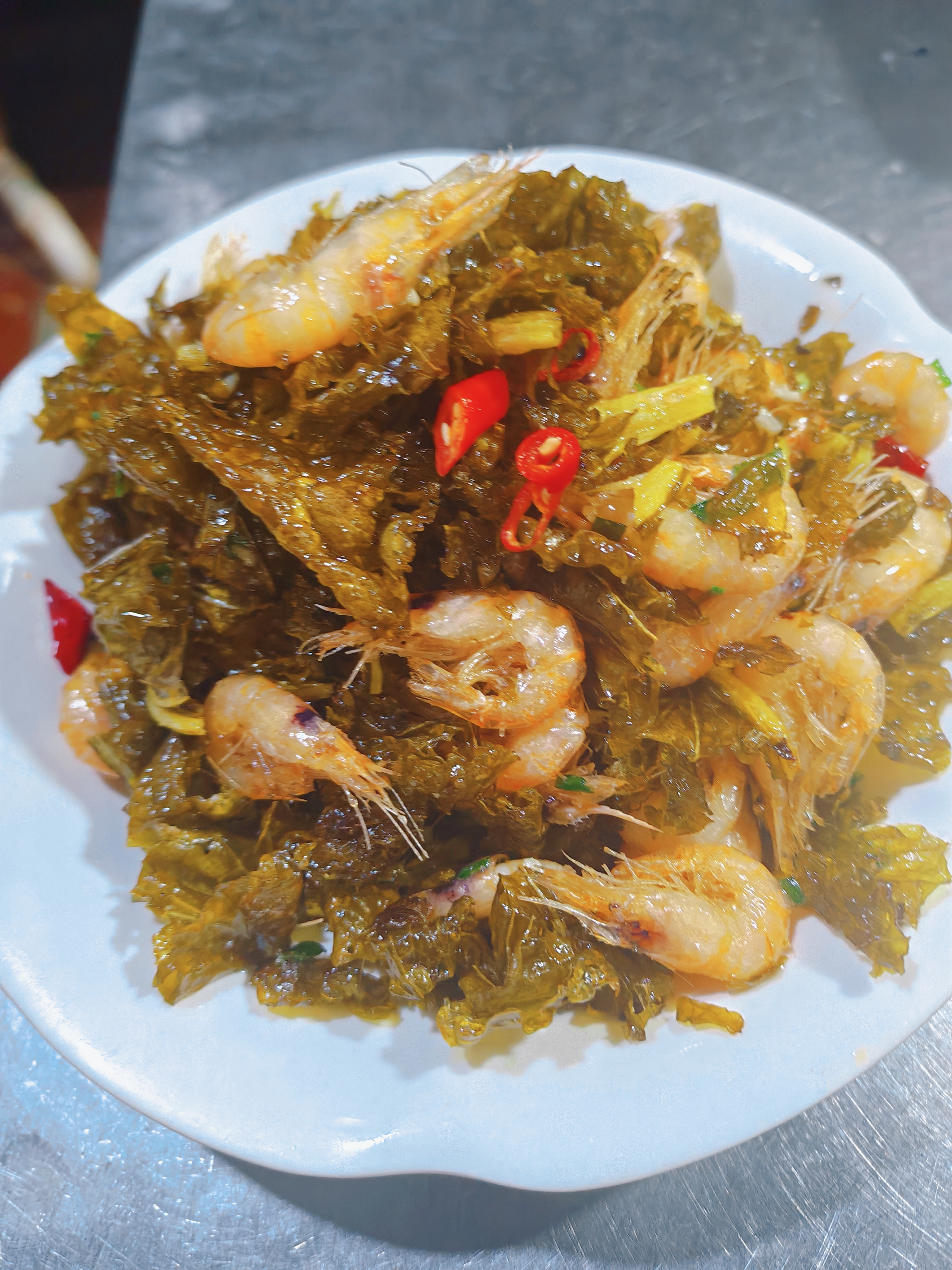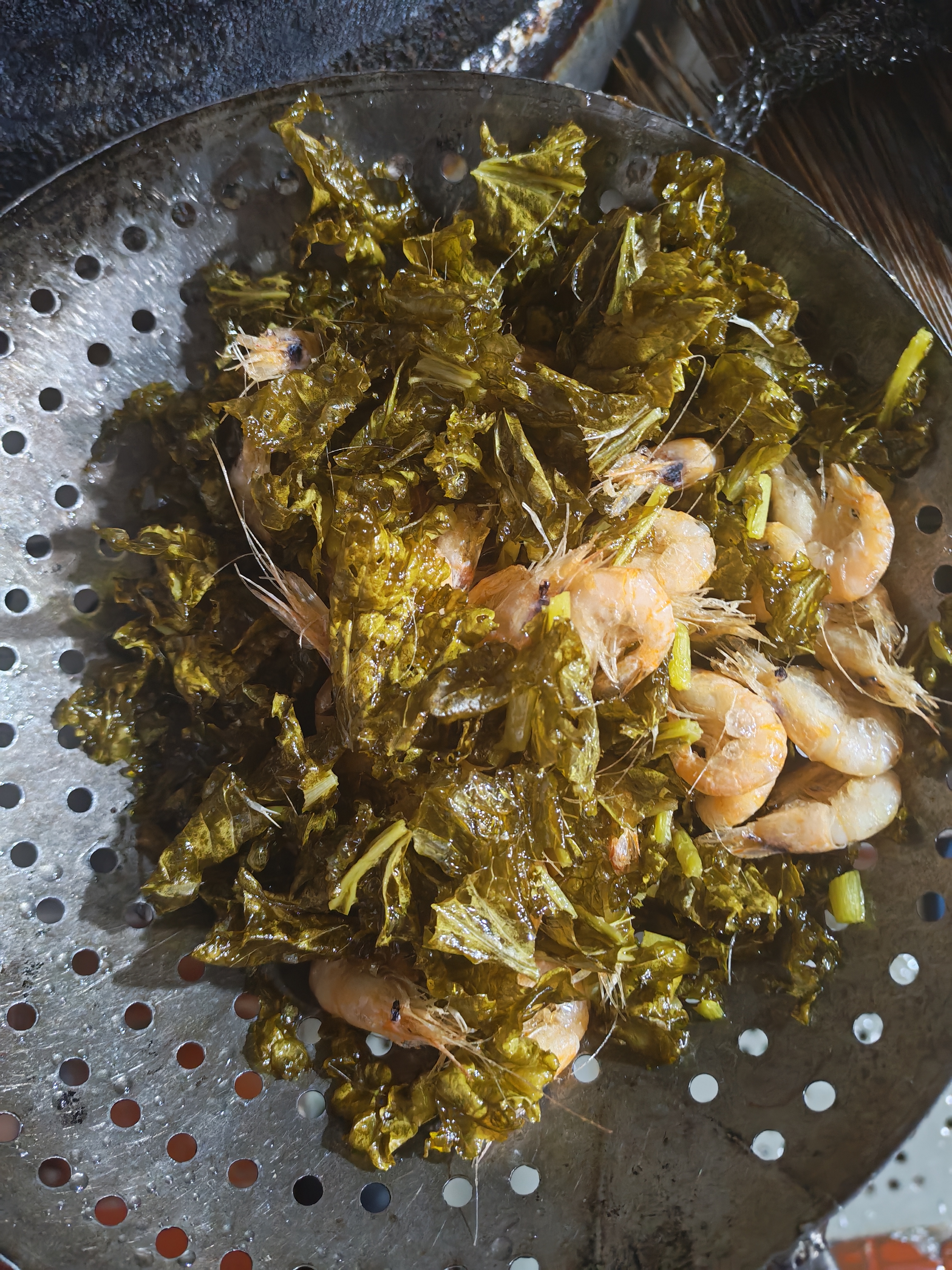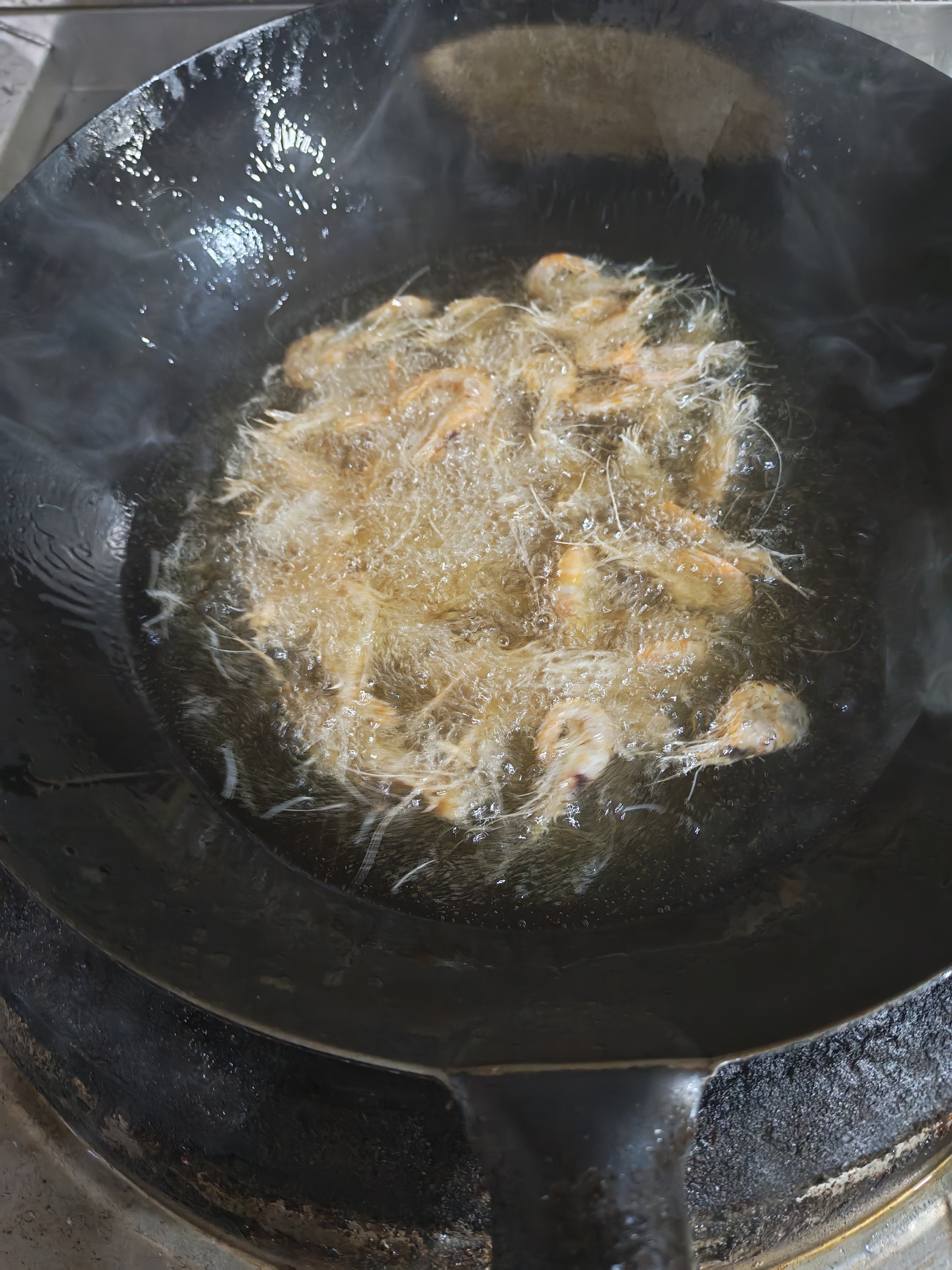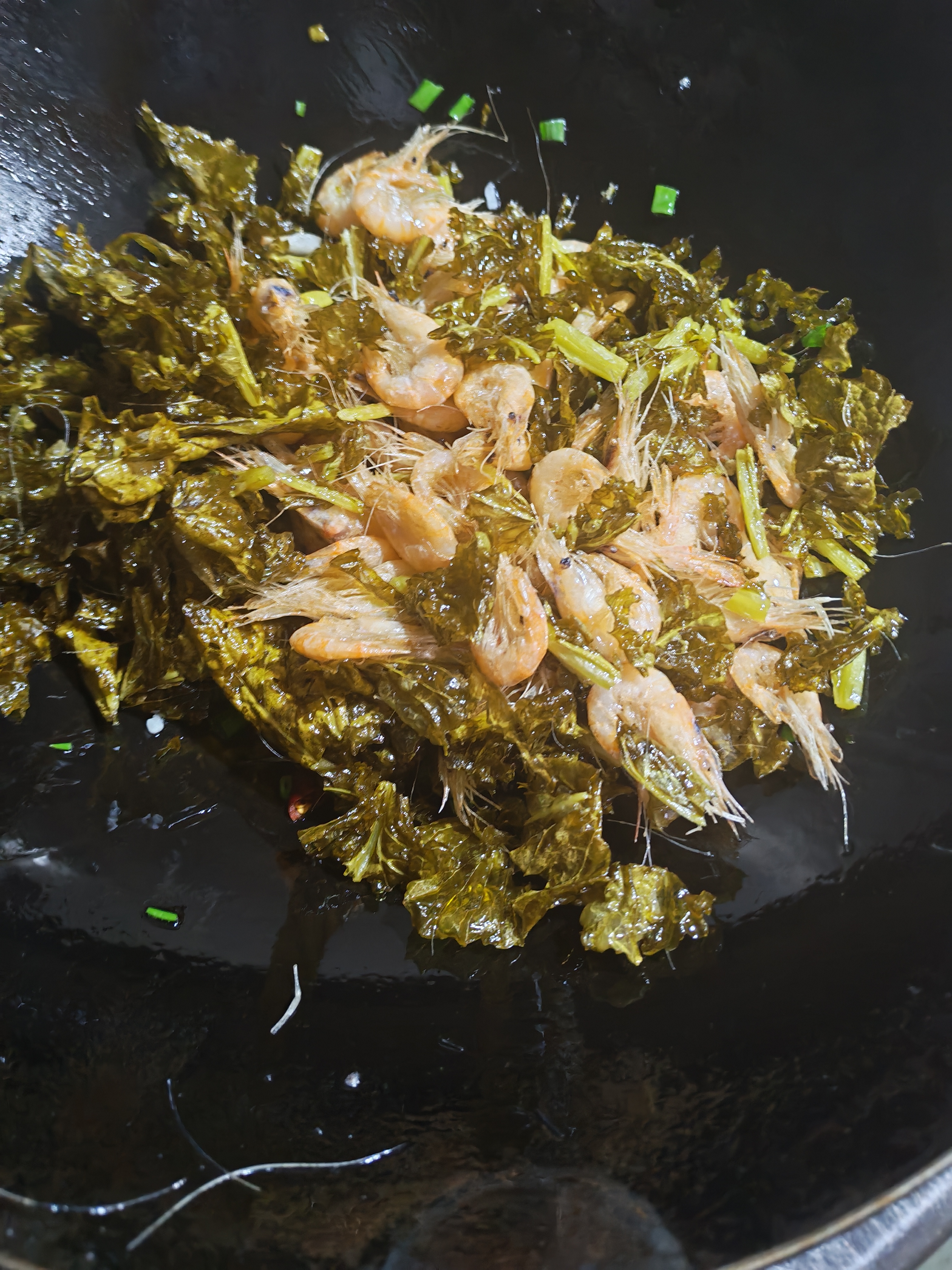 咸菜小白虾,一口下去,先是炸得酥脆的咸菜叶“咔嚓”一声,紧接着是小白虾的鲜香在嘴里爆开。咸菜的咸香把虾的鲜甜托得更明显,再配上葱姜蒜和红辣椒的热辣香气,越嚼越上头。 这道菜最妙的是“快”和“脆”:油温五成热,小白虾下锅十秒就起,咸菜叶跟着一炸就酥,沥油回锅一翻,撒点细盐就够味。不需要复杂调味,吃的就是食材本真的香。 下班回家来一盘,配碗白粥或米饭都很绝;朋友小聚当下酒菜也很出彩。简单,但每一口都很有存在感。 食材准备 - 小白虾:适量(建议挑选个头均匀的) - 咸菜叶:适量(取叶子部分,洗净后一定要沥干水分) - 食用油:用于油炸 - 葱姜蒜:切末或切丝 - 红辣椒:切段或圈 - 细盐:少许(咸菜本身有咸味,盐要少放) 做法步骤 1. 处理食材 - 咸菜取叶子,切成小段。 - 小白虾洗净后沥干水分(这一步很关键,否则下油锅会溅油)。 2. 炸制小白虾和咸菜叶 - 锅中倒入食用油,烧至五成热(约150℃左右,油面微微冒烟,筷子插入有细小气泡)。 - 下小白虾,炸约10秒,让虾定型并微微变脆。 - 立刻加入咸菜叶,继续炸至叶子酥脆。 - 将虾和咸菜叶一起捞出,沥干油备用。 3. 炒制调味 - 锅中留少许底油,放入葱姜蒜和红辣椒,小火炒香。 - 倒入炸好的小白虾和咸菜叶,转大火快速翻炒。 - 边翻边撒入少许细盐,调味后即可出锅。 关键小贴士 - 咸菜叶一定要沥干:水分多会导致炸不酥,还容易溅油。 - 炸制时间要短:小白虾和咸菜叶都很容易炸过头,时间过长会发苦、发柴。 - 盐要最后少放:咸菜本身咸,建议先尝味道再决定是否加盐。