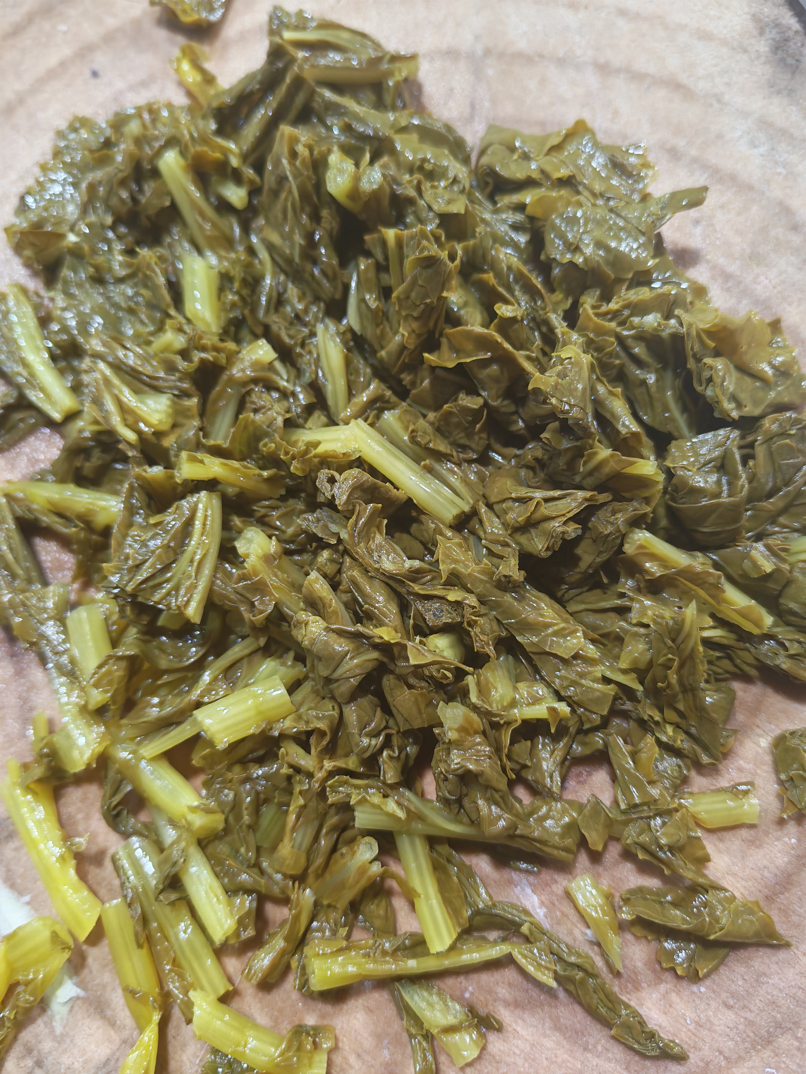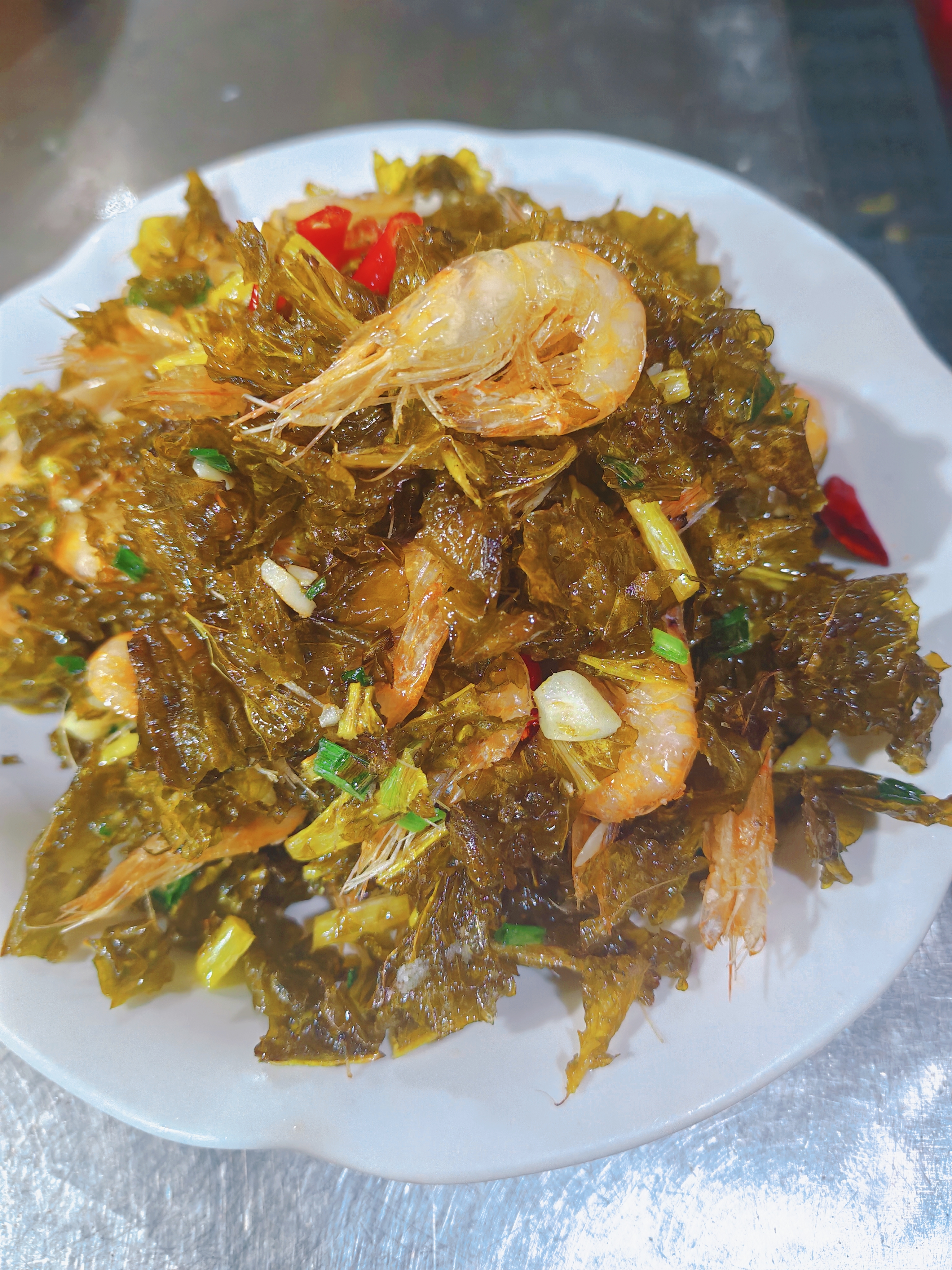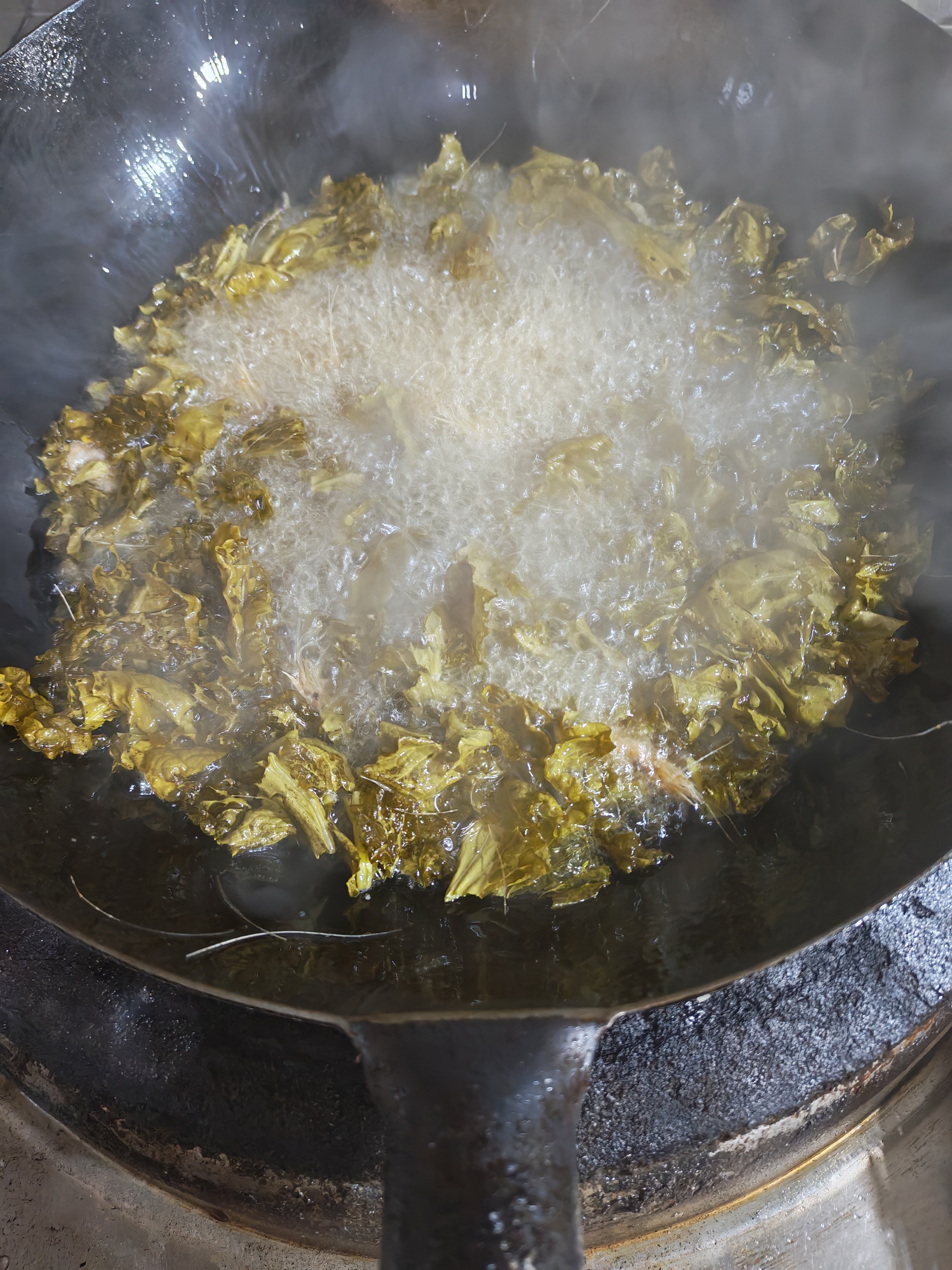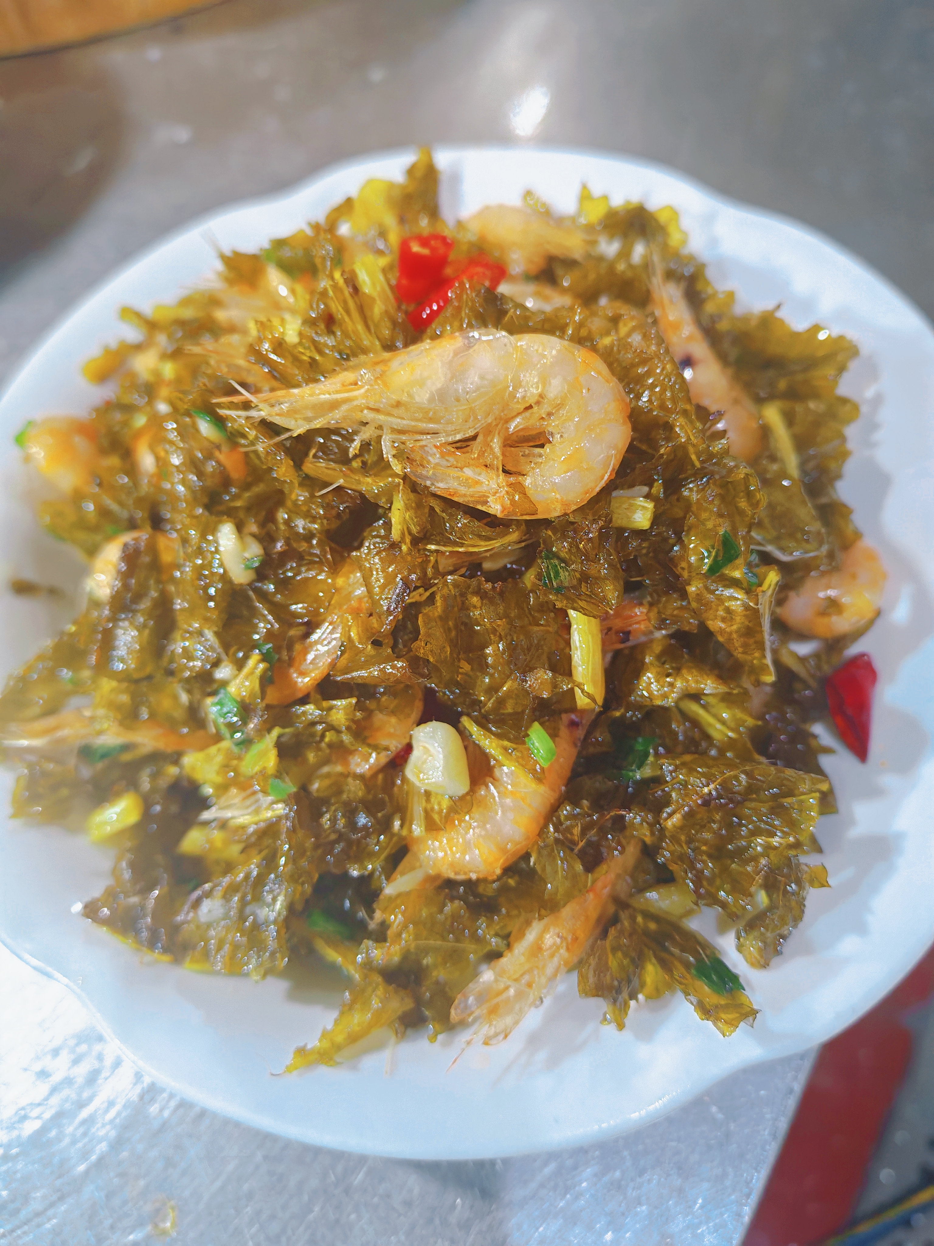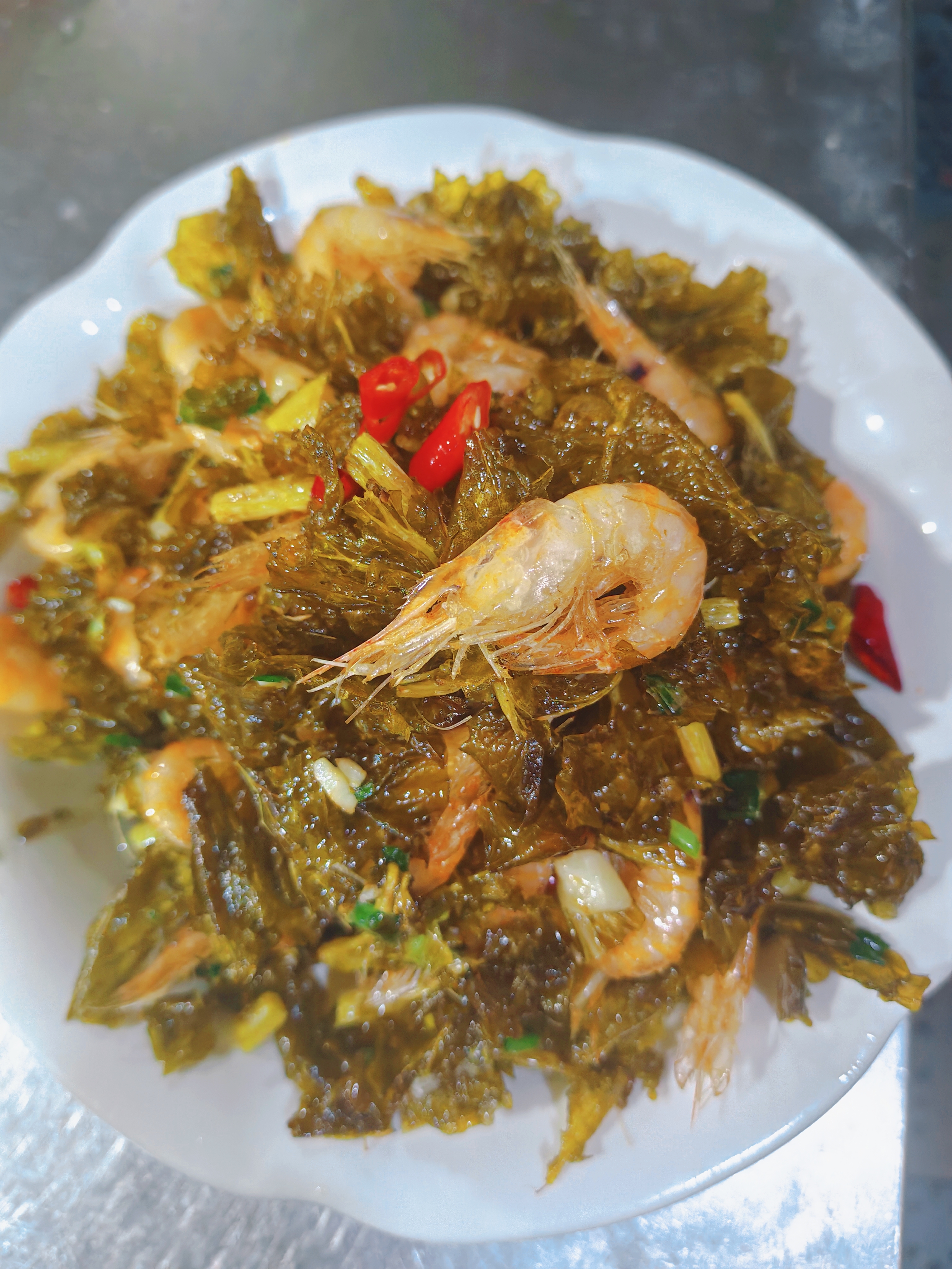 咸菜小白虾,一口下去,先是炸得酥脆的咸菜叶“咔嚓”一声,紧接着是小白虾的鲜香在嘴里爆开。咸菜的咸香把虾的鲜甜托得更明显,再配上葱姜蒜和红辣椒的热辣香气,越嚼越上头。 这道菜最妙的是“快”和“脆”:油温五成热,小白虾下锅十秒就起,咸菜叶跟着一炸就酥,沥油回锅一翻,撒点细盐就够味。不需要复杂调味,吃的就是食材本真的香。 下班回家来一盘,配碗白粥或米饭都很绝;朋友小聚当下酒菜也很出彩。简单,但每一口都很有存在感。 食材准备 - 小白虾:适量(建议挑选个头均匀的) - 咸菜叶:适量(取叶子部分,洗净后一定要沥干水分) - 食用油:用于油炸 - 葱姜蒜:切末或切丝 - 红辣椒:切段或圈 - 细盐:少许(咸菜本身有咸味,盐要少放) 做法步骤 1. 处理食材 - 咸菜取叶子,切成小段。 - 小白虾洗净后沥干水分(这一步很关键,否则下油锅会溅油)。 2. 炸制小白虾和咸菜叶 - 锅中倒入食用油,烧至五成热(约150℃左右,油面微微冒烟,筷子插入有细小气泡)。 - 下小白虾,炸约10秒,让虾定型并微微变脆。 - 立刻加入咸菜叶,继续炸至叶子酥脆。 - 将虾和咸菜叶一起捞出,沥干油备用。 3. 炒制调味 - 锅中留少许底油,放入葱姜蒜和红辣椒,小火炒香。 - 倒入炸好的小白虾和咸菜叶,转大火快速翻炒。 - 边翻边撒入少许细盐,调味后即可出锅。 关键小贴士 - 咸菜叶一定要沥干:水分多会导致炸不酥,还容易溅油。 - 炸制时间要短:小白虾和咸菜叶都很容易炸过头,时间过长会发苦、发柴。 - 盐要最后少放:咸菜本身咸,建议先尝味道再决定是否加盐。