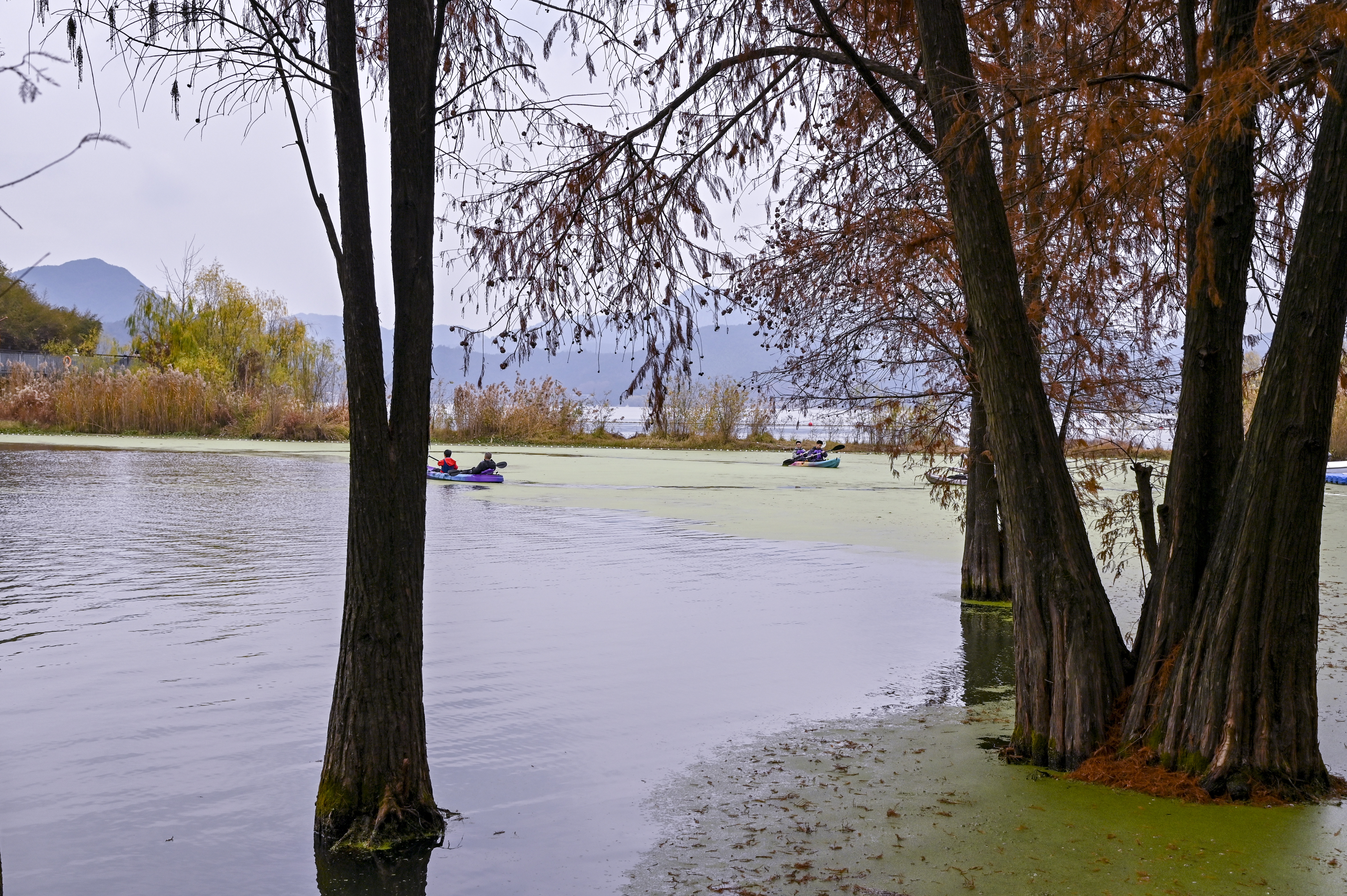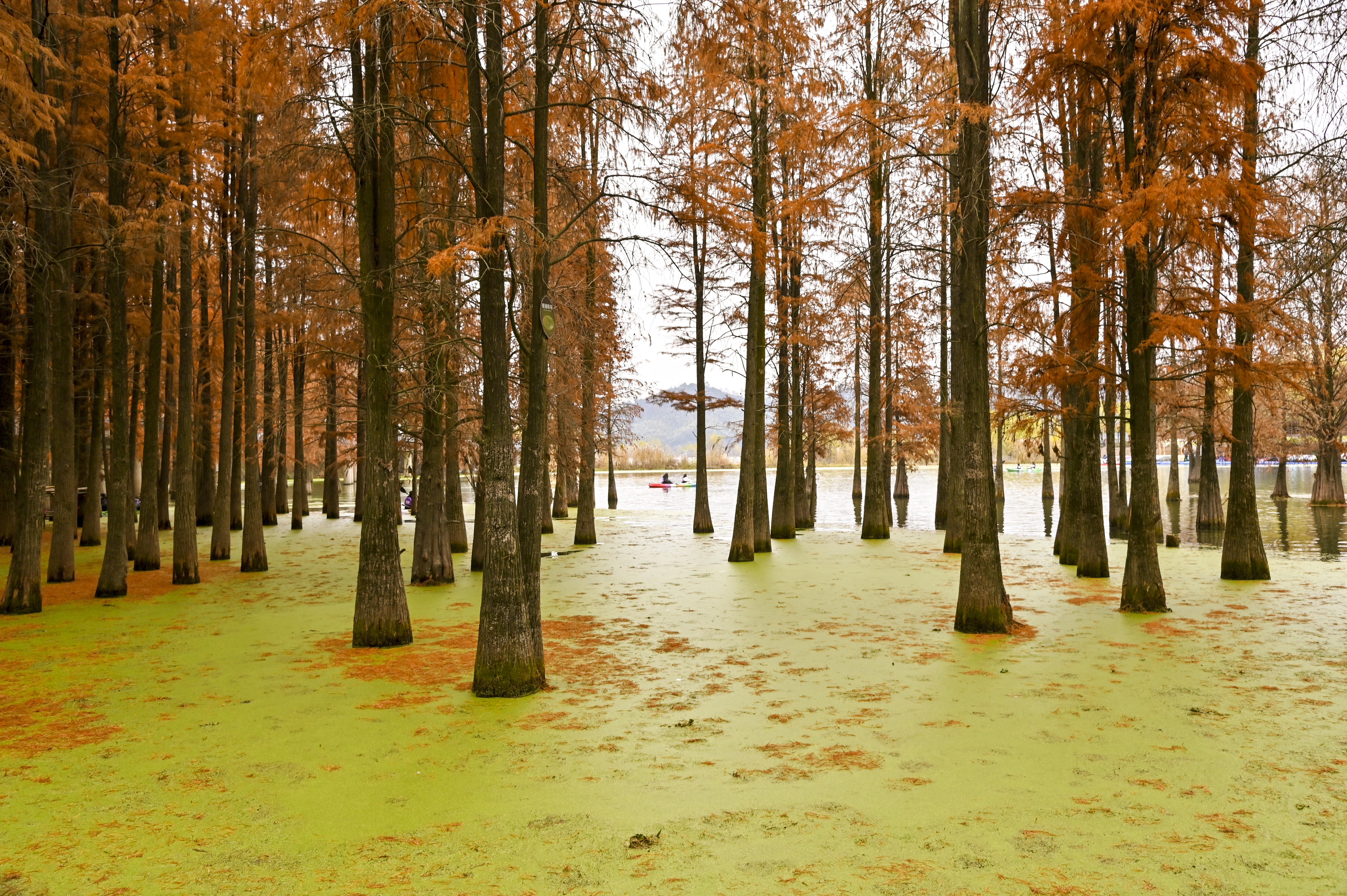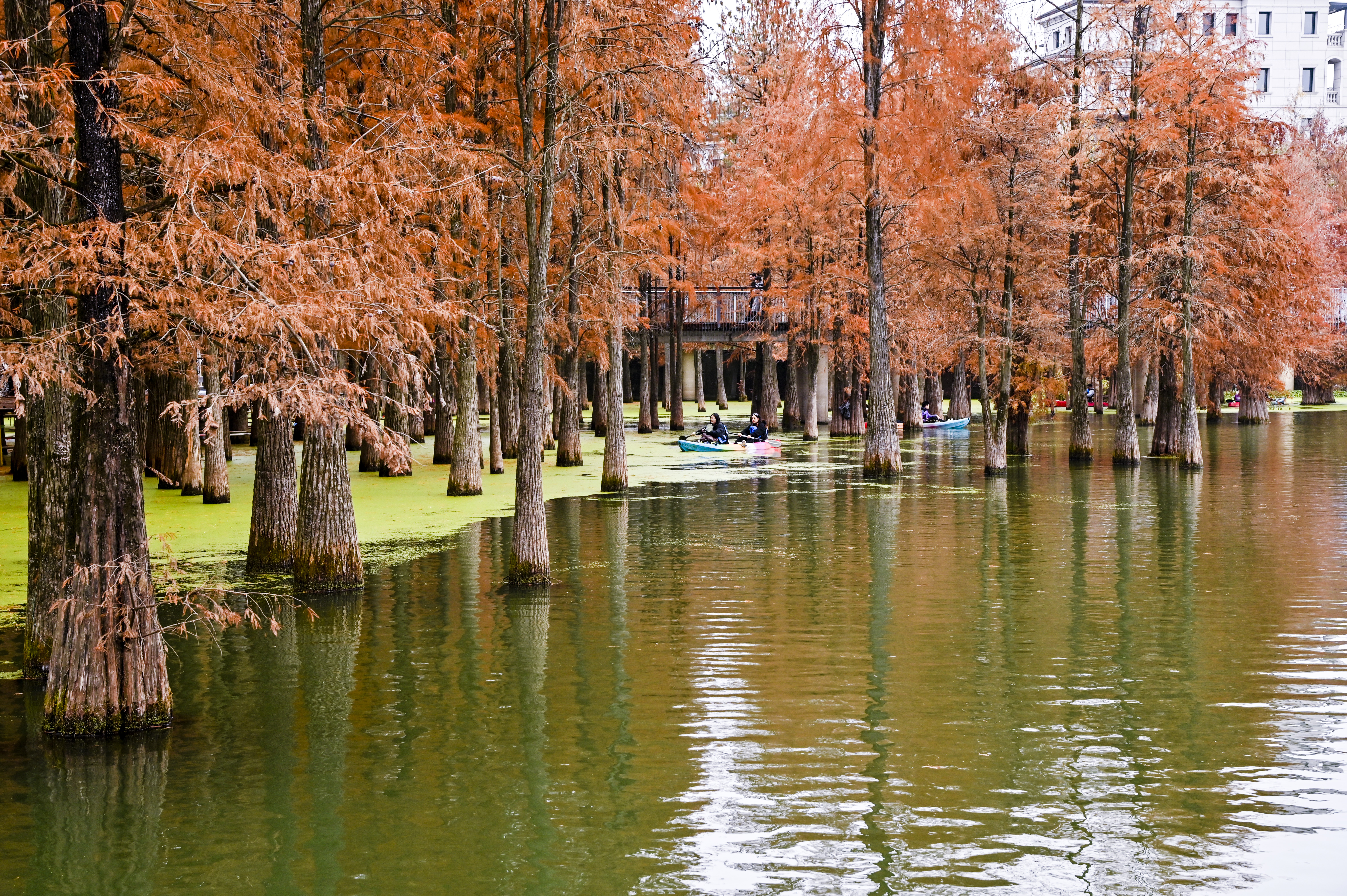 青山湖水上森林公园,红羽绿萍划船🚣🏻♀️美女,点缀密林远近景,湖光山色映红叶,穿行其间不亦乐乎