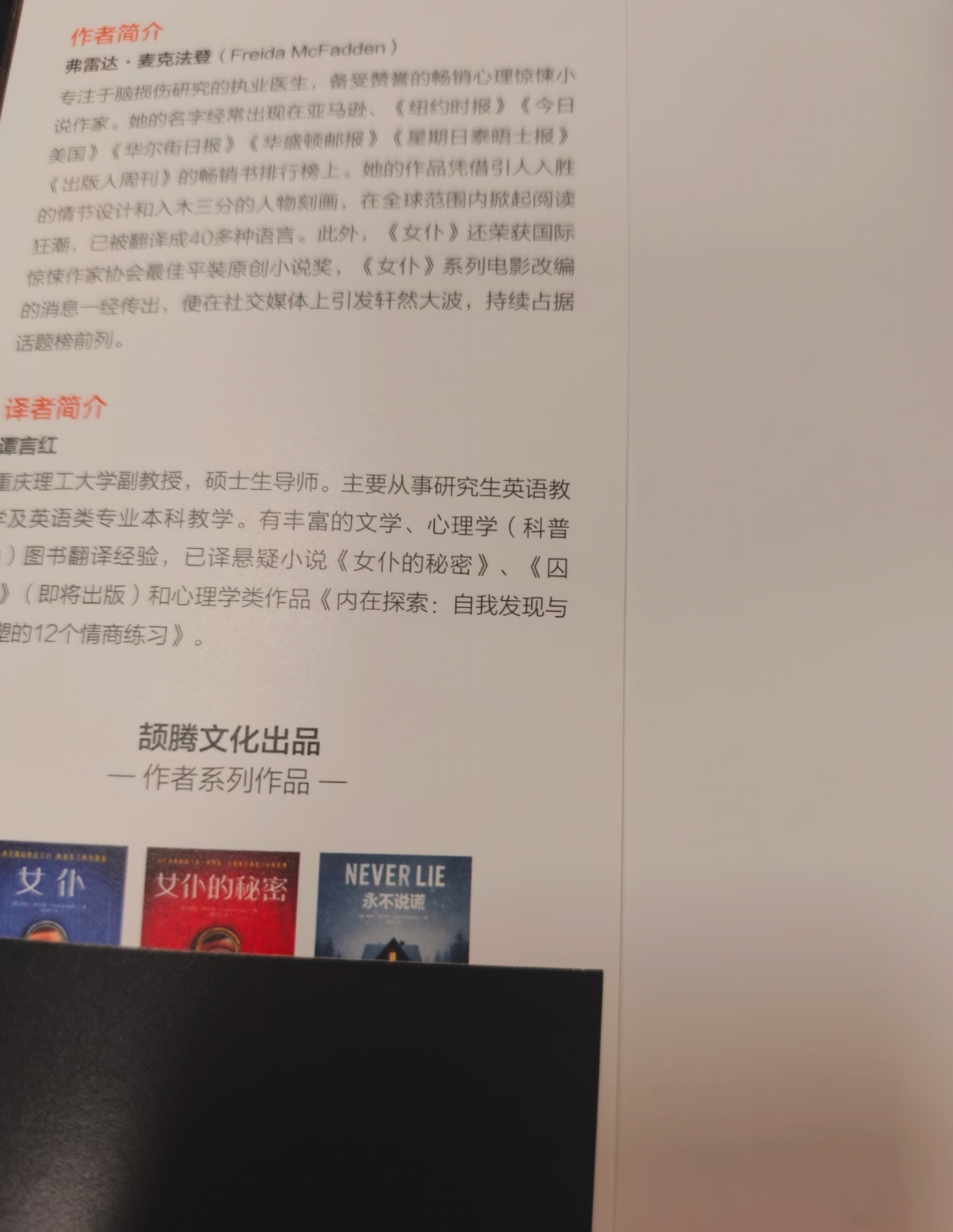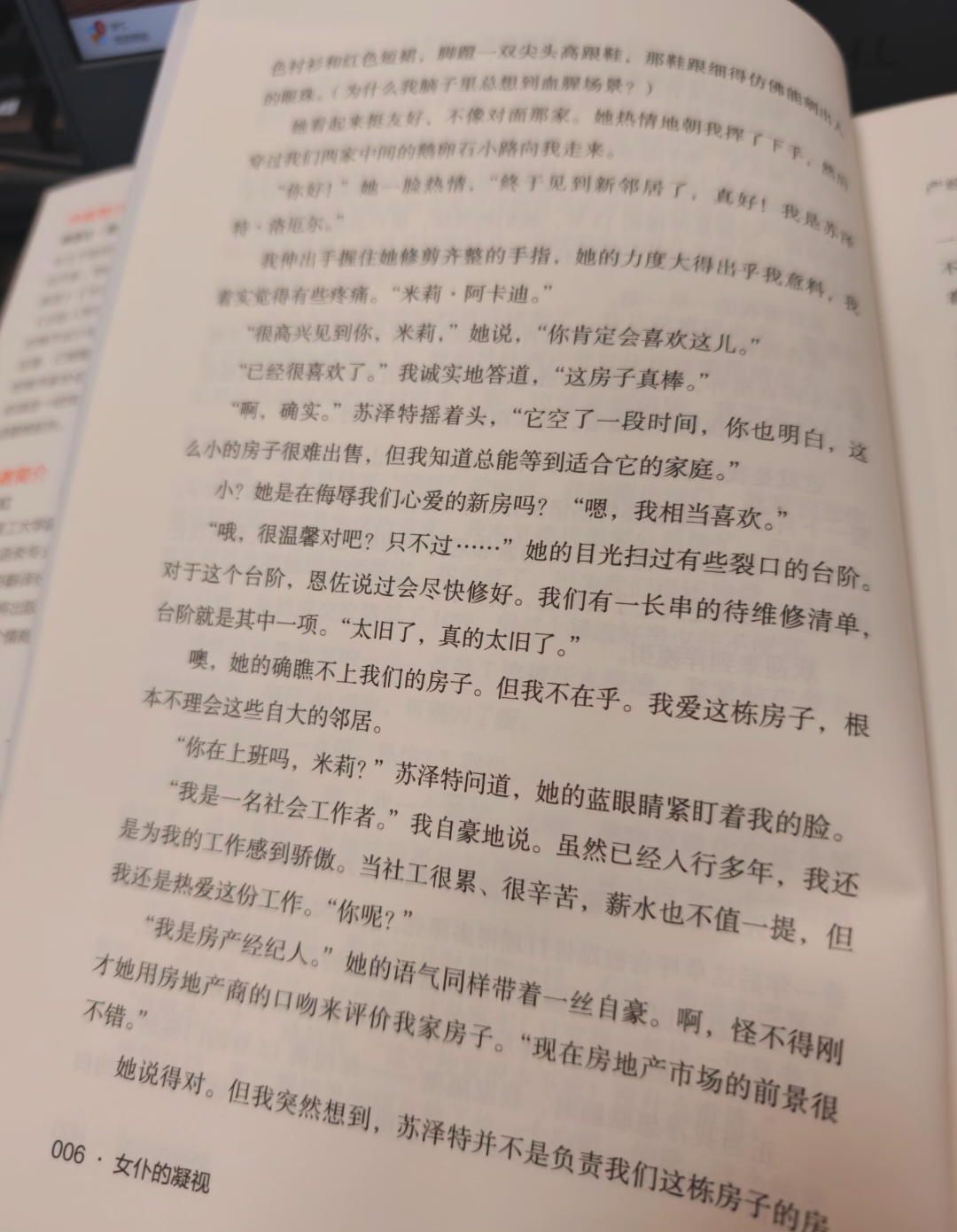 《女仆的凝视》:探索人类内心的复杂性 在悬疑惊悚小说的领域里,弗雷达·麦克法登的“女仆”系列凭借其扣人心弦的情节、跌宕起伏的反转以及对人性深刻的剖析,吸引着无数读者沉浸其中。作为该系列的第三部作品,《女仆的凝视》延续了前作的高水准,以一场充满谜团与反转的家庭噩梦,再次将读者卷入一场惊心动魄的悬疑之旅。 故事开篇便以极具冲击力的画面将读者瞬间拉入紧张氛围之中——满屋子触目惊心的血迹与沾满鲜血的双手,瞬间悬念拉满。 时间线跳转回三个月前,米莉一家满怀憧憬地搬入梦想中的学区房,本以为这是幸福生活的开端,却未曾料到这竟是噩梦的序章。新家没有窗帘的落地窗,这一看似平常的细节,实则暗示着不安与窥视,如同一只无形之眼,时刻注视着这个家庭的一举一动。 搬入新家后,一系列诡异的事件接踵而至。邻居贾尼丝看似好心的提醒,实则暗藏玄机,她对附近所有人的情况了如指掌,病态地指指点点,仿佛在暗示着什么不可告人的秘密;街对面的贾尼丝女士,更是行为举止怪异,让人不寒而栗。而米莉的丈夫恩佐,衬衫上莫名出现的血迹,更是让米莉心生疑虑,对丈夫产生了信任危机。与此同时,儿子莫名出现的狂躁行为、账户里莫名消失的存款,种种奇怪的事情如同阴霾一般笼罩着这个家庭,让米莉为之抓狂。 随着剧情的推进,一个又一个谜团逐渐浮出水面。邻居乔纳森的离奇死亡,凶器上刻有恩佐名字首字母,这一线索将恩佐推向了风口浪尖,让米莉对丈夫的怀疑愈发加深。而在探索真相的过程中,米莉发现,看似平凡的家庭背后,隐藏着无数不为人知的秘密。 《女仆的凝视》最为精彩之处,莫过于其层层反转的情节设计。作者巧妙地运用多线叙事和第一人称视角交替的方式,营造出一种悬疑惊悚的恐怖氛围,让读者在阅读过程中始终保持着高度的紧张与好奇。 每一个看似无关紧要的细节,都可能是作者精心设下的伏笔,为后面的故事发展、人物行动和案情推理埋下重要的线索。当读者自以为已经接近真相时,剧情却突然急转直下,给出一个意想不到的反转,让人猝不及防。 除了精彩的情节反转,《女仆的凝视》还深入探讨了人性的复杂与黑暗。 《女仆的凝视》是一部不可多得的悬疑佳作。它以精彩绝伦的情节反转、深刻细腻的人性剖析以及紧张刺激的悬疑氛围,为读者呈现了一场视觉与心灵的盛宴。 如果你热衷于悬疑元素,而且想感受女性力量的魅力,那么这本书绝对是你的不二之选。 翻开它,你将沉浸在一个充满谜团与反转的世界里,与主人公一同揭开隐藏在暗处的秘密。