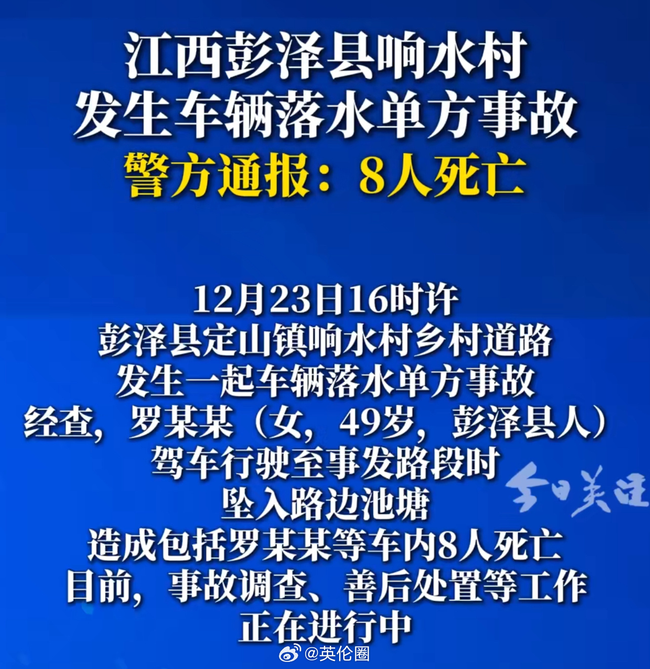【江西发生落水事故致8死】【49岁女子驾车坠入池塘致8死】江西省彭泽县公安局12月24日发布警情通报称,2025年12月23日16时许,彭泽县定山镇响水村一处乡村道路发生车辆落水单方事故。 通报显示,罗某某(女,49岁,彭泽县人)驾驶车辆行驶至事发路段时,车辆坠入路边池塘。接警后,公安、消防、医疗等部门第一时间赶赴现场开展救援。 经核实,此次事故共造成车内包括驾驶人罗某某在内的8人死亡。目前,事故原因调查及善后处置工作正在进一步进行中。
