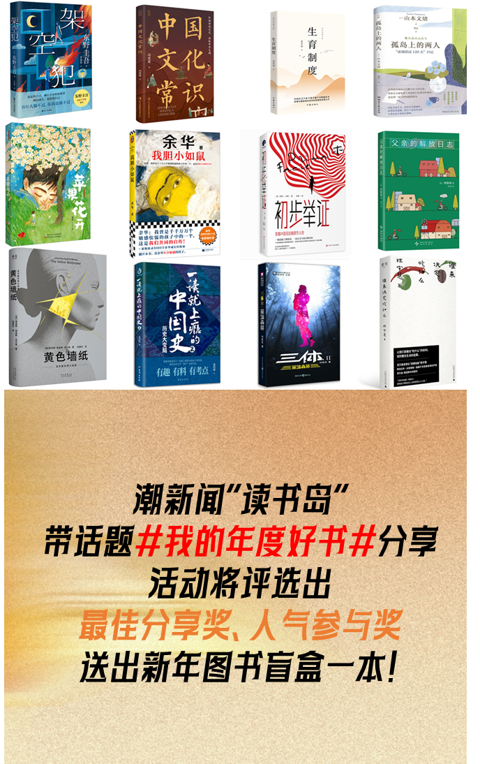 潮新闻X火把知识2025年度书单来了!分享你的年度好书,赢取新年图书盲盒 扫描图片二维码或点击“悦视听”阅读版块顶部轮播位,查收“2025年度书单”! 愿你读得尽兴,也愿你乐于分享。或许你钟爱的那一本书,正是别人翘首以盼的光。 即日起-2026年1月31日中午12点,带话题#我的年度好书# ,分享2025年你最喜欢的一本书,附上你喜爱的理由,发布在潮新闻“读书岛”圈子,我们将评选出10名用户送出新年图书盲盒一本。 其中最佳分享奖5名,由主办方根据内容质量进行评选;人气参与奖5名,截至活动结束,内容点赞量前5名的用户可获得该奖项。 (两个奖项不重复获取领取,如发现作弊,将取消参赛资格) 盲盒图书包含《架空犯》《谁来决定吃什么》《黄色墙纸:吉尔曼女性小说选》《生育制度》《父亲的解放日志》《我胆小如鼠》《初步举证》《孤岛上的两人》《一读就上瘾的中国史2》《三体(Ⅱ黑暗森林)》《苹果花开》《中国文化常识》《亲爱的小狗》等品质好书,赶紧来参与吧!