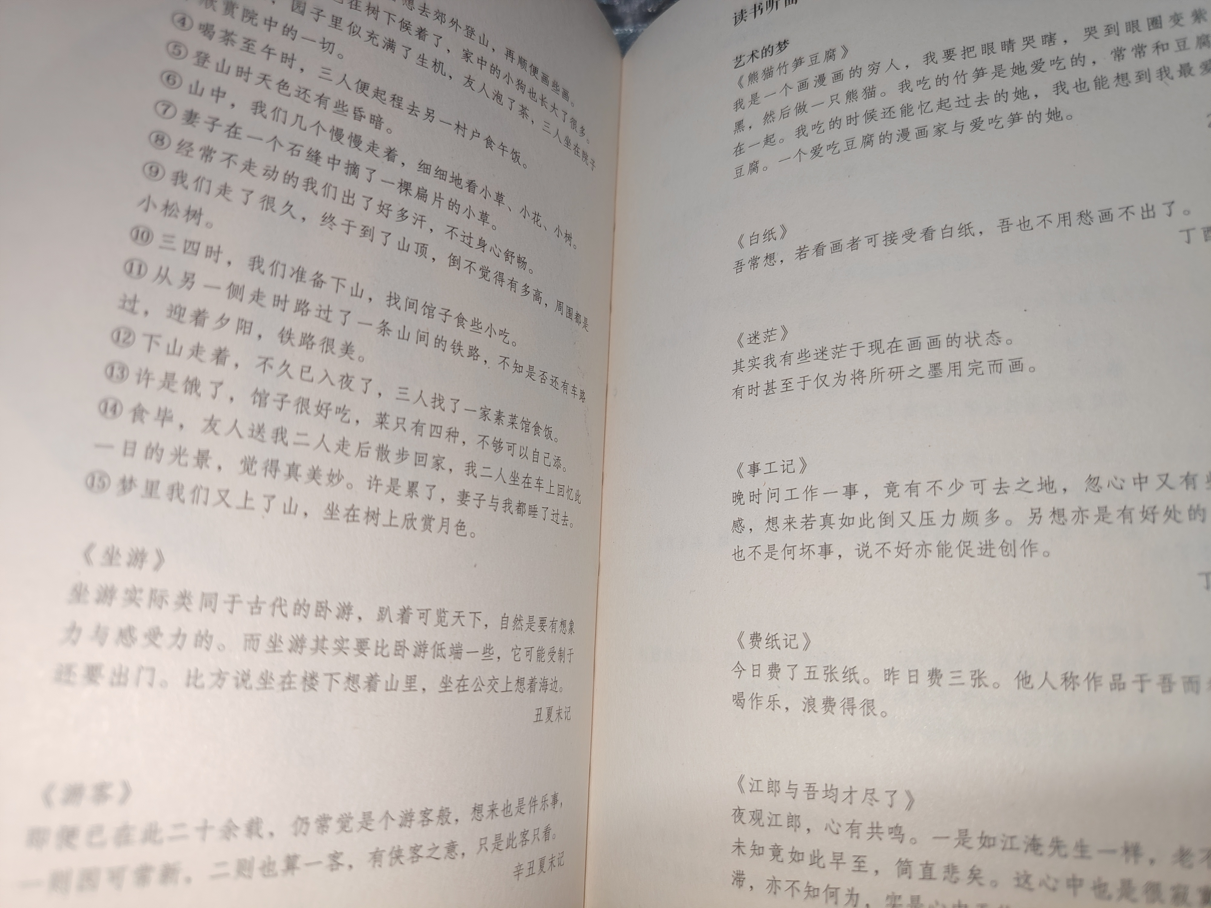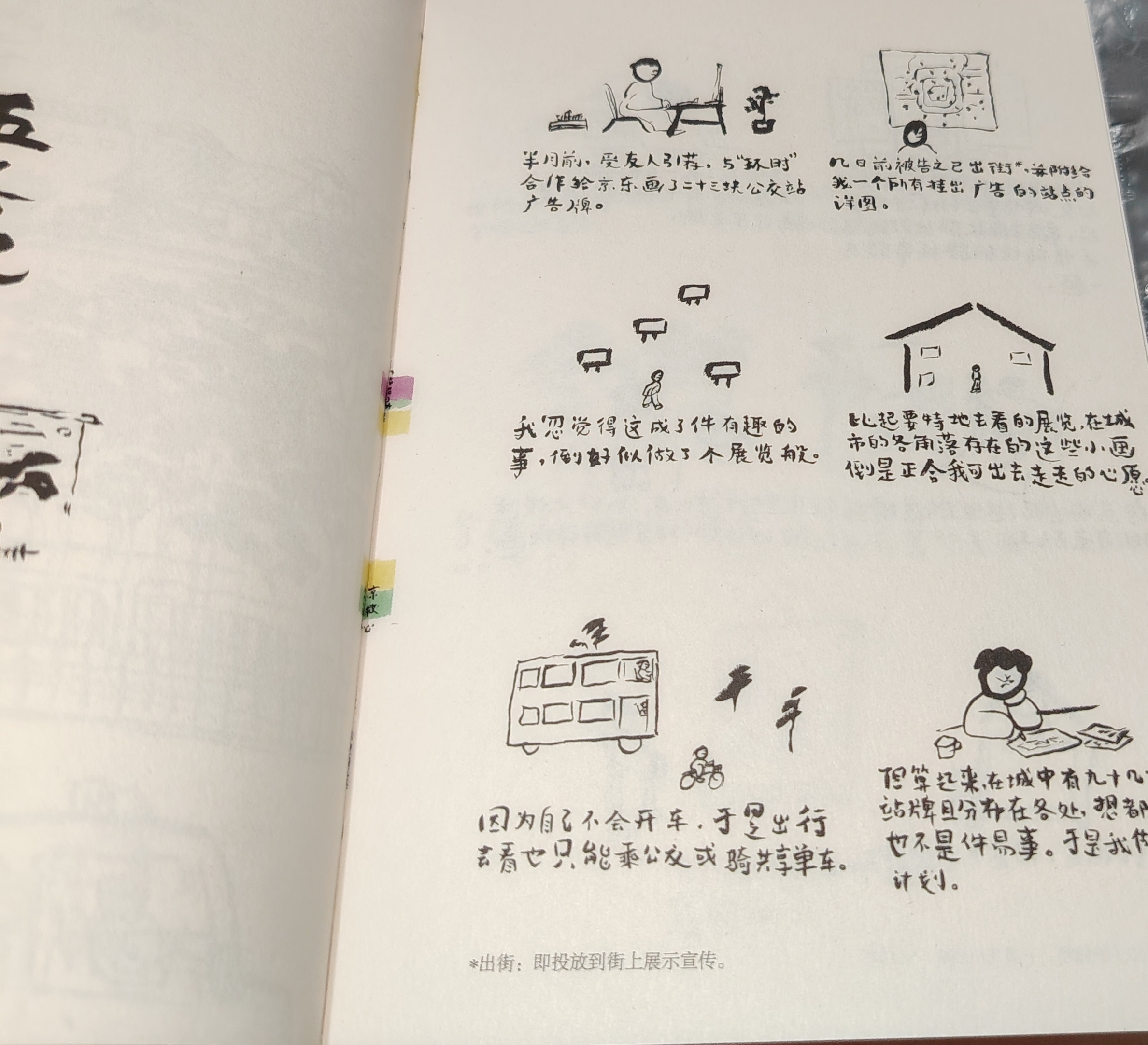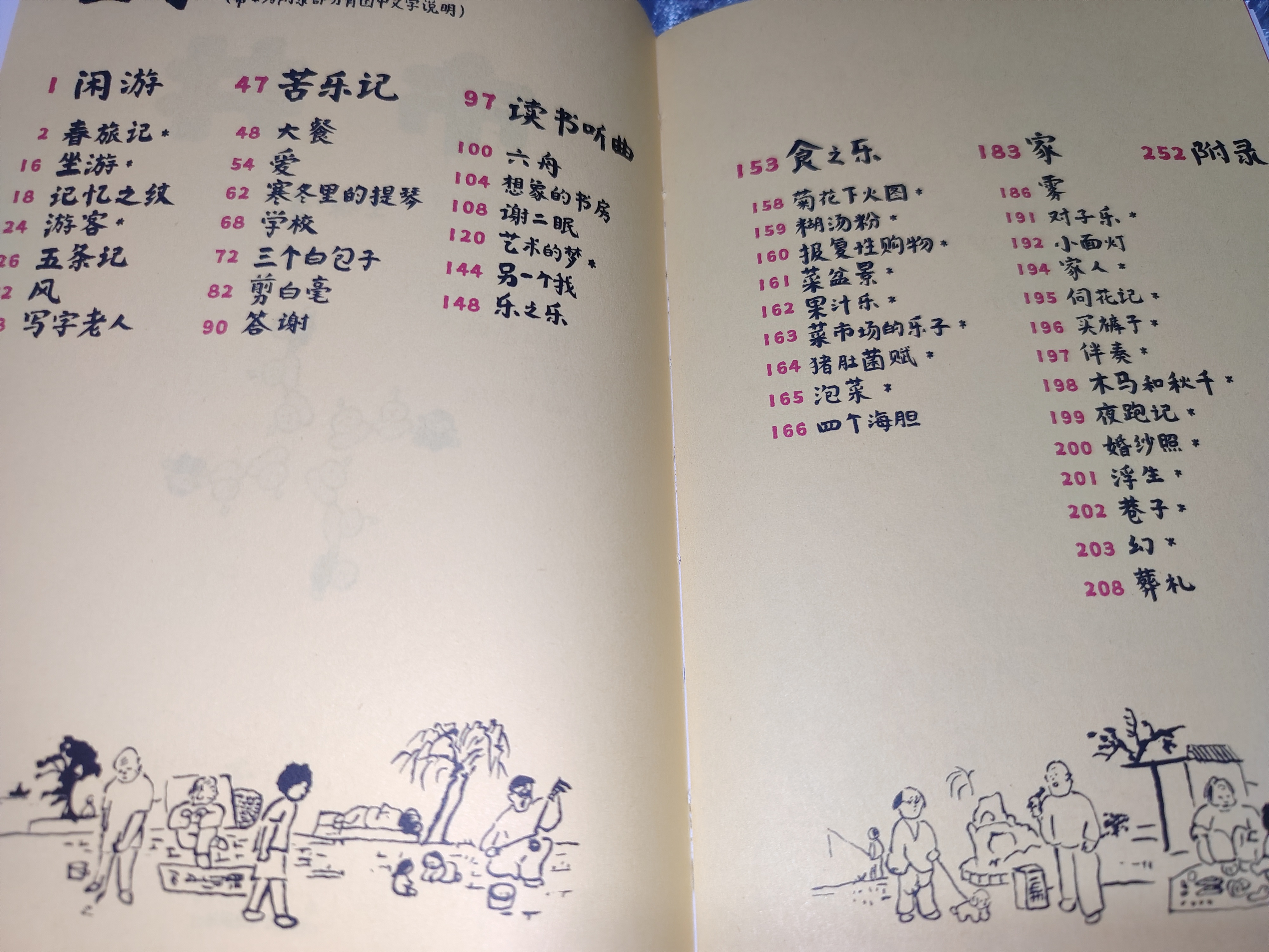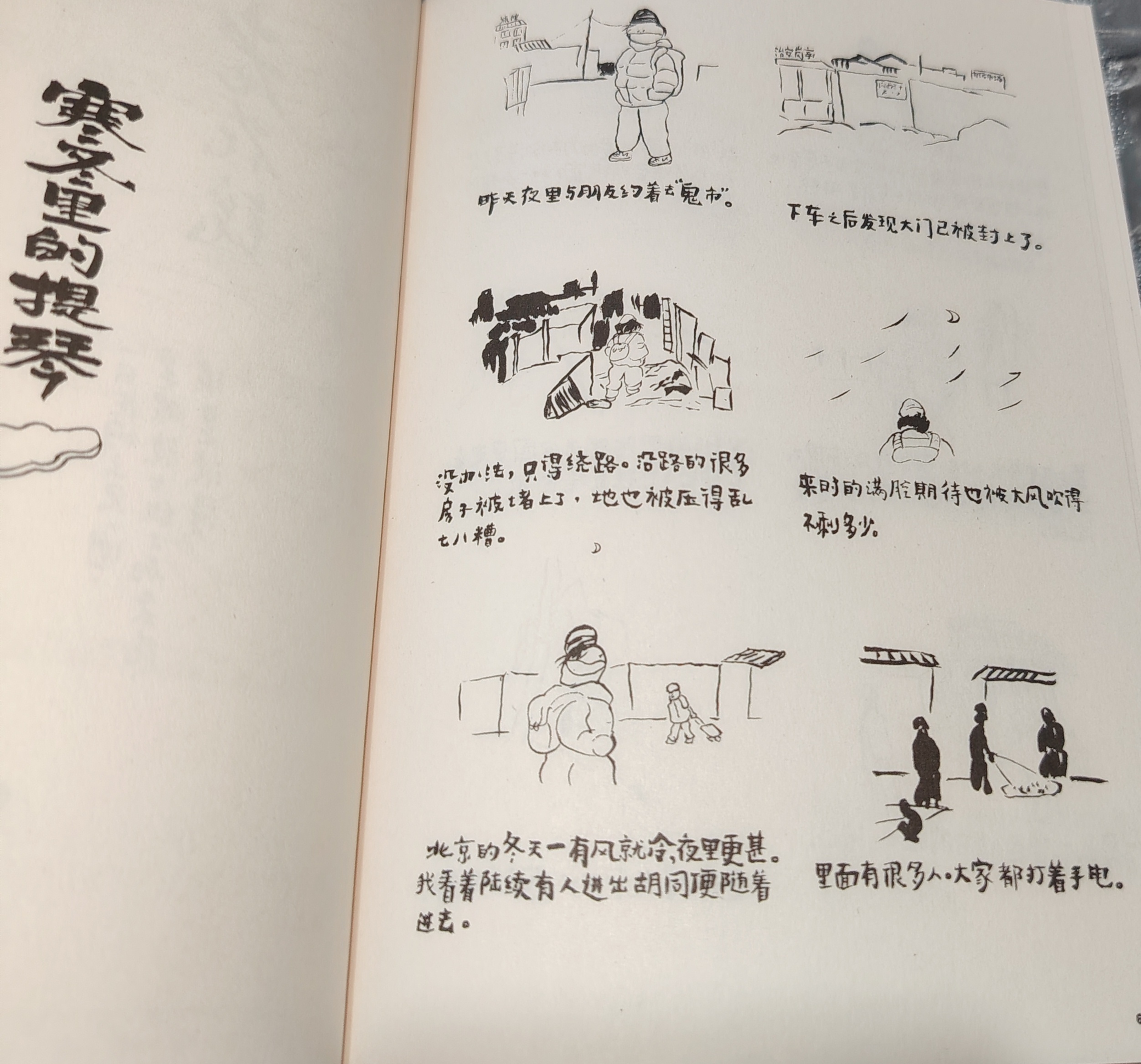 这是北京朋友送的一本漫画书!是王烁老师亲签的《市井》(很随笔的风格了)。 说实话我的阅读漫画经历还停留在《爆笑校园》,乍一看到这个排版风格就很惊讶……嗯!大概就是“还能这样排版”,感觉像是一幅幅书画品,这本书限制王老师的绘画发挥了。 目录很有“手写菜单”的感觉,很接地气。虽然书里也有“正经字”(寻常书籍的排版)出没,但还是手写字更不错哈,有种看王老师私人日记的感觉(不拘)。内容其实也很像日记,不过这不止是王老师的日记,更是他与来自市井的人们共同的故事——拉提琴者、“学校”篇里的少年、“三个白包子”篇的爷爷……也正如旁白(一行行工整的说明反倒像剧目里面的旁白了)里面所说:“有段时间,我常常出门去看人,看着他们的相貌举止,想象他们究竟是做什么的,他们经历了什么,然后将这些想象记录下来,变成一篇篇故事……它们有些离我很近,有些离我很远……” 如果觉得感兴趣的友友可以试试读上一本,不拘纸质(这样一本漫画,纸质阅读更佳哦)或是线上,给日常生活增添一抹幽默不拘,阅见王烁老师眼中的市井。