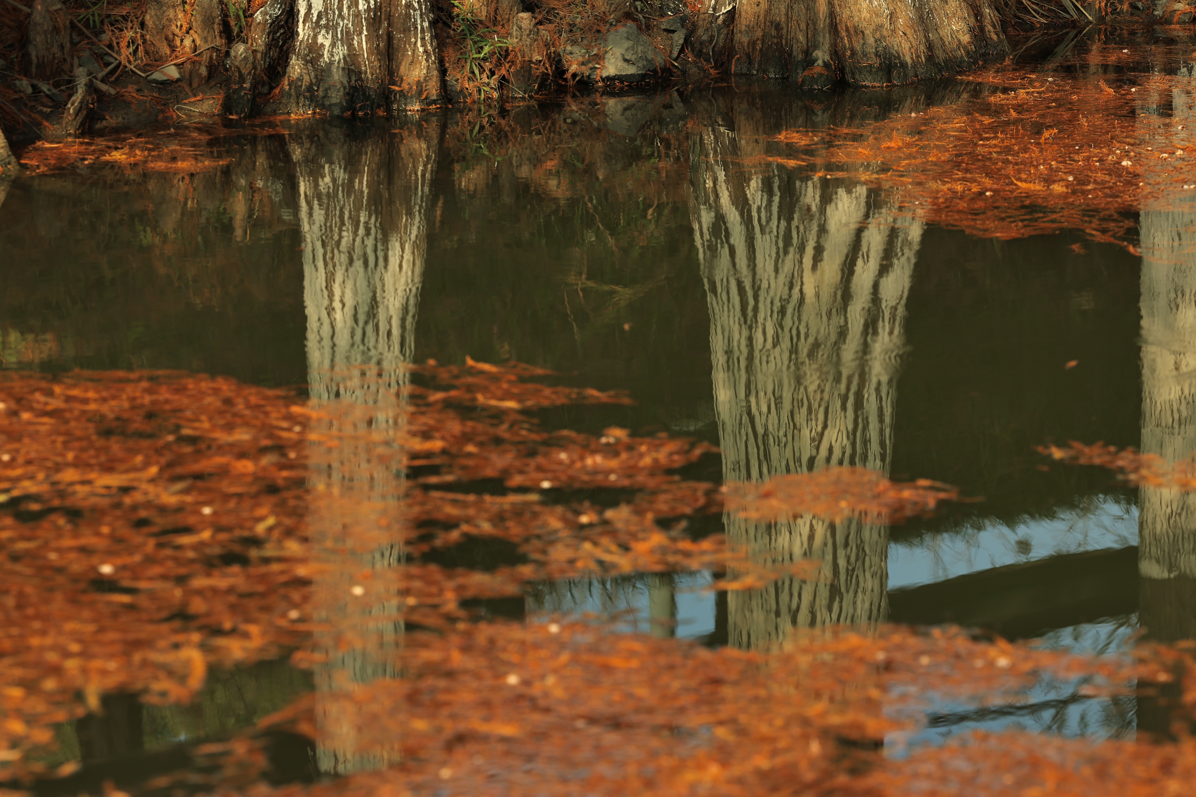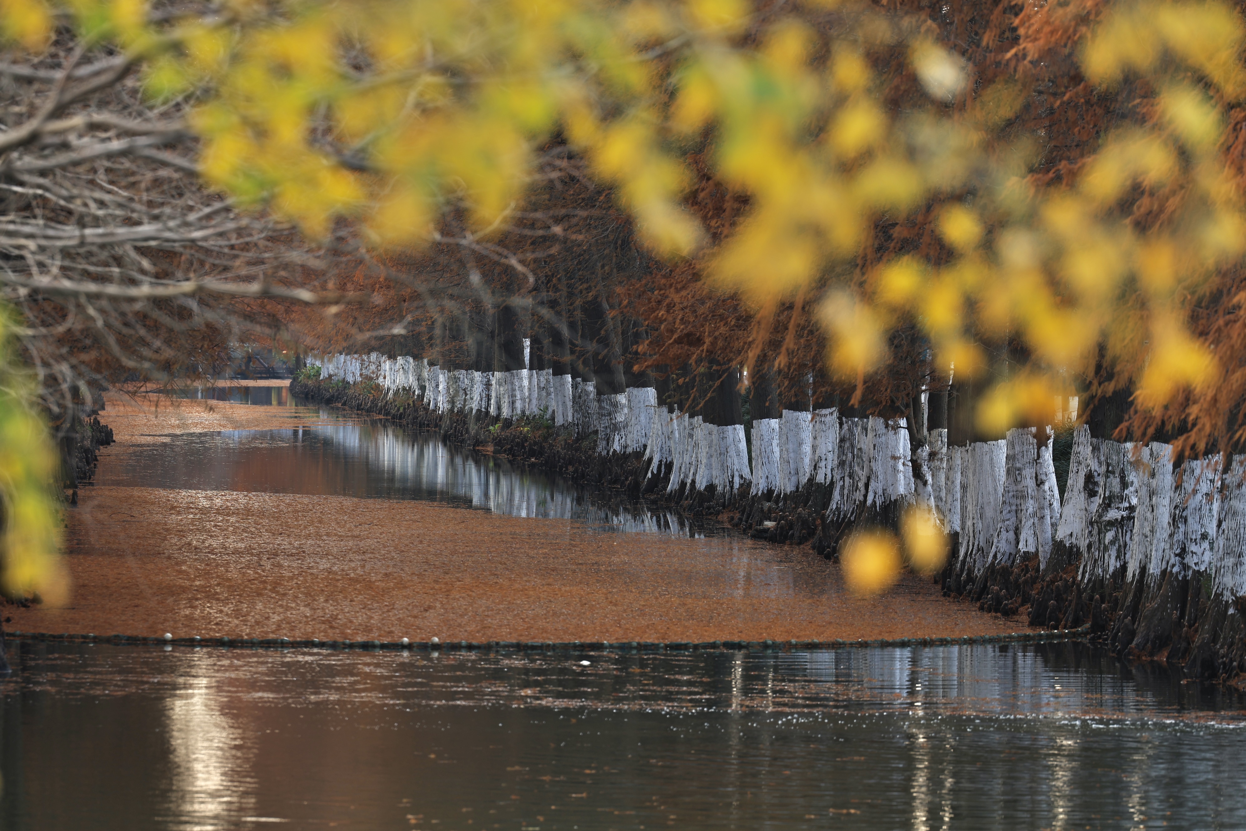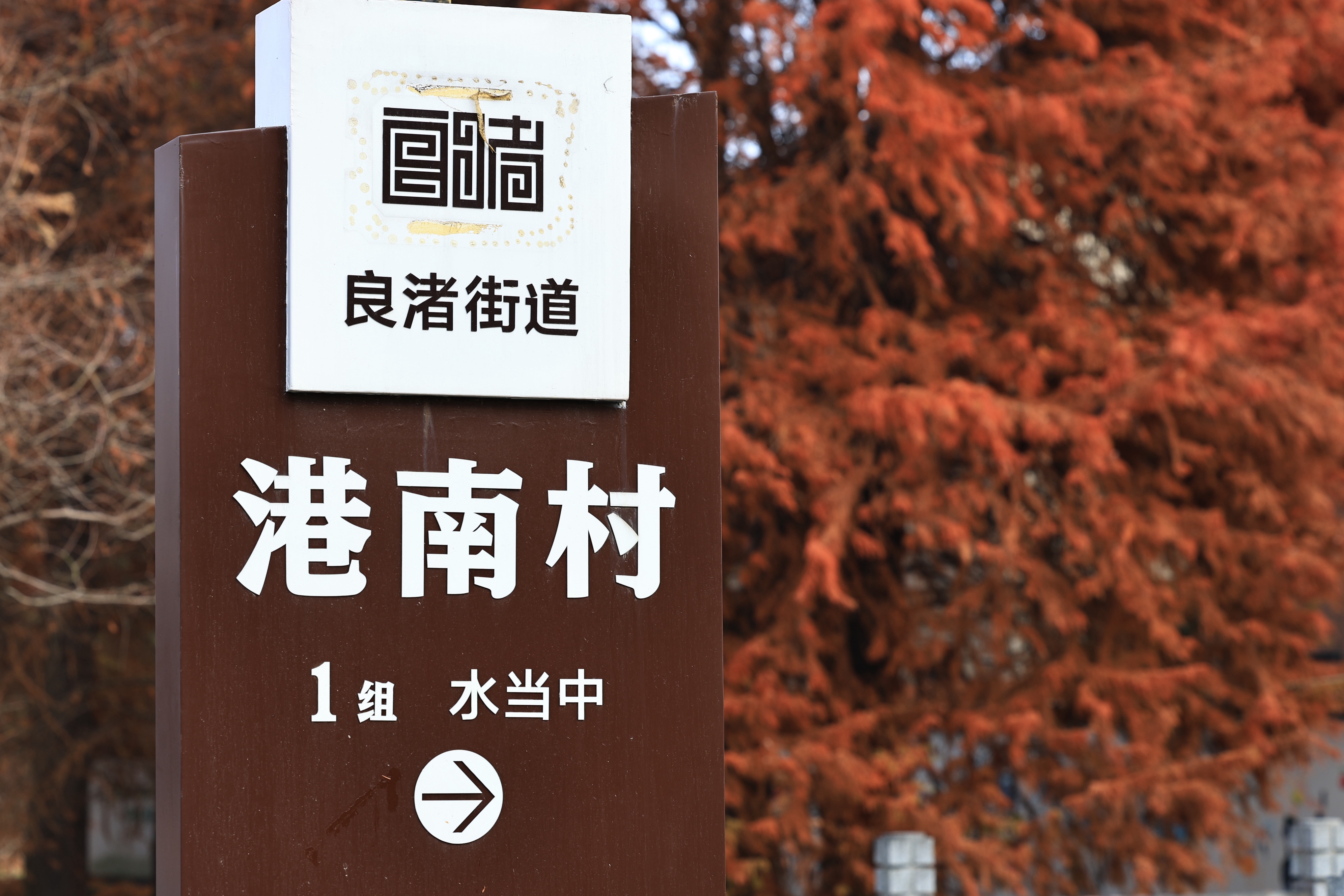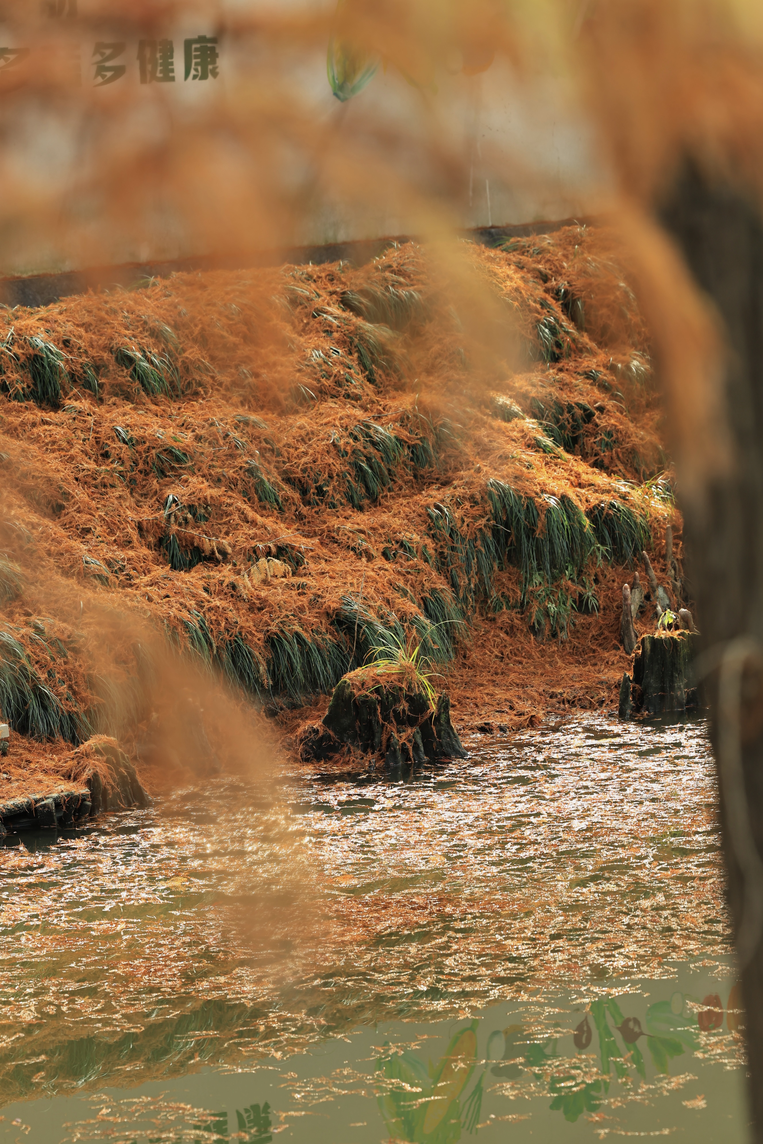 良渚村里的水杉叶,一半在树上,一半在水里。