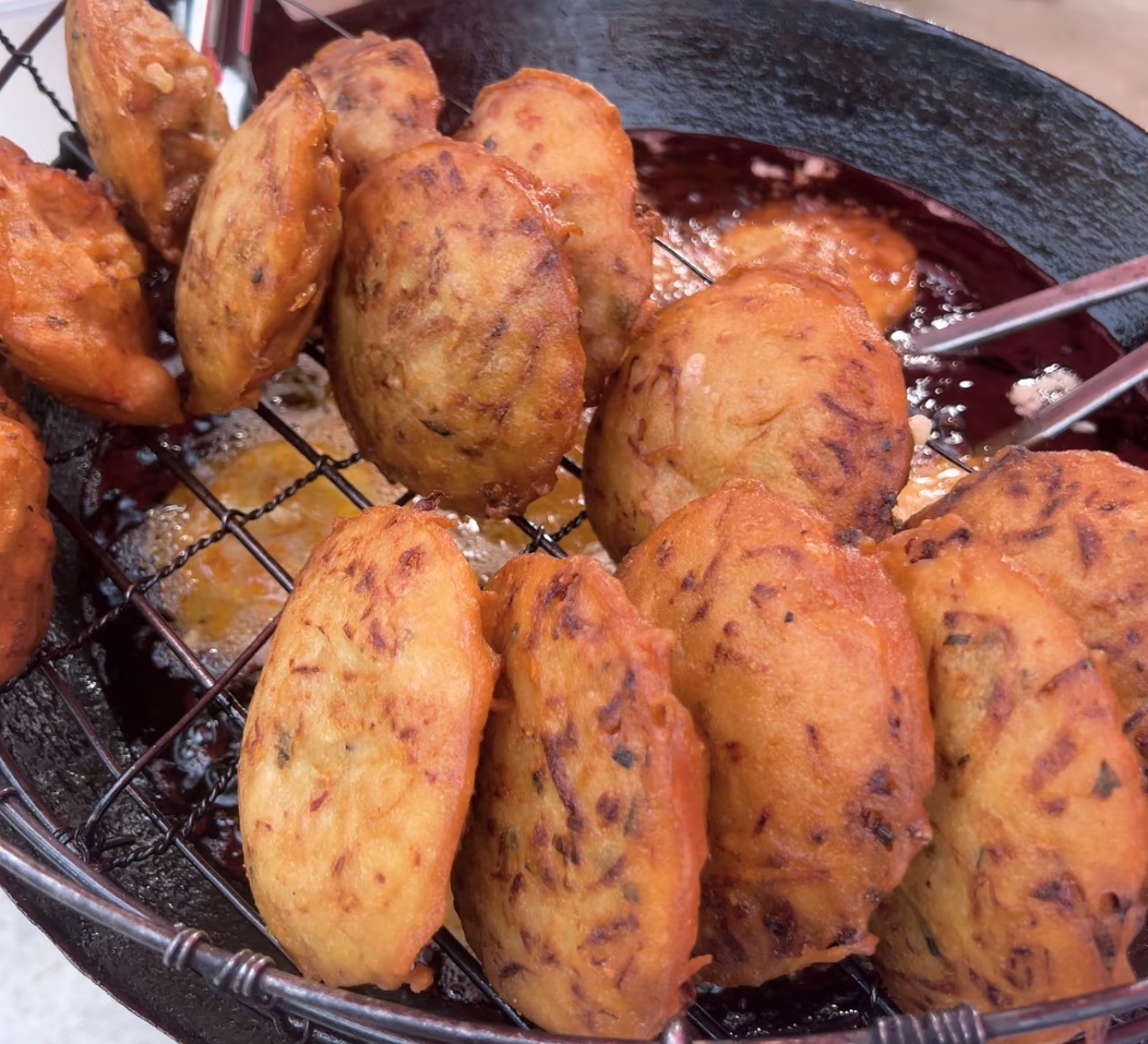 灯盏糕,是温州超火的名小吃,是我吃过中最好吃的。 走在温州的街头,路边小摊随便买一个都能好吃到起飞。 这里的灯盏糕是由萝卜丝、鸡蛋、猪肉一起油炸的美食。 一口酥脆飙汁的灯盏糕,一定要现炸现吃,刚出锅的灯盏糕,咬一口“咔嚓” 一声,酥到掉渣,滚烫的萝卜丝、鸡蛋混着肉汁的香味,幸福感瞬间爆棚!