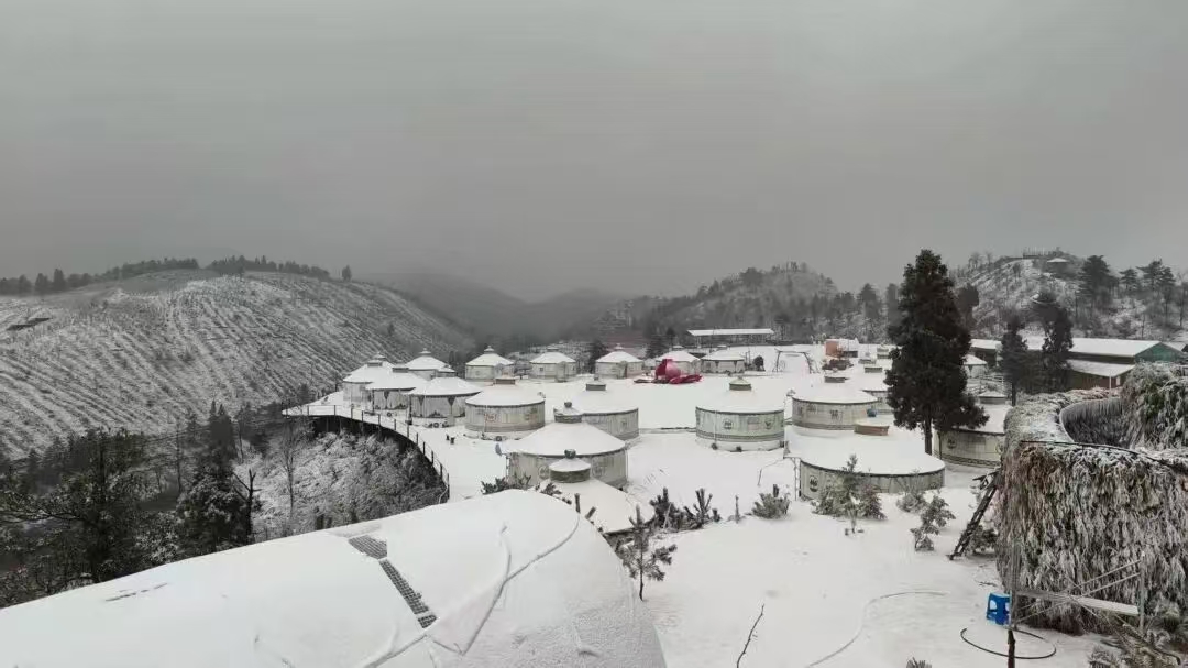 雪落梅花山,云雾轻拢松林间。圆顶如星点高原,雪径引人入画来。