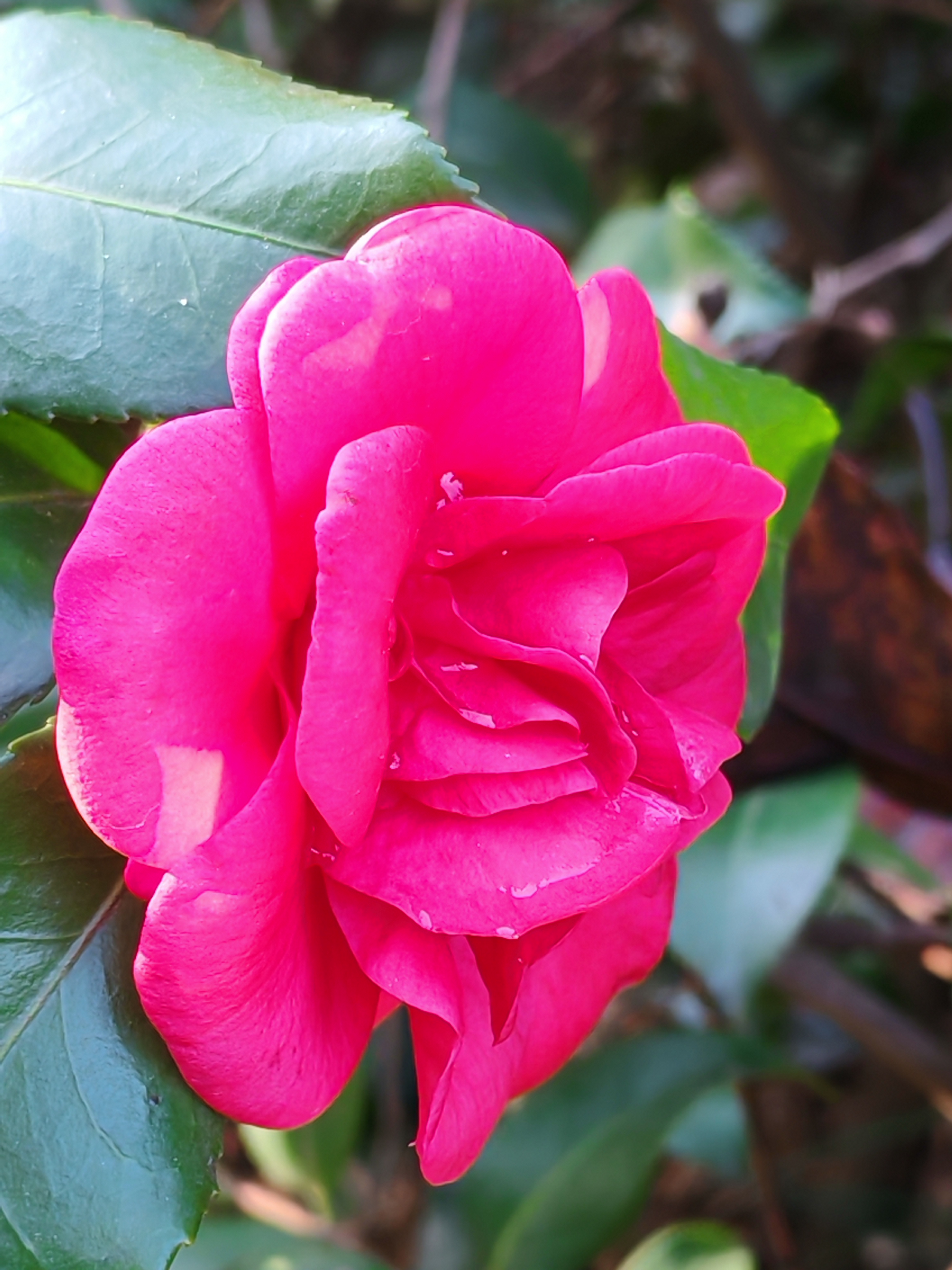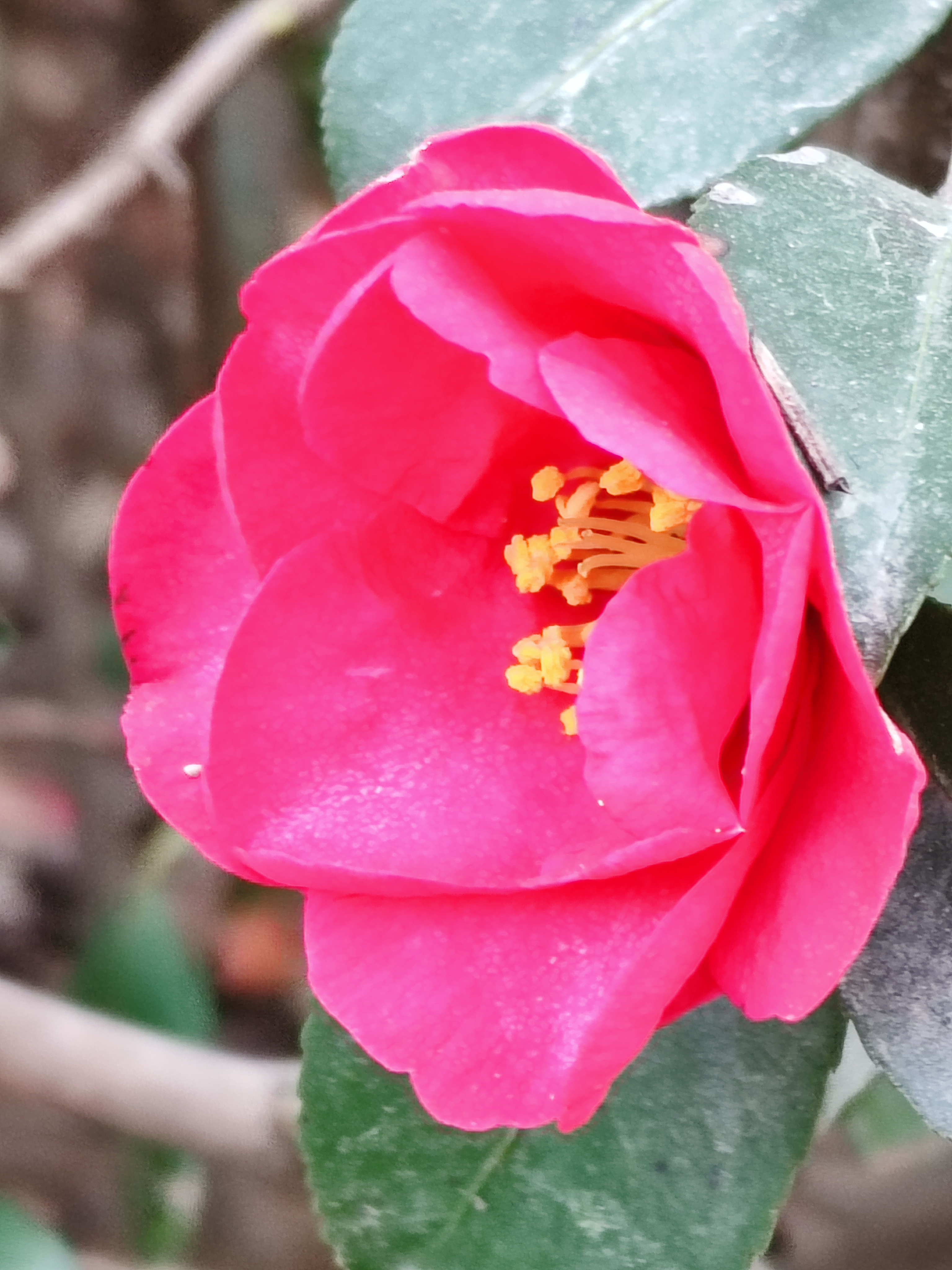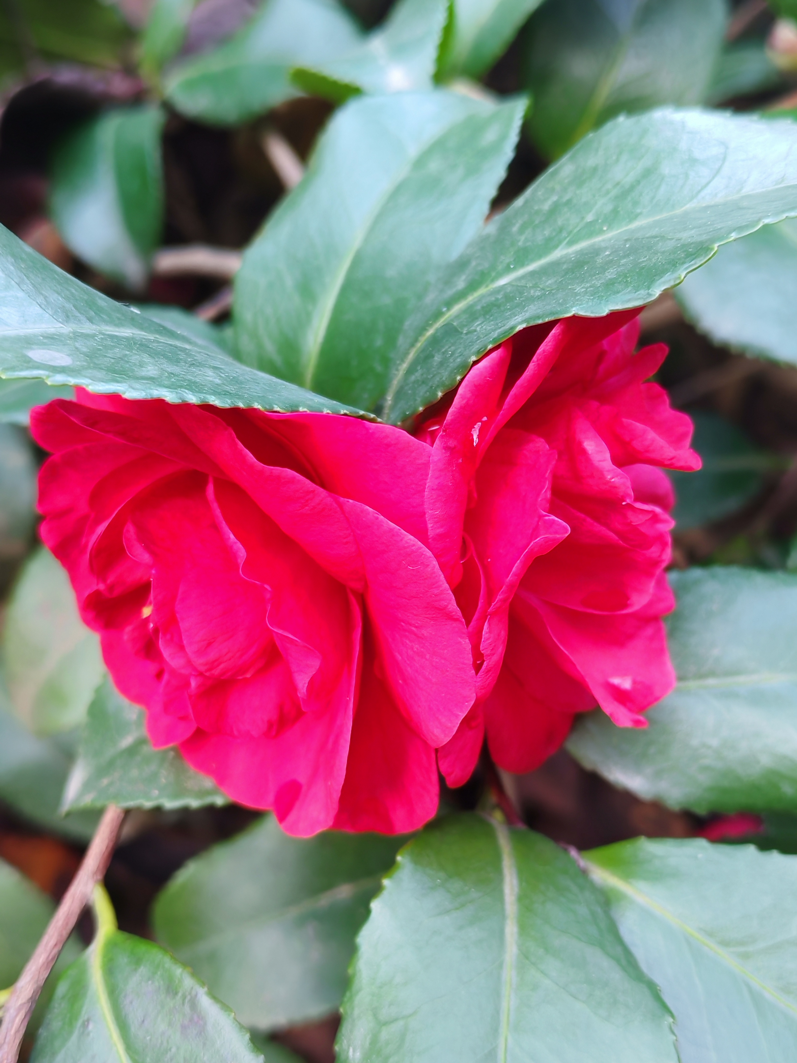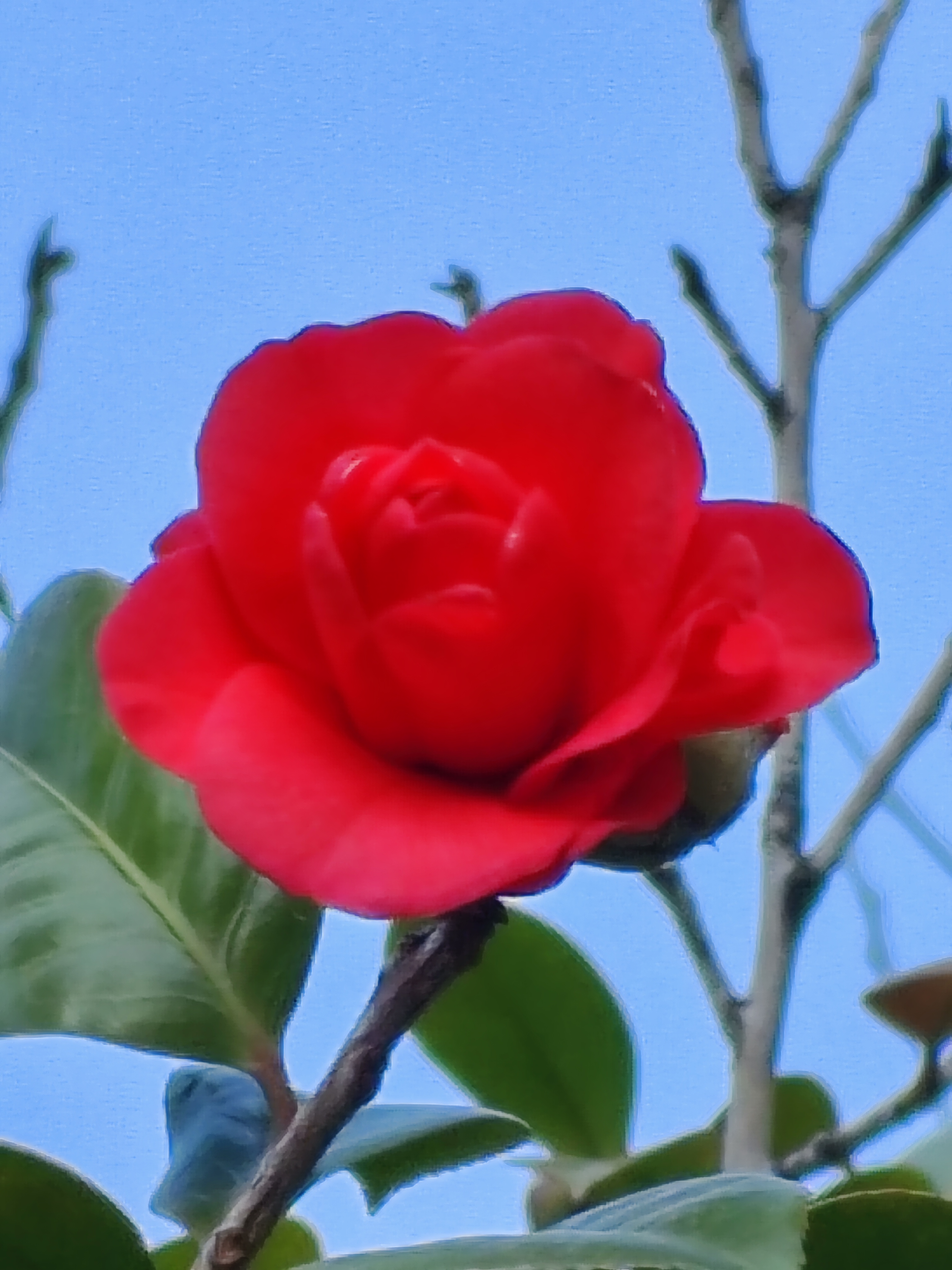 山茶花 冬月千山万壑眠, 疏枝斜影落溪闲; 绿林层暖疑春色, 无助蜂蝶傲雪颜。