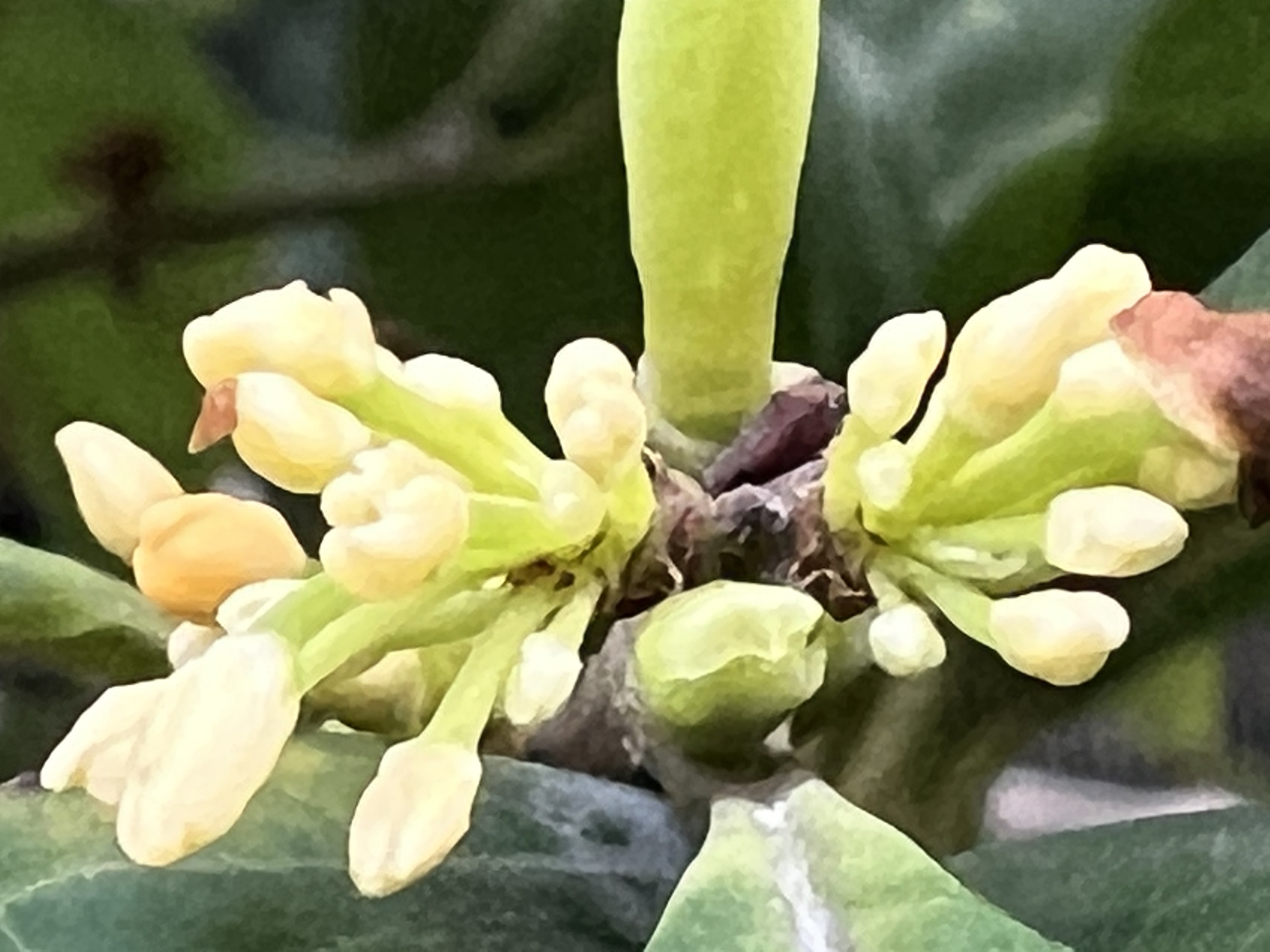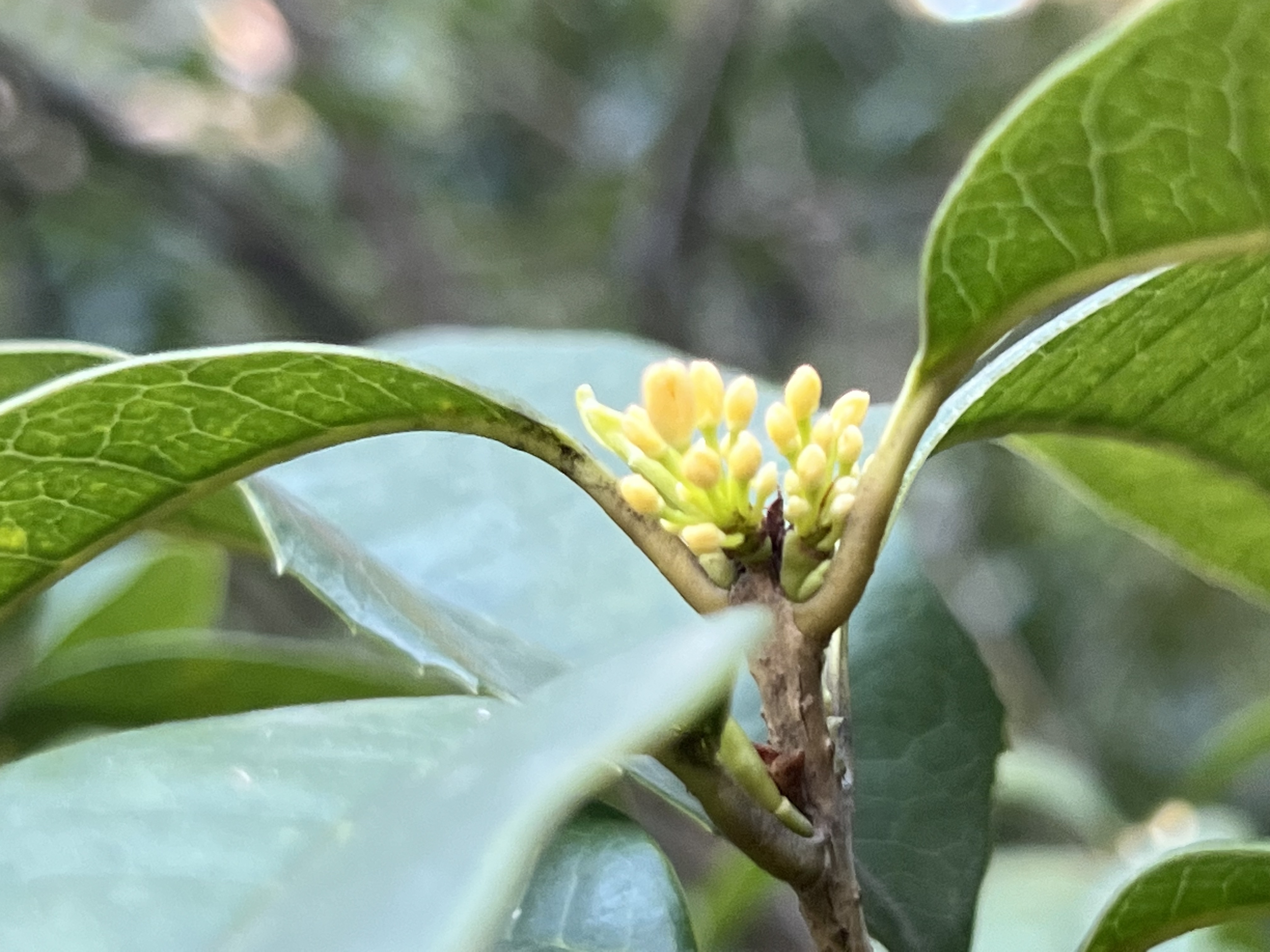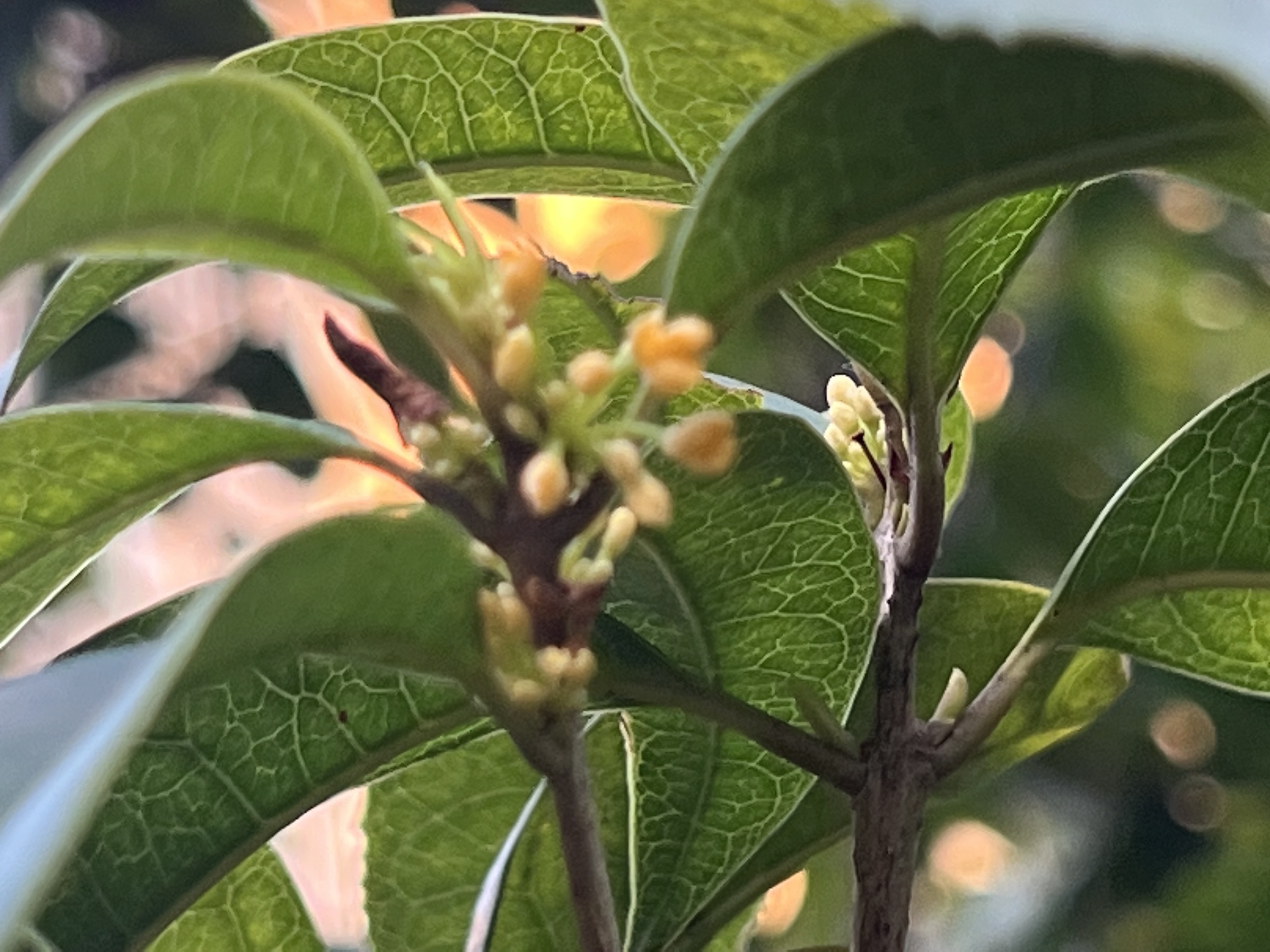 小区漫步,清冷的空气中,闻到一股花香,发现桂树花开金黄,想起郁达夫的文章《迟桂花》。