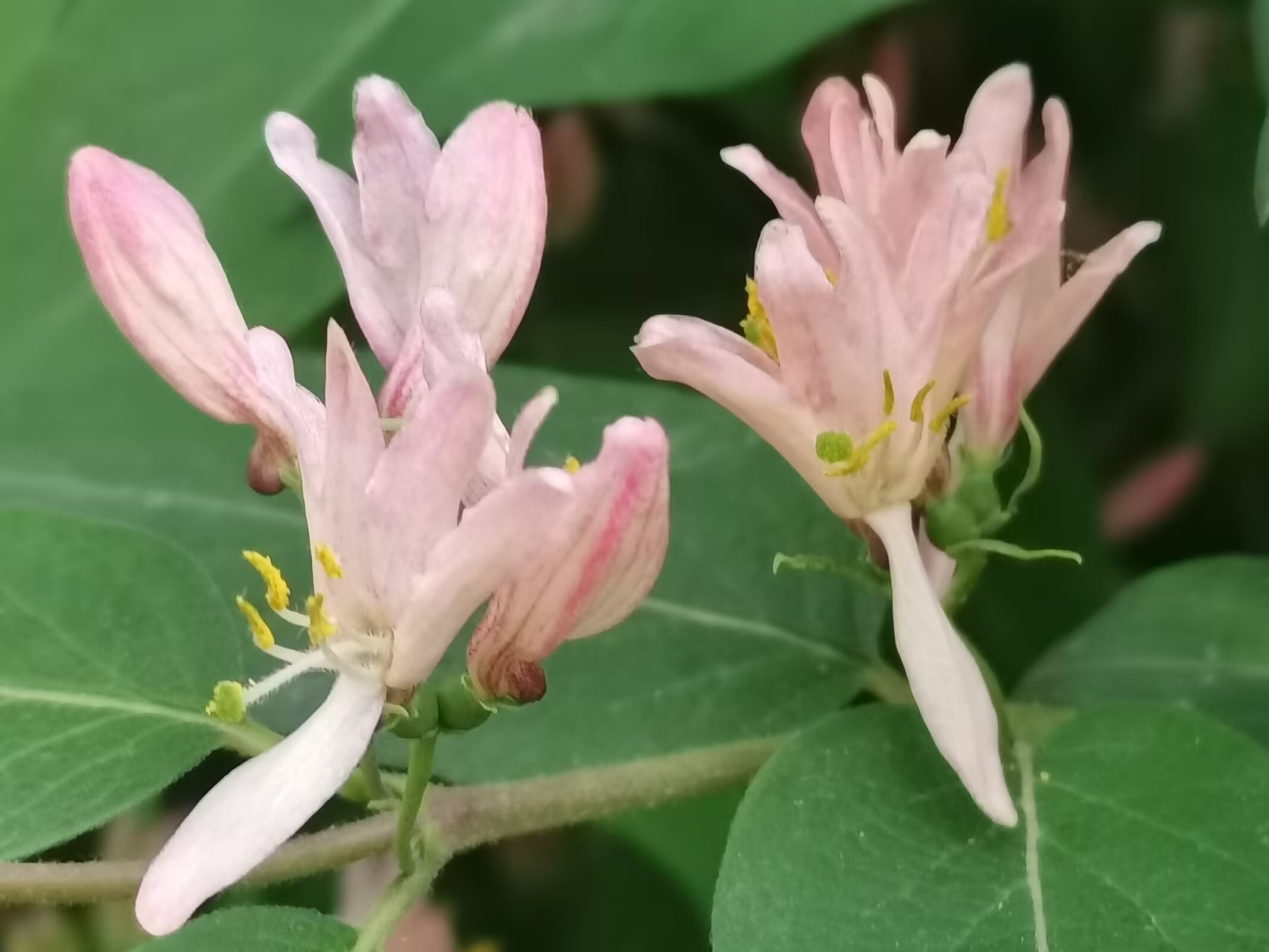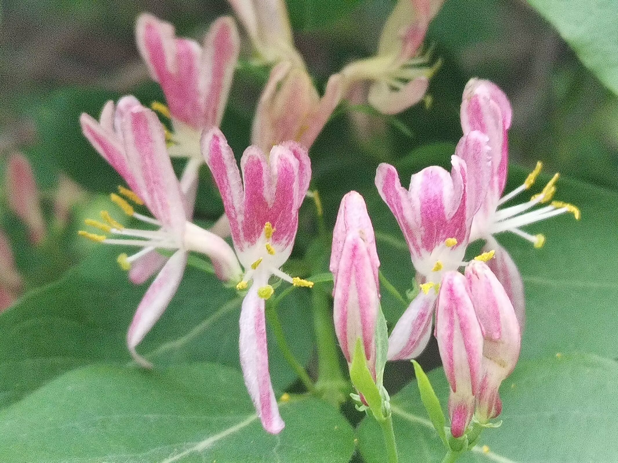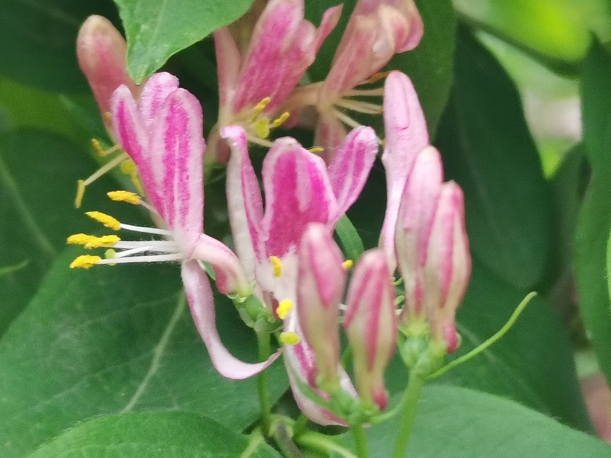 金银木,不是金银花哦。 金银木(学名:Lonicera maackii,又称金银忍冬)是忍冬科忍冬属的落叶灌木,高可达6米,原产于东亚,在我国南北各地广泛分布。 花期为4-6月,花朵初开时多为白色或粉色,后逐渐变为黄色或淡红色;果期8-10月,结红色球形浆果(浆果有毒,不可食用) 它适应性强,耐寒、耐旱、耐贫瘠,常作为园林绿化树种,也能吸引鸟类,兼具观赏与生态价值。 金银木与金银花的核心区别 1. 植株形态 - 金银木:直立灌木,枝干挺拔,无攀援特性。 - 金银花(学名:Lonicera japonica,又称忍冬):常绿/半常绿藤本,茎干细长,需依附支撑物攀援生长。 2. 花果特征 - 花色:金银木花色从白/粉转黄/淡红;金银花从白色转金黄色。 - 果实:金银木为红色成簇浆果;金银花为黑色稀疏浆果。 3. 叶片与用途 - 叶片:金银木叶片宽大厚实;金银花叶片狭长纤薄。 - 用途:金银花的花是传统中药材,可泡茶;金银木的花药用价值低,主要作观赏。