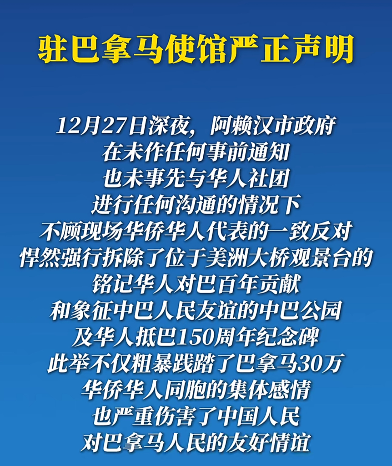 巴拿马总统表态【中方要求彻查中巴公园拆除事件】巴拿马总统要求调查拆除事件,中国驻巴拿马大使馆通报:12月27日深夜,阿赖汉市政府未作任何事前通知、也未与华人社团沟通,强行拆除了位于美洲大桥观景台的中巴公园及华人抵巴150周年纪念碑。 中方表示,对此“极度震惊、强烈愤慨并坚决反对”,认为这一举动严重伤害当地30万华侨华人的感情,也损害了中巴友好。 大使馆指出: — 公园与纪念碑是巴拿马国家财产,也是中巴两国人民的共同精神财富; — 华社和中方此前多次表达愿意出资修缮、协商解决,但未获回应; — 拆除行为已经引发巴中央政府与社会各界高度关注。 中方向巴方提出两项明确诉求: ① 对拆除事件进行彻查,依法追究责任; ② 在原址修复中巴公园与纪念碑,并与华人社团充分协商。 据新华社消息:巴拿马总统穆利诺及多部门随后公开表态,明确谴责阿赖汉市政府的行为,强调纪念碑具有重要历史意义,并责令在原址立即修复,同时要求有关方面启动调查并与华人社群及文化部协调推进相关工作。