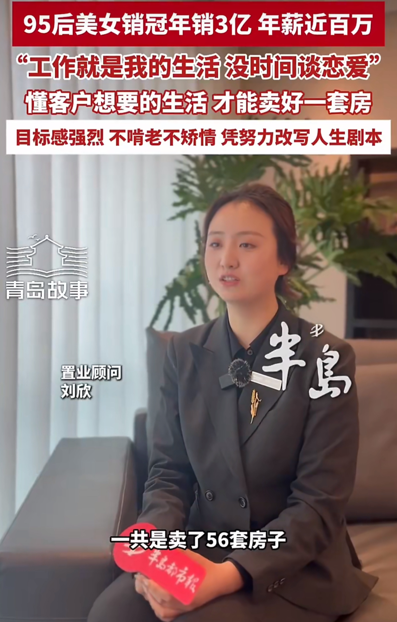 【95后美女销冠年销3亿年薪近百万】12月25日,山东青岛一位95后置业顾问刘欣引发关注。她表示,过去一年共卖出56套房,总销售额超过3亿元,年薪接近百万元。 刘欣称,自己可能“天生适合做销售”,关键在于理解客户想要的生活,才能把房子卖好。她评价自己目标感强烈,“不啃老、不矫情,希望靠努力改写人生剧本”。 谈及个人生活,她坦言工作已占据全部时间,“没时间谈恋爱,恋爱不是必需品”。(海报新闻 )