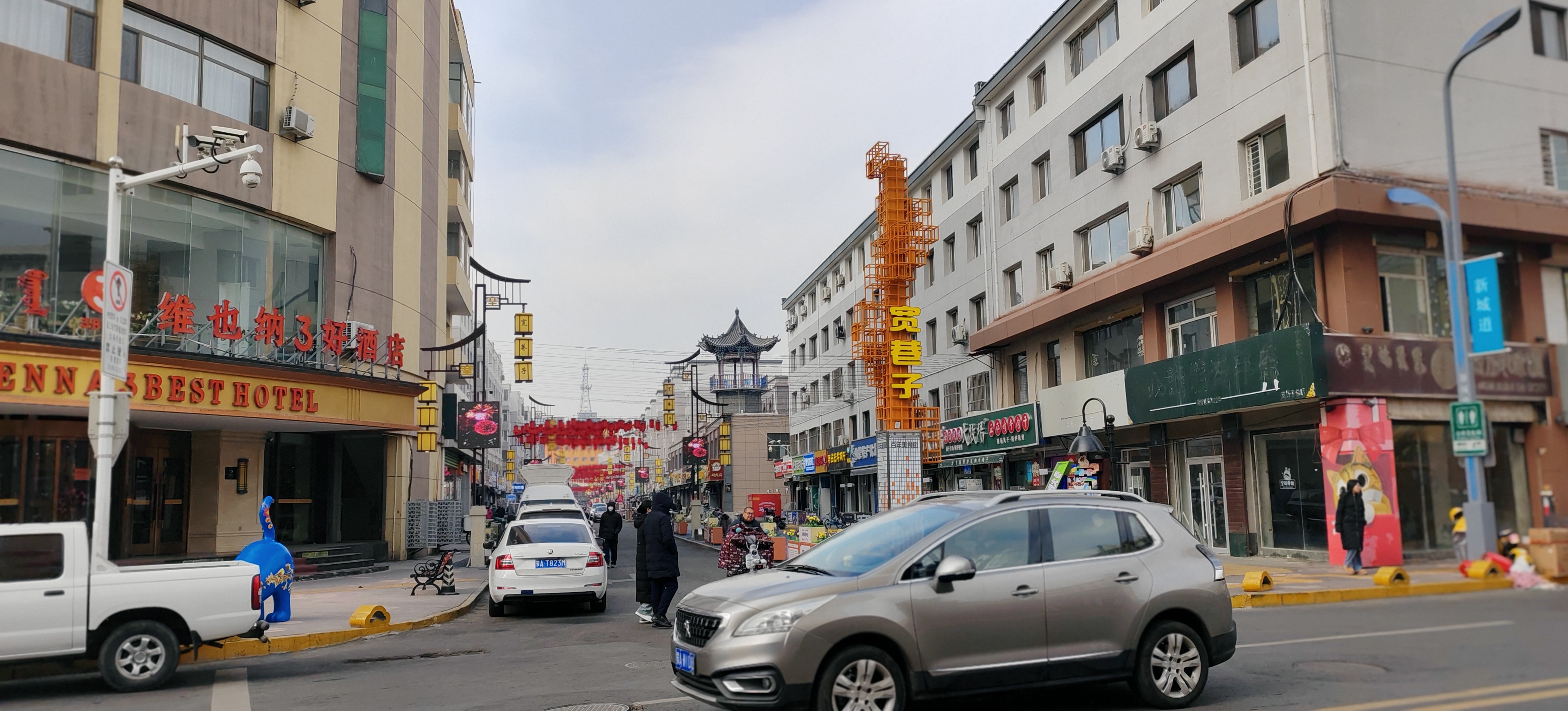 伊宁街头扫街,红色灯笼下,SUV与蓝色人偶同框,民族风情混搭春节味儿,冬日citywalk超有感!