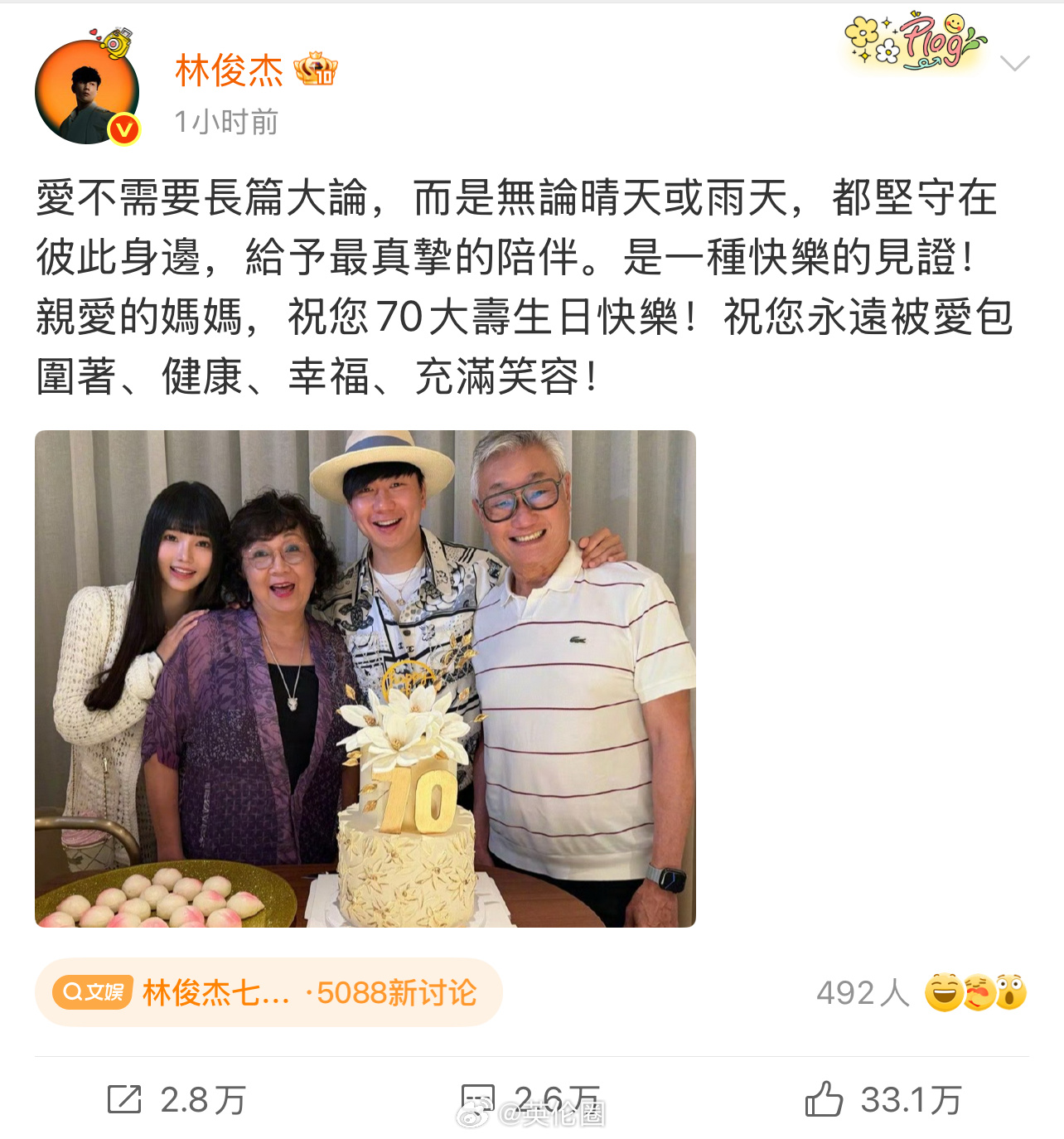 林俊杰官宣恋情,林俊杰带女友为妈妈庆生。12月29日,林俊杰晒出与女友一起为妈妈庆祝70大寿的合照,正式官宣恋情。 林俊杰写道:“亲爱的妈妈,祝您70大寿生日快乐!祝您永远被爱包围着、健康、幸福、充满笑容!”照片中一家人合影温馨,四人笑容灿烂,引发网友热议。