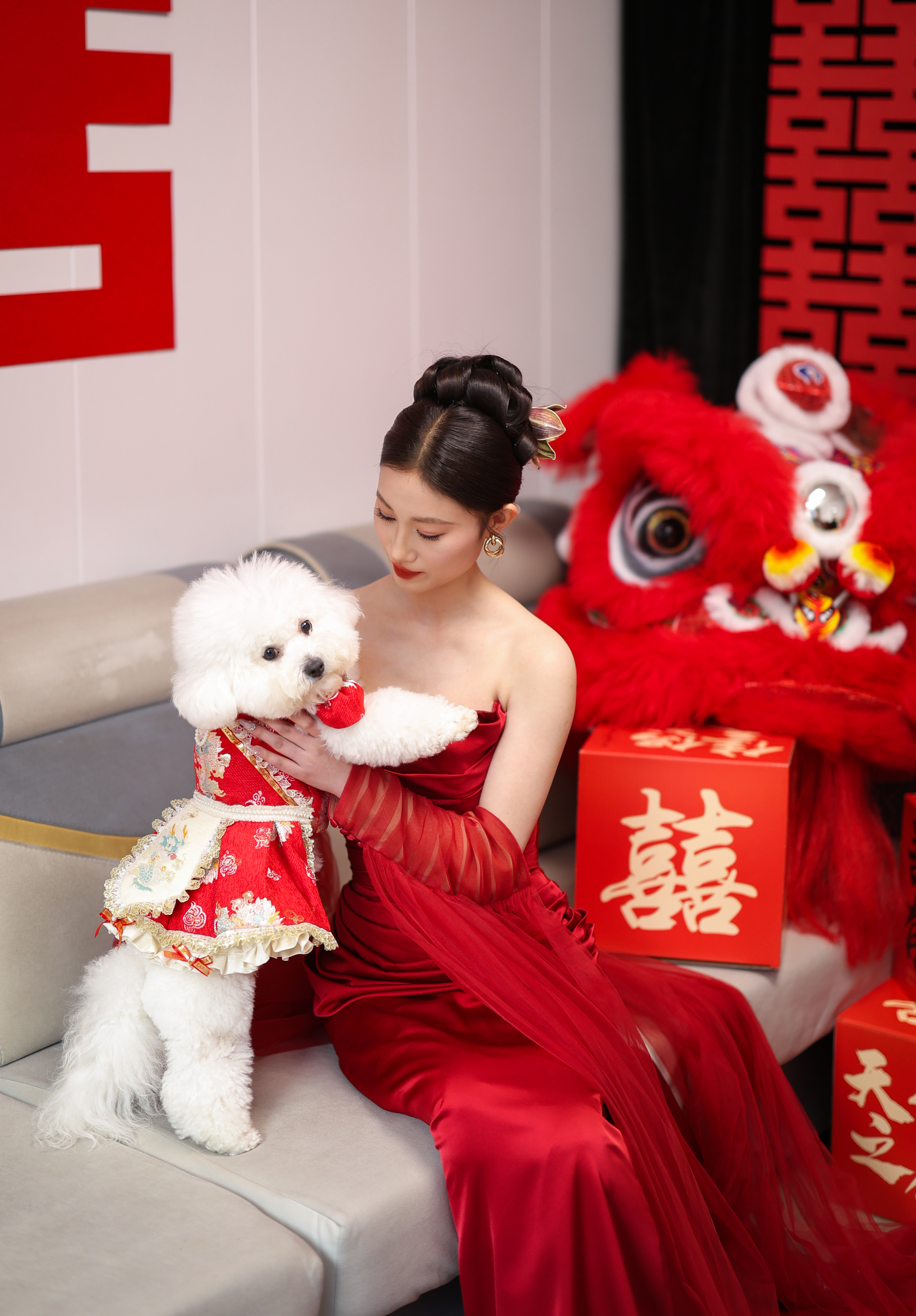 《娇犬红妆》红烛映纱,凤冠霞帔间,小白犬衔来同心结,满室喜字皆成诗。