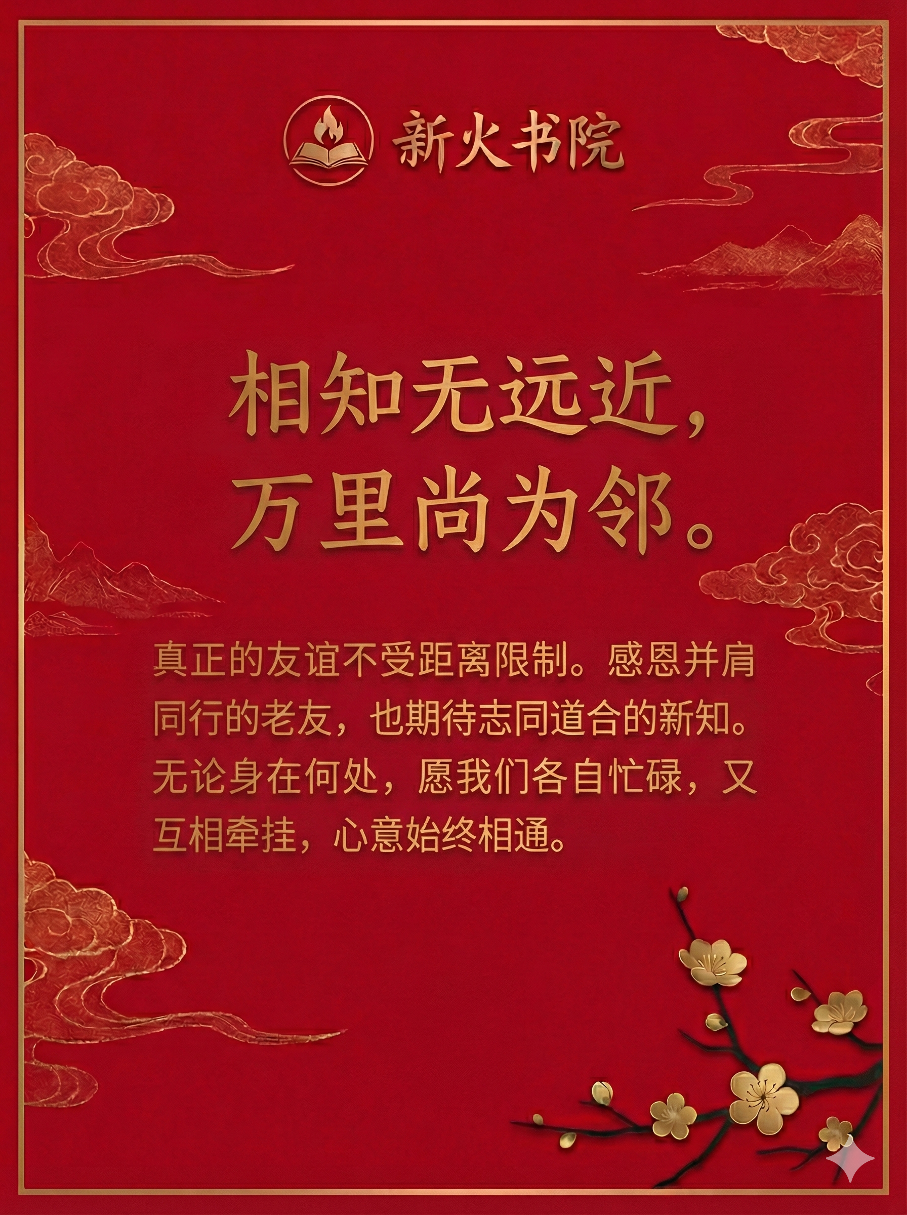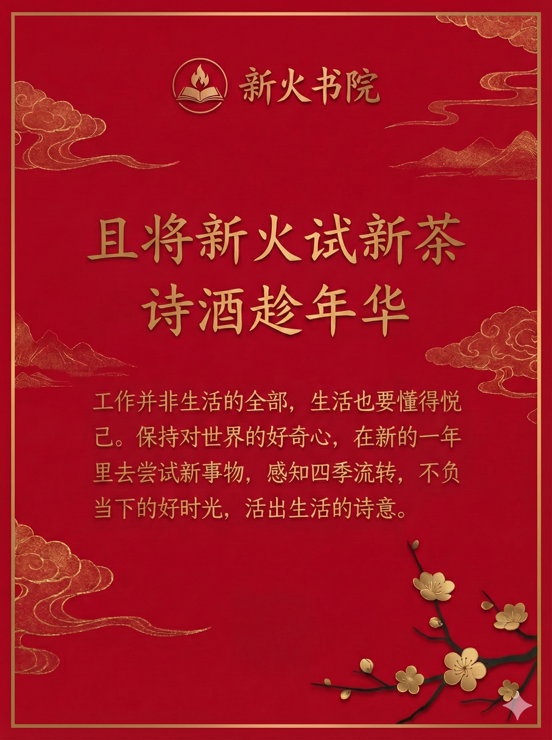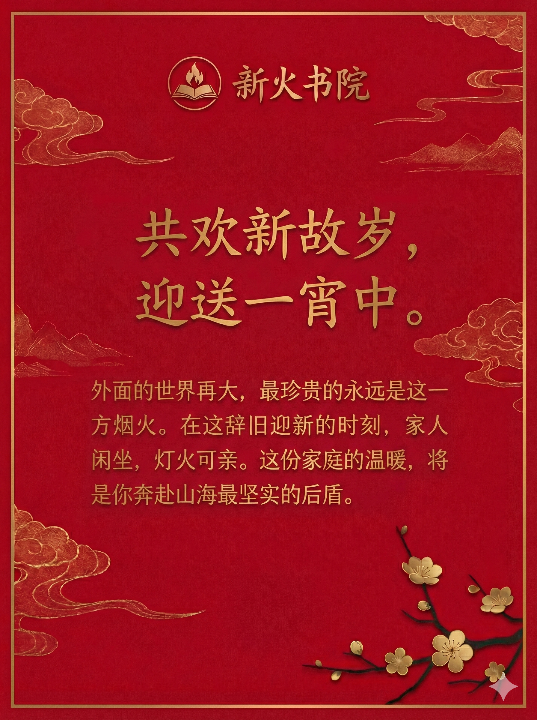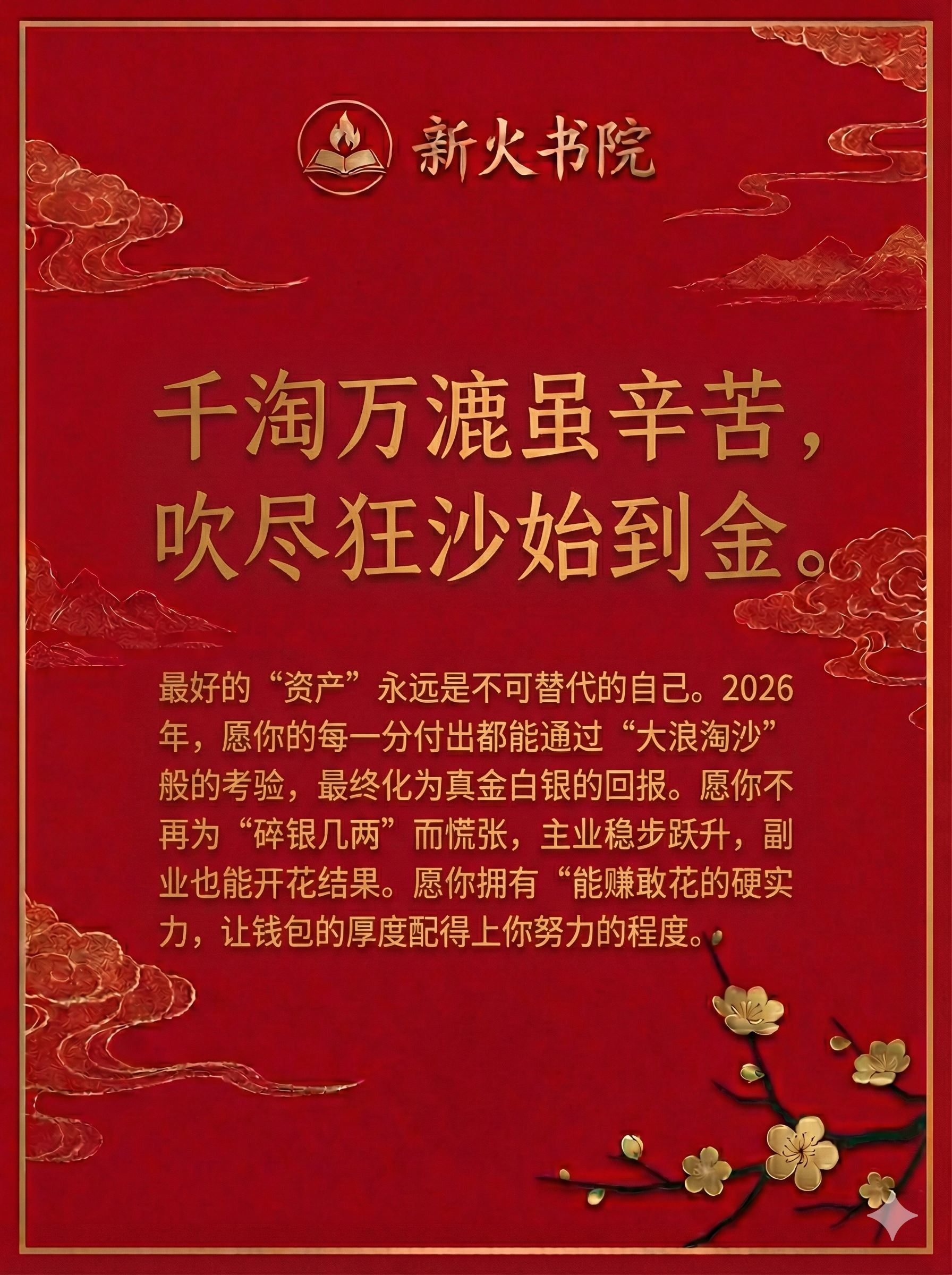 各位小伙伴,新年好,在这里给大家送上新年祝福咯🏮 祝大家“日有熹,月有光,富且昌,寿而康”白日有温暖晨光普照,黑夜有清辉夜色相伴,日子过的富足兴旺,身体始终健康无恙,愿我们三餐四季安稳,家人安康顺遂。 💼愿你工作上,有“长风破浪会有时,直挂云帆济沧海”的魄力与坚定。面对新一年的未知与挑战,不畏风浪,笃定前行。不仅要有向上的野心,更要有落地的执行,在职场的沧海中扬帆远航,相信抵达彼岸只是时间问题。 ☕️愿你生活上,有“且将新火试新茶,诗酒趁年华”的洒脱与兴致。工作并非生活的全部,生活也要懂得悦己。保持对世界的好奇心,在新的一年里去尝试新事物,感知四季流转,不负当下的好时光,活出生活的诗意。 🧑🧑🧒🧒愿你家庭上,有“共欢新故岁,迎送一宵中”的温情与团圆。外面的世界再大,最珍贵的永远是这一方烟火。在这辞旧迎新的时刻,家人闲坐,灯火可亲。这份家庭的温暖,将是你奔赴山海最坚实的后盾。 🧑🤝🧑愿你友情上,有“相知无远近,万里尚为邻”的懂得与牵挂。真正的友谊不受距离限制。感恩并肩同行的老友,也期待志同道合的新知。无论身在何处,愿我们各自忙碌,又互相牵挂,心意始终相通。 📚愿你兴趣上,有“问渠那得清如许,为有源头活水来”的澄澈与日新。志同道合的所有同路人,愿我们互为“活水”。新的一年,愿思想在这里碰撞,智慧在这里流动,保持认知的不断迭代与更新,让微光汇聚成炬。 💰愿你财富上,有“千淘万漉虽辛苦,吹尽狂沙始到金”的底气与丰盈。最好的“资产”永远是不可替代的自己。2026年,愿你的每一分付出都能通过“大浪淘沙”般的考验,最终化为真金白银的回报。愿你不再为“碎银几两”而慌张,主业稳步跃升,副业也能开花结果。愿你拥有“能赚敢花”的硬实力,让钱包的厚度配得上你努力的程度。 2026,乙巳蛇年。 愿你心中有丘壑,眉目作山河。 愿你遇见更好的自己。 新年快乐!