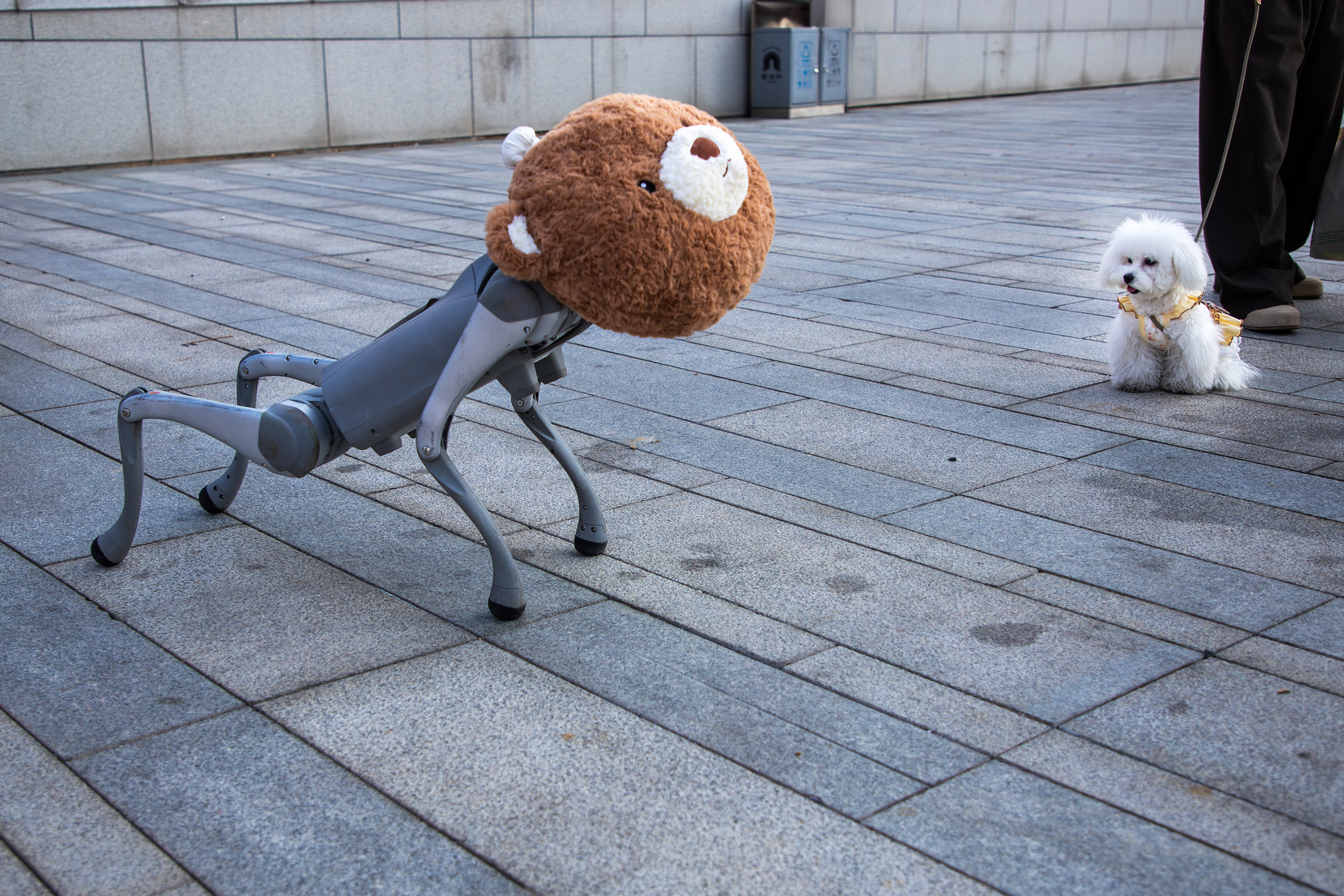 《打招呼》 2025年12月6日拍摄于宁波海曙 罗城望京门,萌宠走江湖活动中, 萌狗和机器狗互相打招呼。