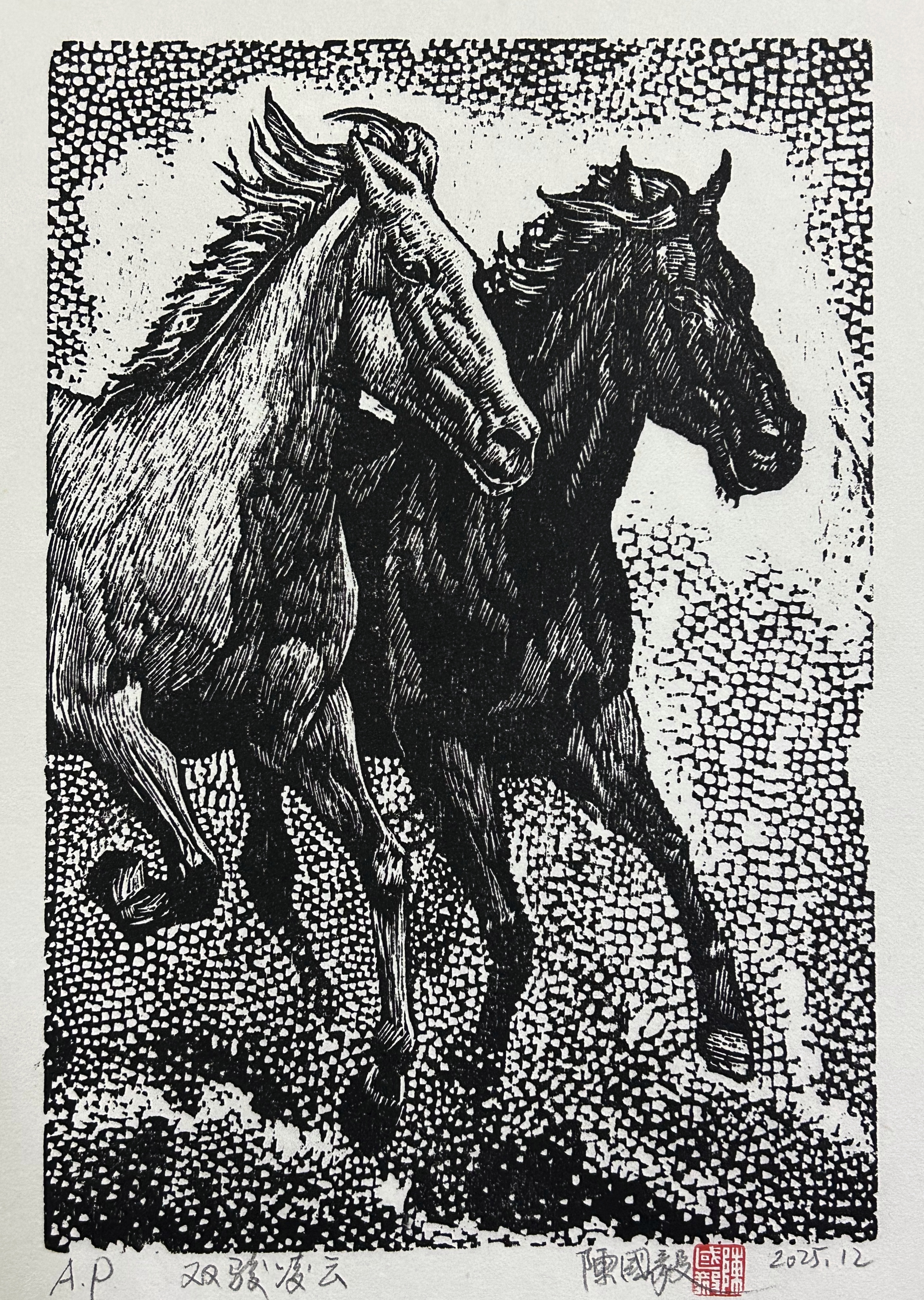 元旦咔嚓一声到! 新的一年揣着好运跑, 马年暴富暴美,快乐没烦恼! 作《双骏凌云》贺岁,㊗诸友双倍福至,马年步步皆繁花。 #潮艺术# #陈国毅版画#