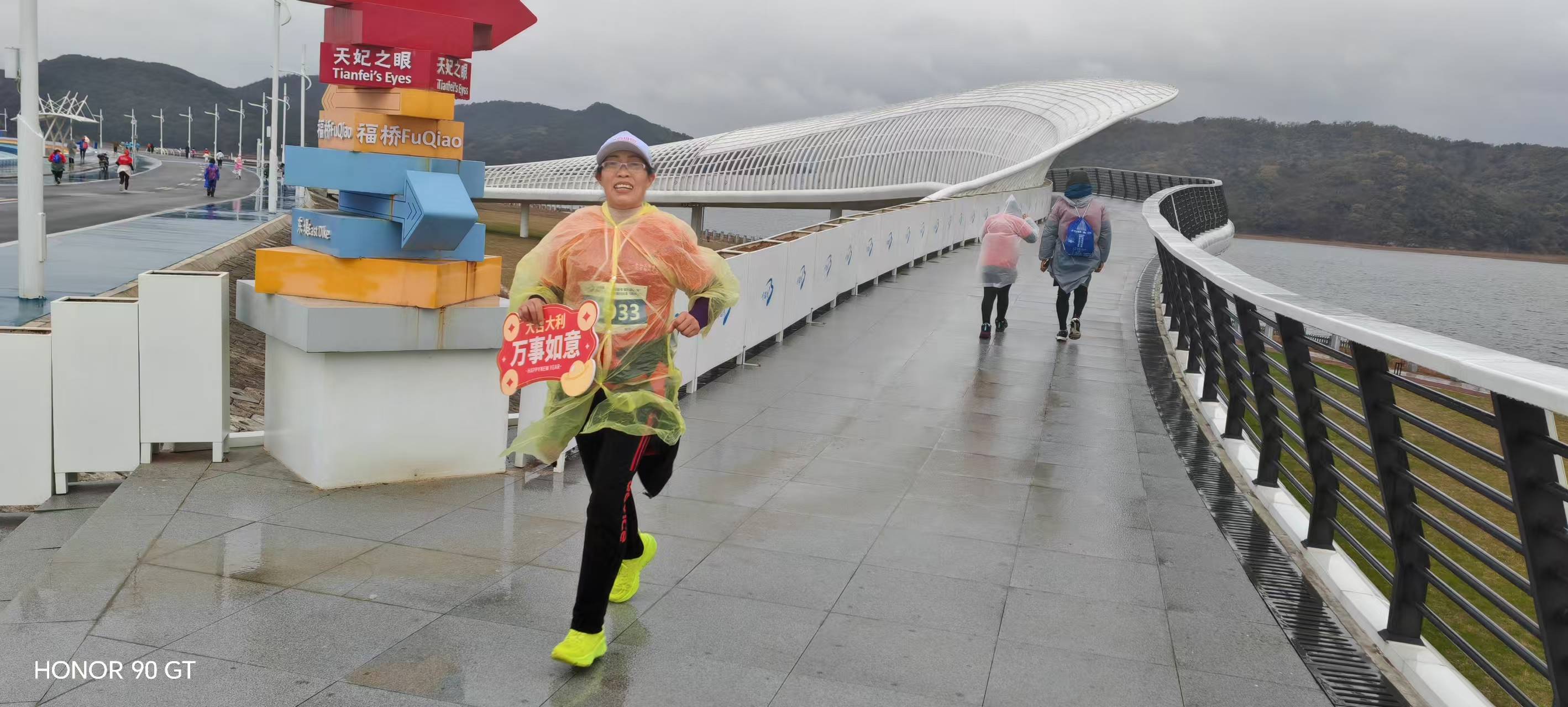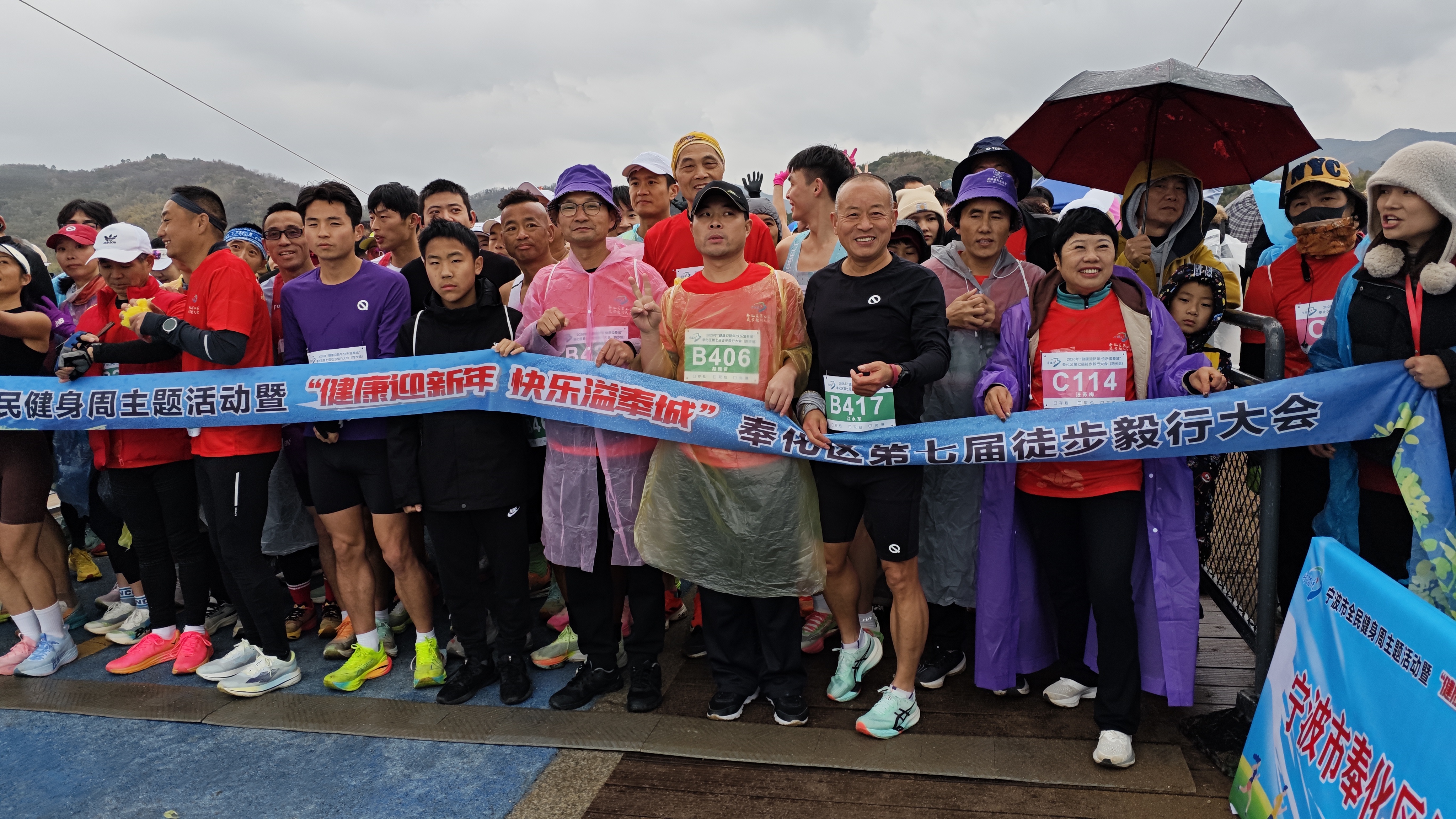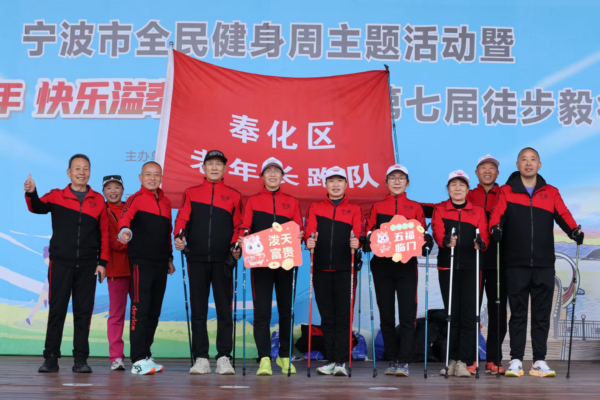 奉化第七届徒步毅行大会燃动天妃湖 ——奉化老年长跑队积极组队参与 勇夺佳绩 马宜奋 2026年1月1日上午,由奉化区文化和广电旅游体育局、宁波滨海旅游休闲区开发建设管理中心联合主办,区体育管理中心、宁波大美海湾旅游开发有限公司承办,区户外运动协会执行的宁波市全民健身周主题活动暨“健康迎新年 快乐溢奉城”奉化区第七届徒步毅行大会在宁波湾天妃湖东堤正式开跑。来自全区机关、企业、户外俱乐部及社会各界的2000余名运动爱好者,沿着13.8公里的“山海福道”激情出发,用脚步丈量“东海福地”的生态画卷,开启2026年第一缕运动曙光。奉化老年长跑队组织10多名队员积极参与跑步组和徒步组,并获得了较好的成绩。 本次活动以“健康迎新年 快乐溢奉城;祈福天妃湖,福运满征途”为口号,设置跑步组与徒步组两大组别,线路精心串联天妃湖东堤、福桥、鸿峙村、生命之环等核心节点,全长13.8公里,让参与者在运动中深度感受这座“东海福地”的生态之美与文化底蕴。上午9点,发令笛声划破天妃湖的宁静,选手们冲出起点。在浩浩荡荡的“彩色长龙”中,一支“银发方阵”格外引人注目——奉化老年长跑队10余名队员统一佩戴队徽,分赴跑步组与徒步组双线作战。风雨交加里,他们步履铿锵、斗志昂扬,用速度与坚持诠释“健康无关年龄”的体育精神。“老当益壮,宝刀未老!”59岁的队长江水军率先冲过终点,以58分36秒夺得跑步组第37名,在800余名竞速高手中为老年队赢得新年首块“荣誉勋章”。而在徒步组,其余队员提前半小时完成13.8公里全程,边走边拍,一路打卡“福桥”“生命之环”等网红节点,成为移动的风景线。 “今天是2026第一天,和队友在天妃湖迎朝阳、迎新年,特别有意义!”冲线后,江水军与队友们合影留念,笑意写在每一道皱纹里。“我们希望通过迎新徒步,把‘体育+旅游+文化’深度融合,让更多队员走出家门、拥抱自然,用脚步丈量家乡之美。”奉化区老年长跑队负责人表示。