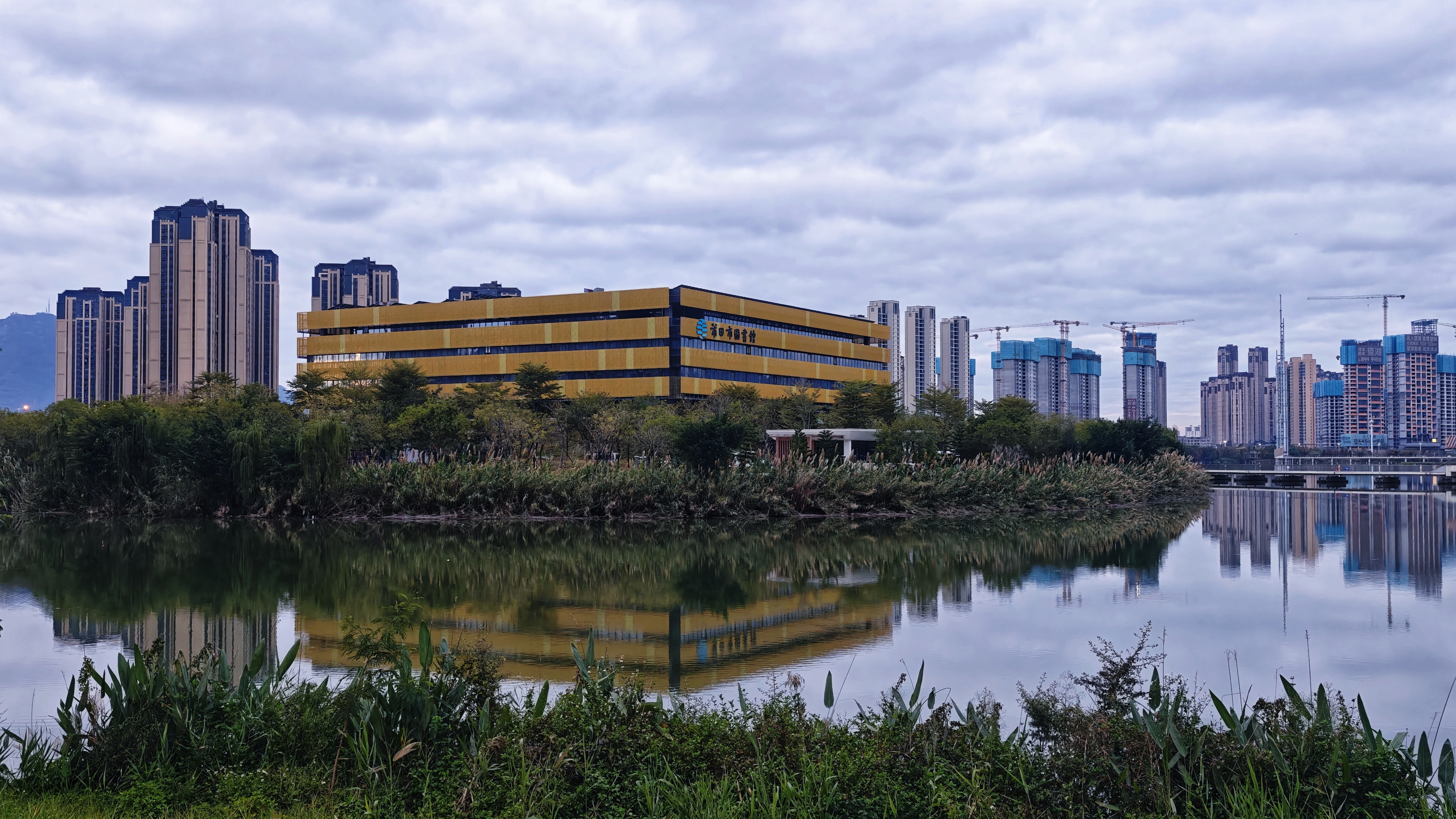 镜头里的莆田图书馆像颗发光的春茧,黄墙倒映在湖面,塔吊与云层天空同框。