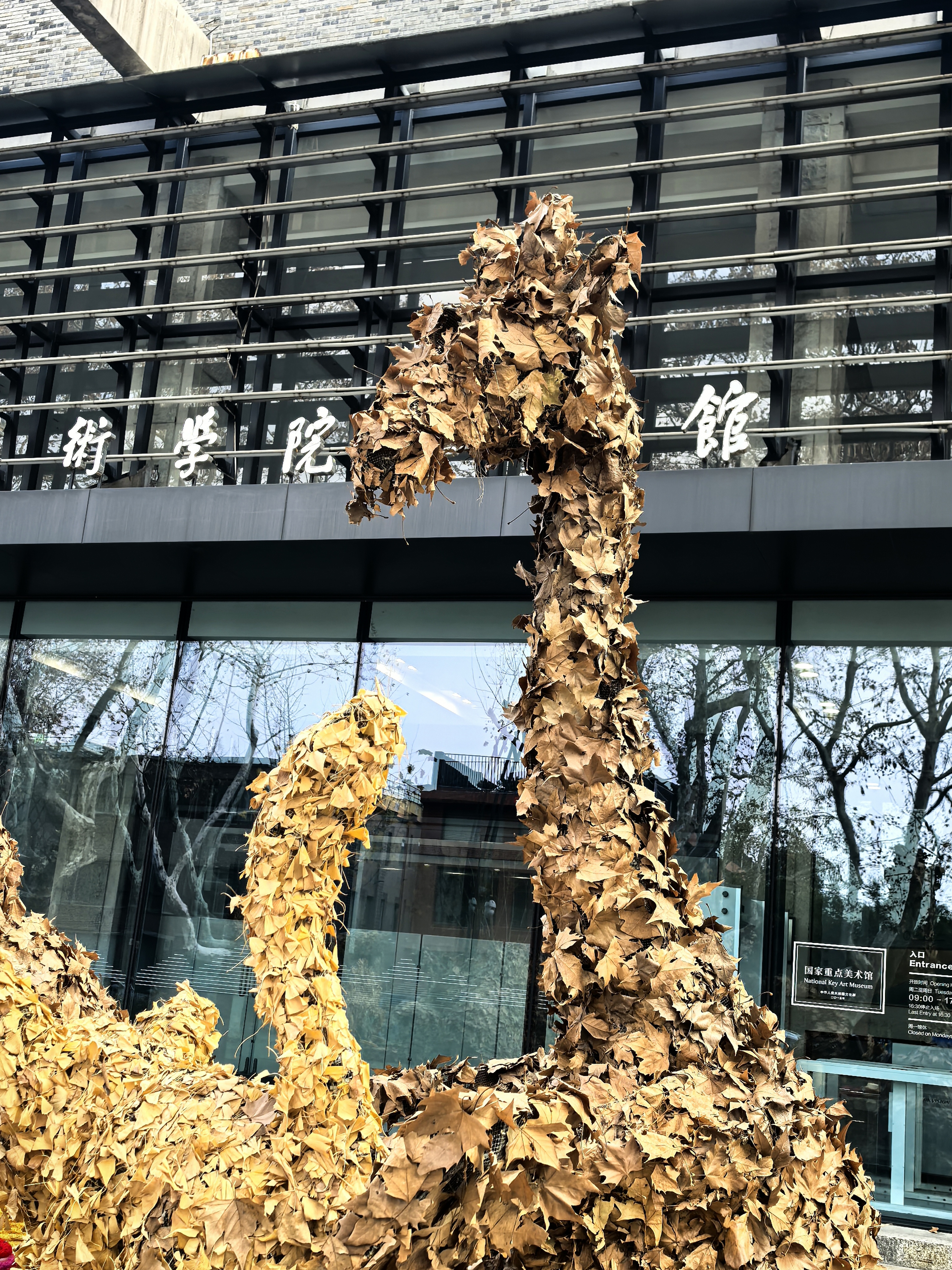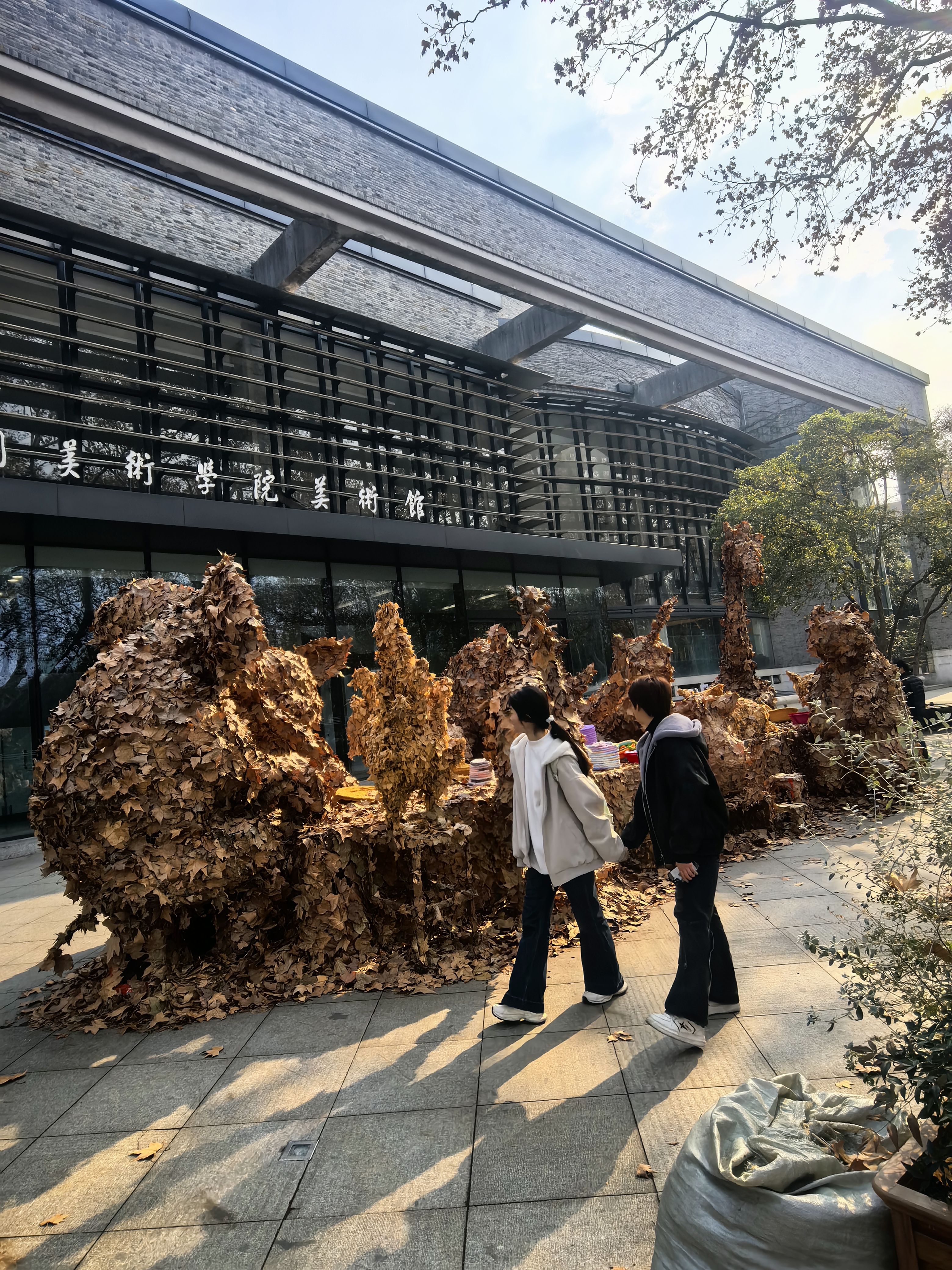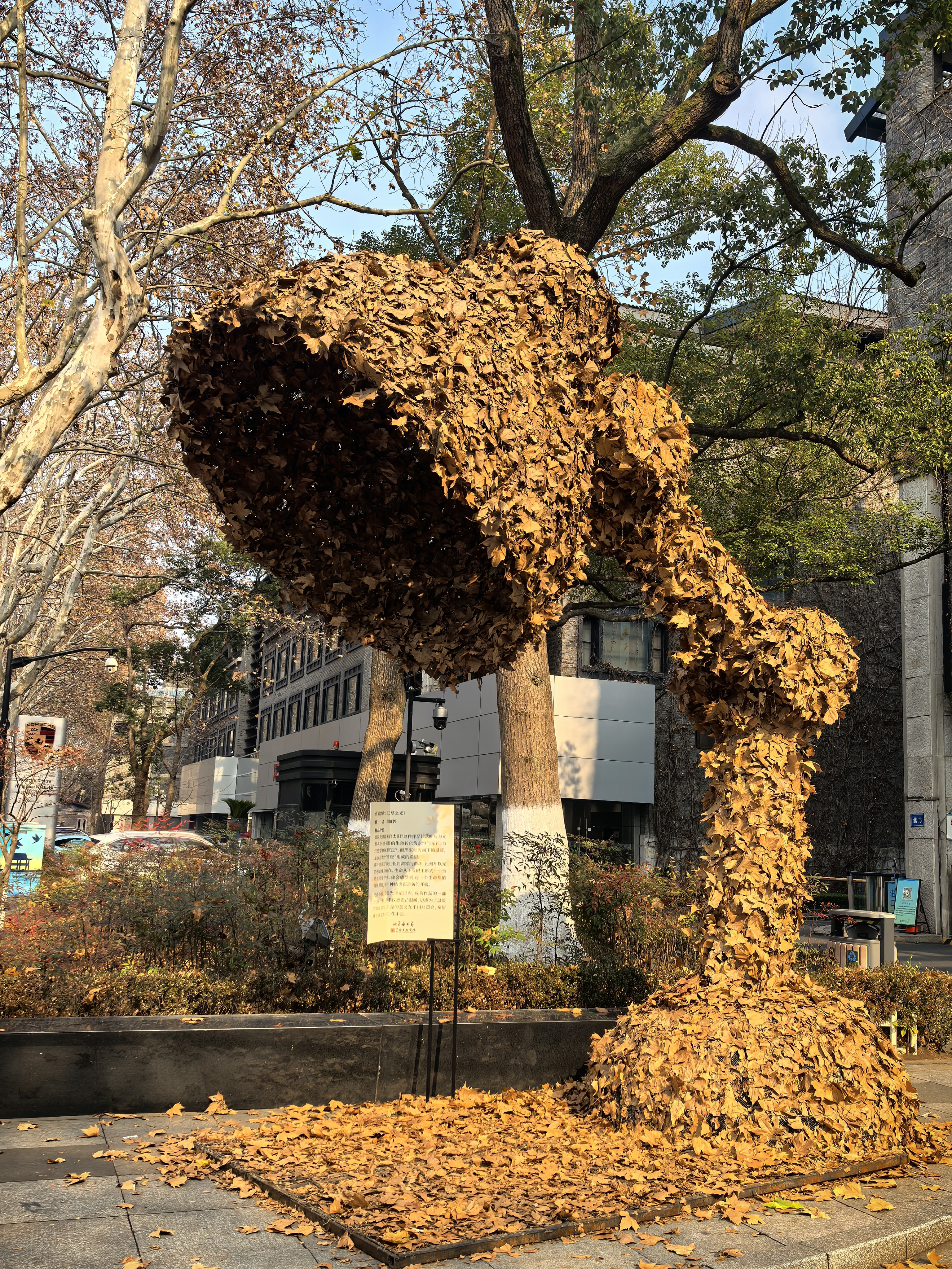 如果要看一片片落叶离树飘零的诗意,在北山街经杨公堤到南山路随处可见。如果要看万万片落叶集体联袂的宏大,就得到中国美院门口来。这大约是西湖边一年中最盛大的一场告别:朔风凛冽,千千万万枚黄了鬓角的叶子,从枝头坠入美院学子的掌心,它们不再是飘零的过客,而成了会说话的魂魄。 记得前些年,那些叶片曾叠成过低头饮水的麋鹿,也堆砌过憨坐相对的大熊,掌中托着几枚枯黄的落叶,仿佛是那些被我们遗落的童年旧梦。 而今年,南山路畔悄然立起一盏永不熄灭的台灯。它敦厚温静地弯着腰,将一整季的凋零,守成一片暖金色的光晕。它不说话,却仿佛在答:所有的离去,都只是为了酝酿另一场照亮。灯下走过的人,拖着行李的,看着手机的,大约都在这片光里,被无声地温存了又一程。 台灯南侧,是那组“马儿去哪里了”的组合。修长的颈项昂扬向天空,姿态悠然,偏偏身躯隐在想象里。啊,这正是少年学子才有的狡黠与深情:不让你看见奔赴,只让你看见仰望;不诉说去向,只留下一个引人怀想的、优美的谜团。落叶在此,不再是消亡的凭证,而成了通往无限的缰绳。 落叶飘零坠地,美从未离开,它只是换了一种语言,在年年岁岁的更迭和重构中,它似乎轻轻地诉说着:看见了吗,每一种凋零,都可以是点燃,也可以是飞翔。