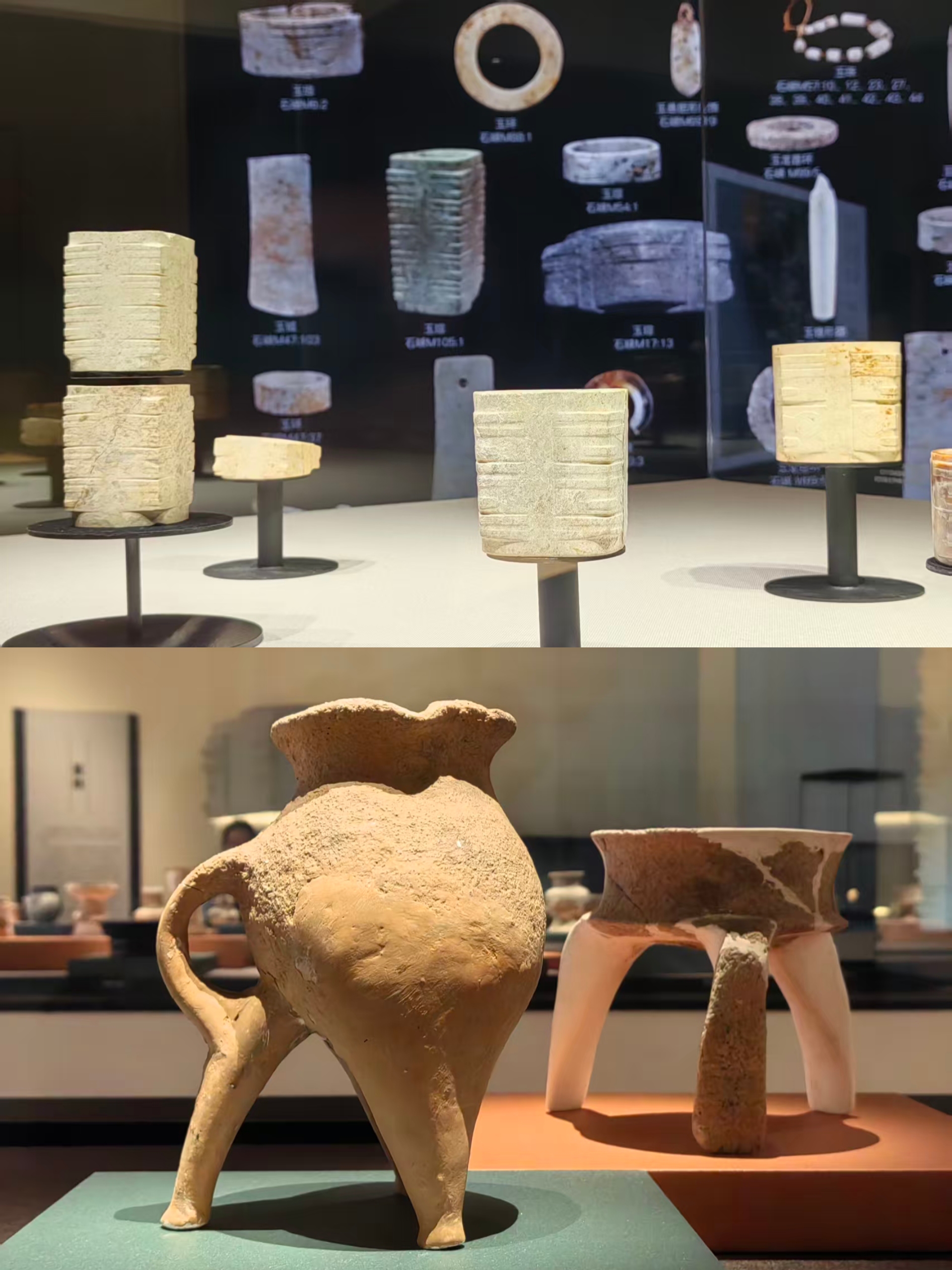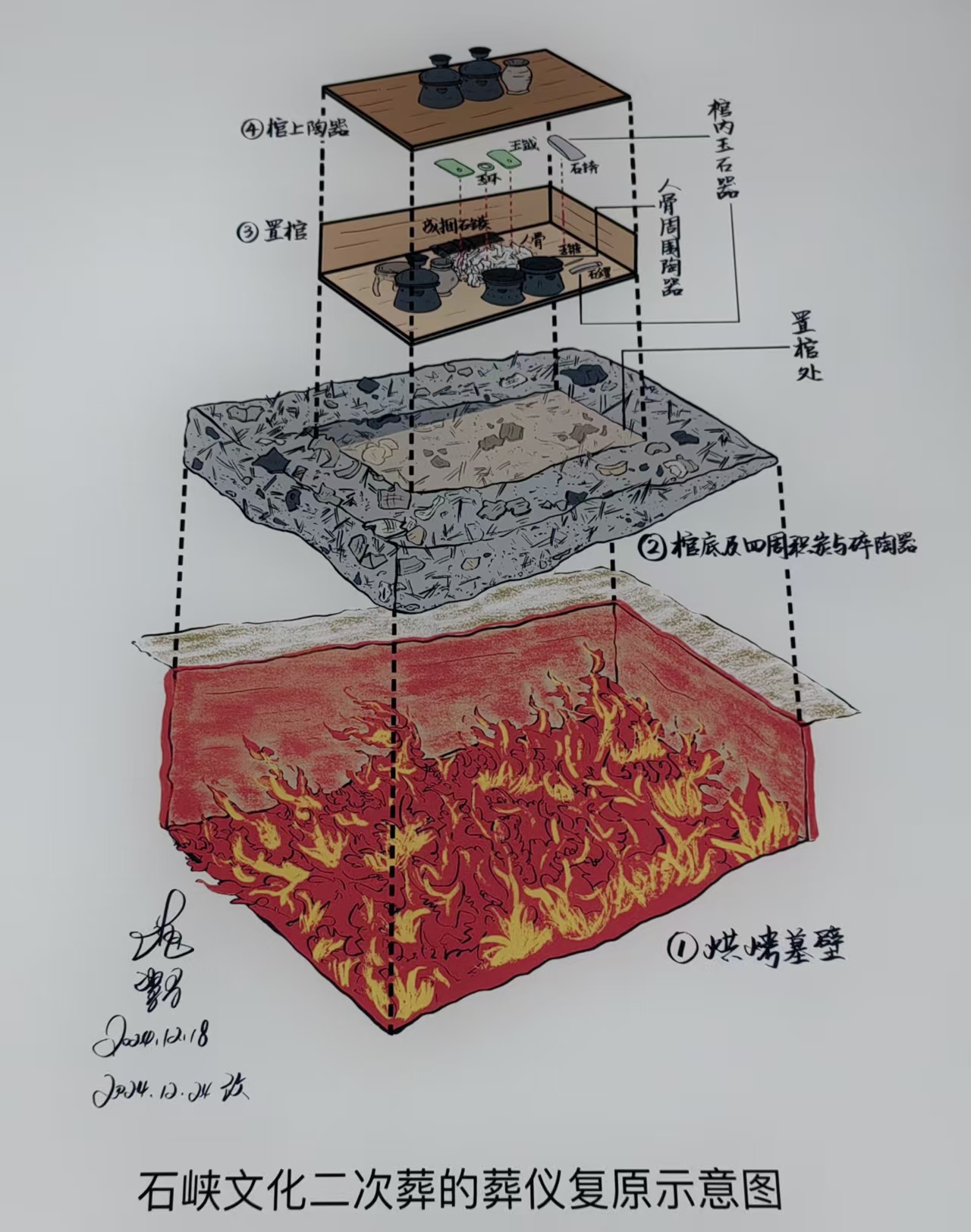 曲江石峡遗址,距今4500年左右,是目前岭南地区最早的复杂社会,年代与良渚文化兴盛时期对应。 在葬俗方面,石峡文化盛行“二次葬”,也叫洗骨葬,即将尸骨与随葬品进行两次及以上处理的安葬,使灵魂脱离肉体而永存。 石峡文化遗址中发现了具有分区规划的大型公共墓地,墓葬之间表现出明显的等级与身份差异。集中分布的高等级墓不仅规模大、随葬品丰富,还随葬成组的玉石礼器。个别较大的墓中还有朱砂铺底痕迹。 二次葬墓中常见两套随葬品,一套较破碎,是随死者尸骨从一次葬墓迁移过来的,不同陶器的碎片混杂在一起;另一套较为完整,排列整齐,是二次葬时新放入的随葬品。 二次葬下葬过程: 第一次安葬(一次葬)→若干年后挖开墓穴,取出人骨及随葬品,留下一座小型的浅墓坑一重新挖掘二次中等深坑墓,放置从一次葬墓迁移过来的残碎陶器、石器和玉器一放入葬具,葬具中摆放人骨及新的随葬品→填土。