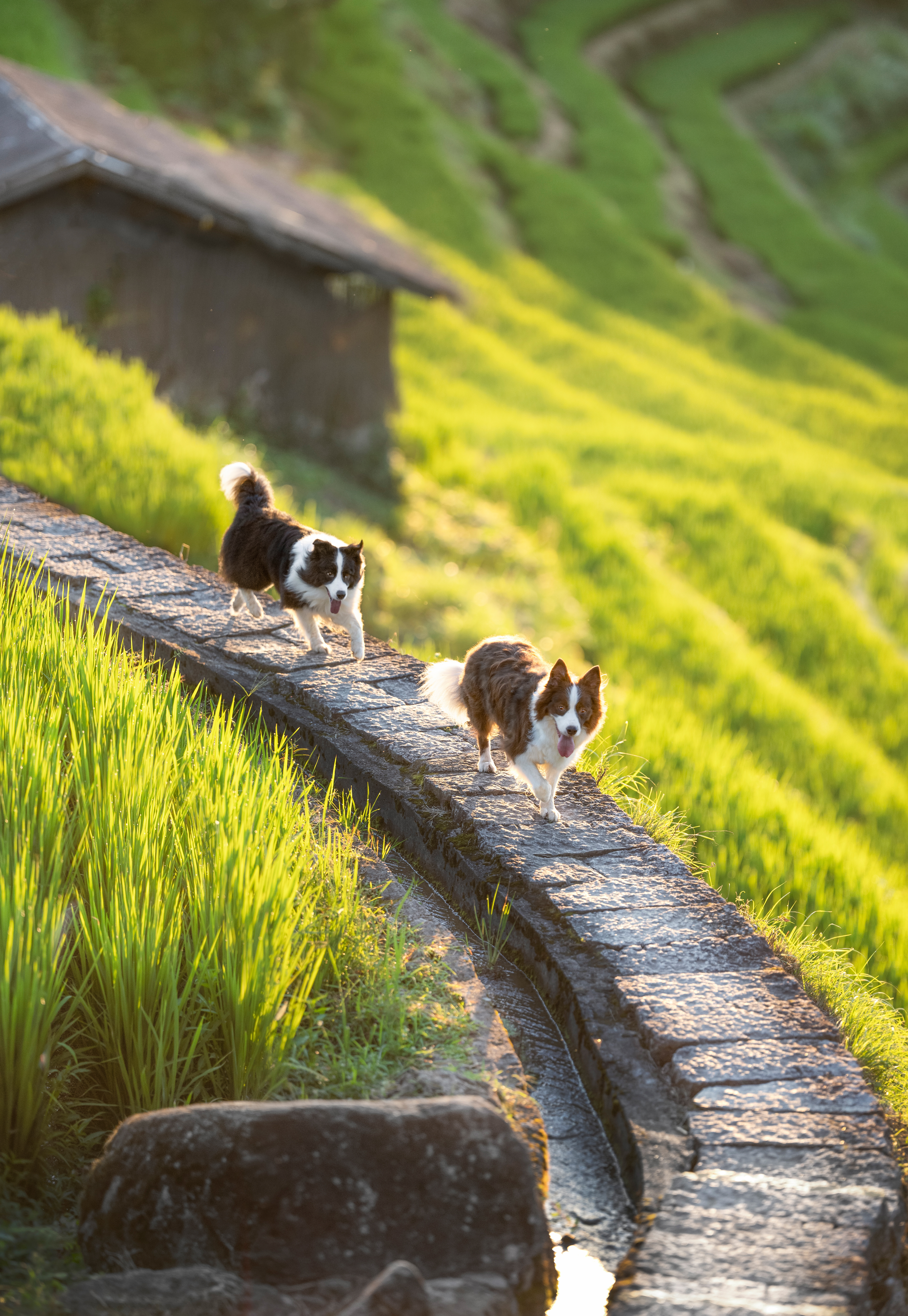 标题:哥俩好 描述:清晨的梯田,两只汪漫步其中,我记录下这一美好时刻 拍摄时间:2025.07