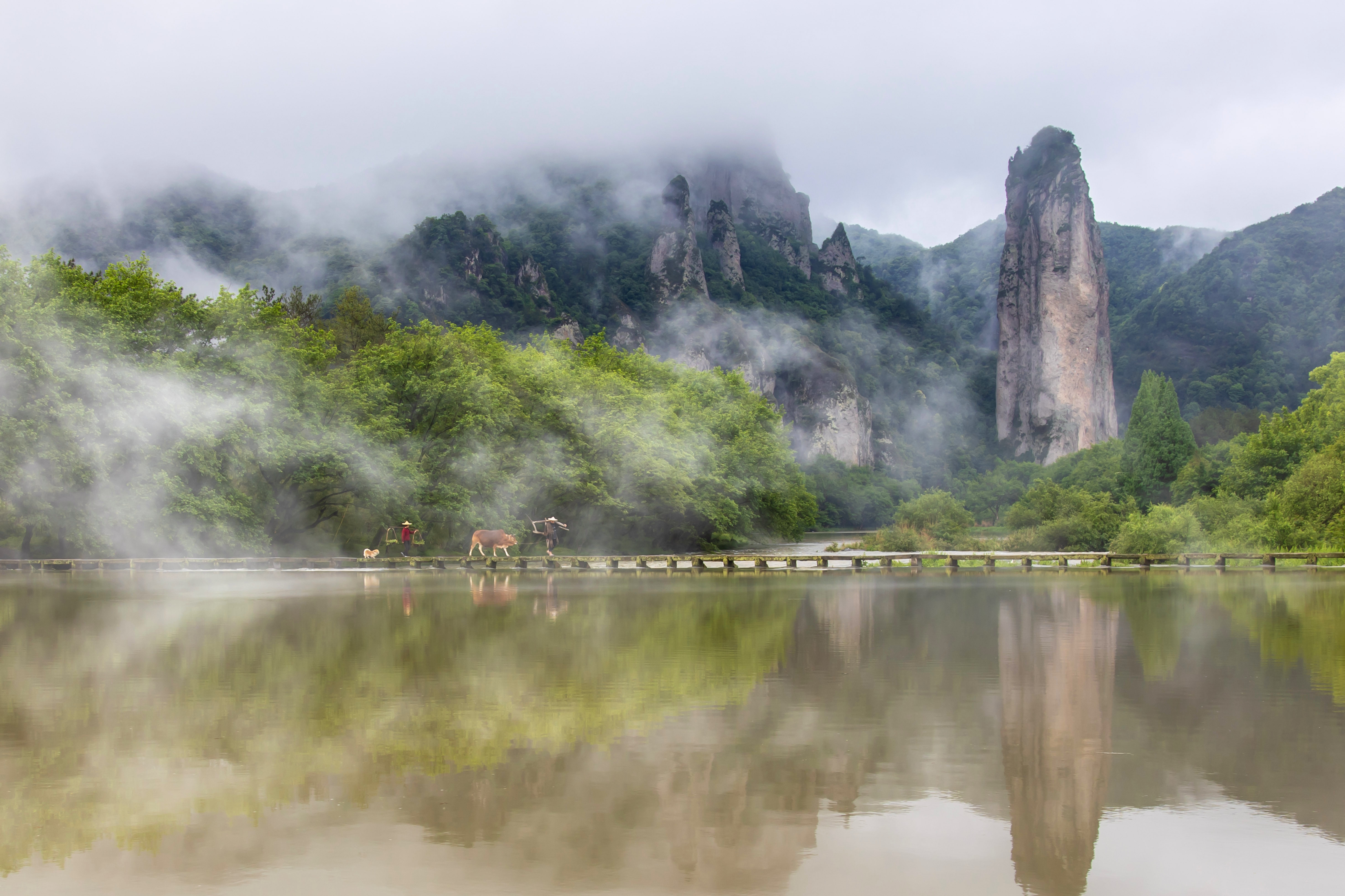 晨雾轻笼,好溪如镜。鼎湖峰在碧波中垂首,与天光云影共徘徊。老农牵牛缓过石桥,小狗狗紧跟在后,踏碎了山水长卷的倒影。这方丹霞秘境,是江南未拆封的诗。