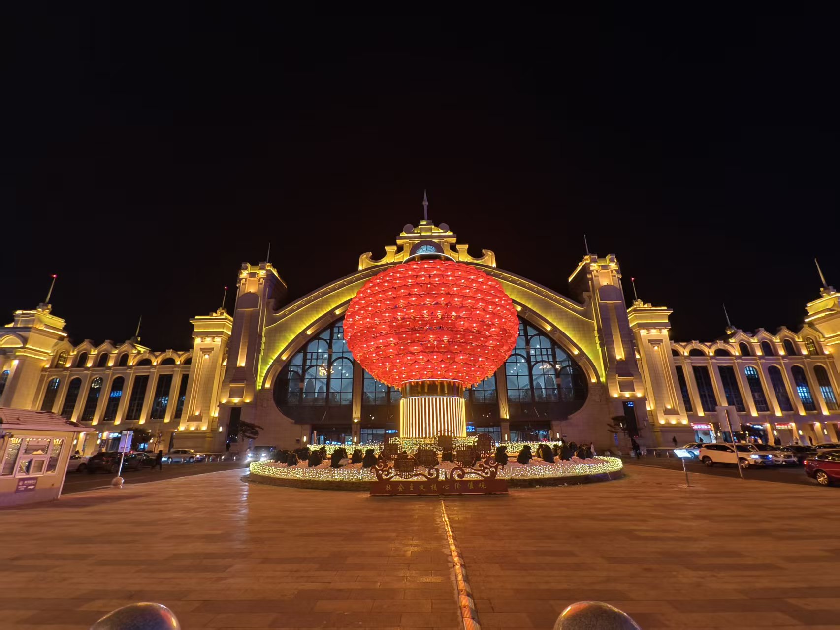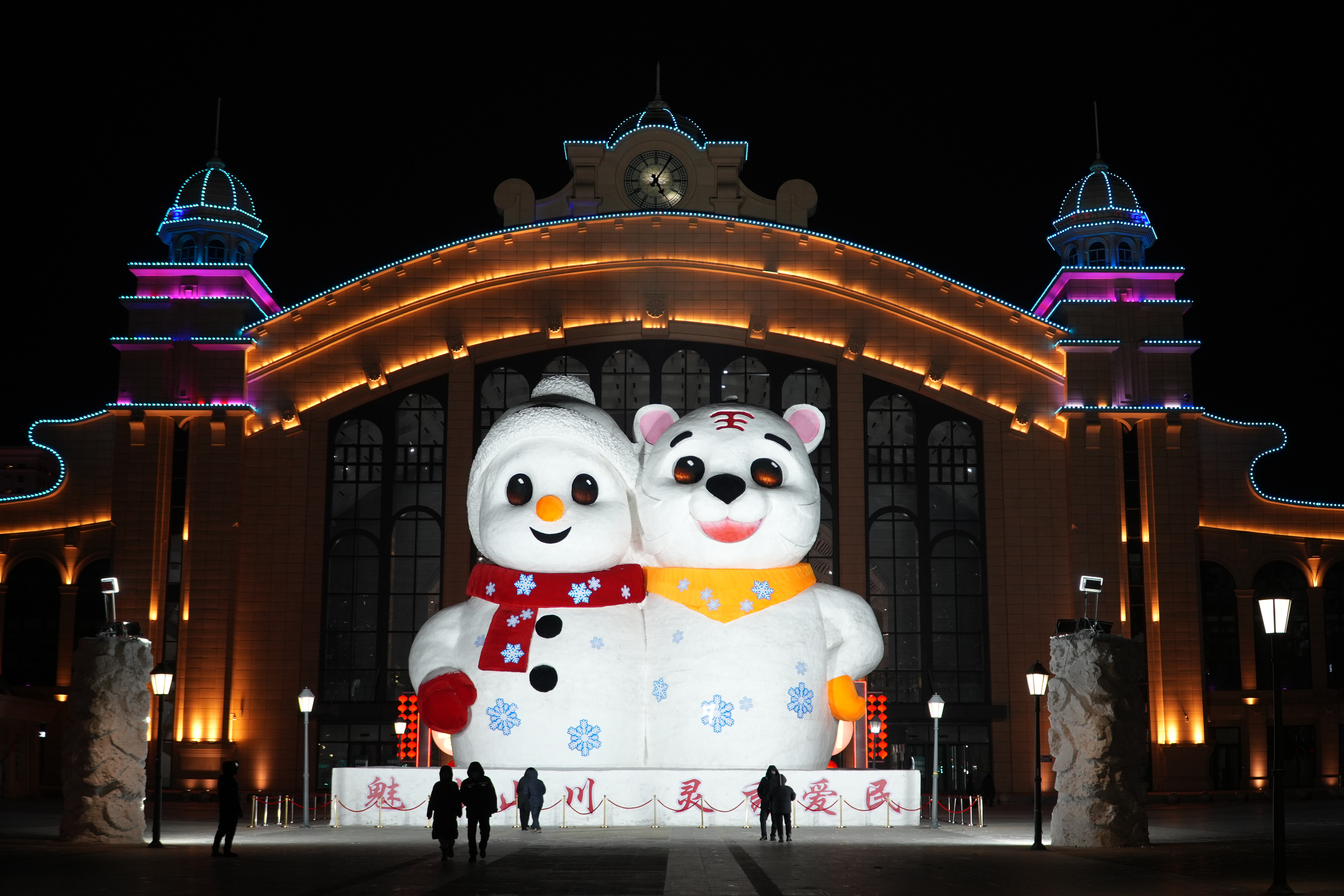 华灯初上,年味一下不就来了,牡丹江火车站南站和北站的雕塑、雪人,欢迎回家的游子。
