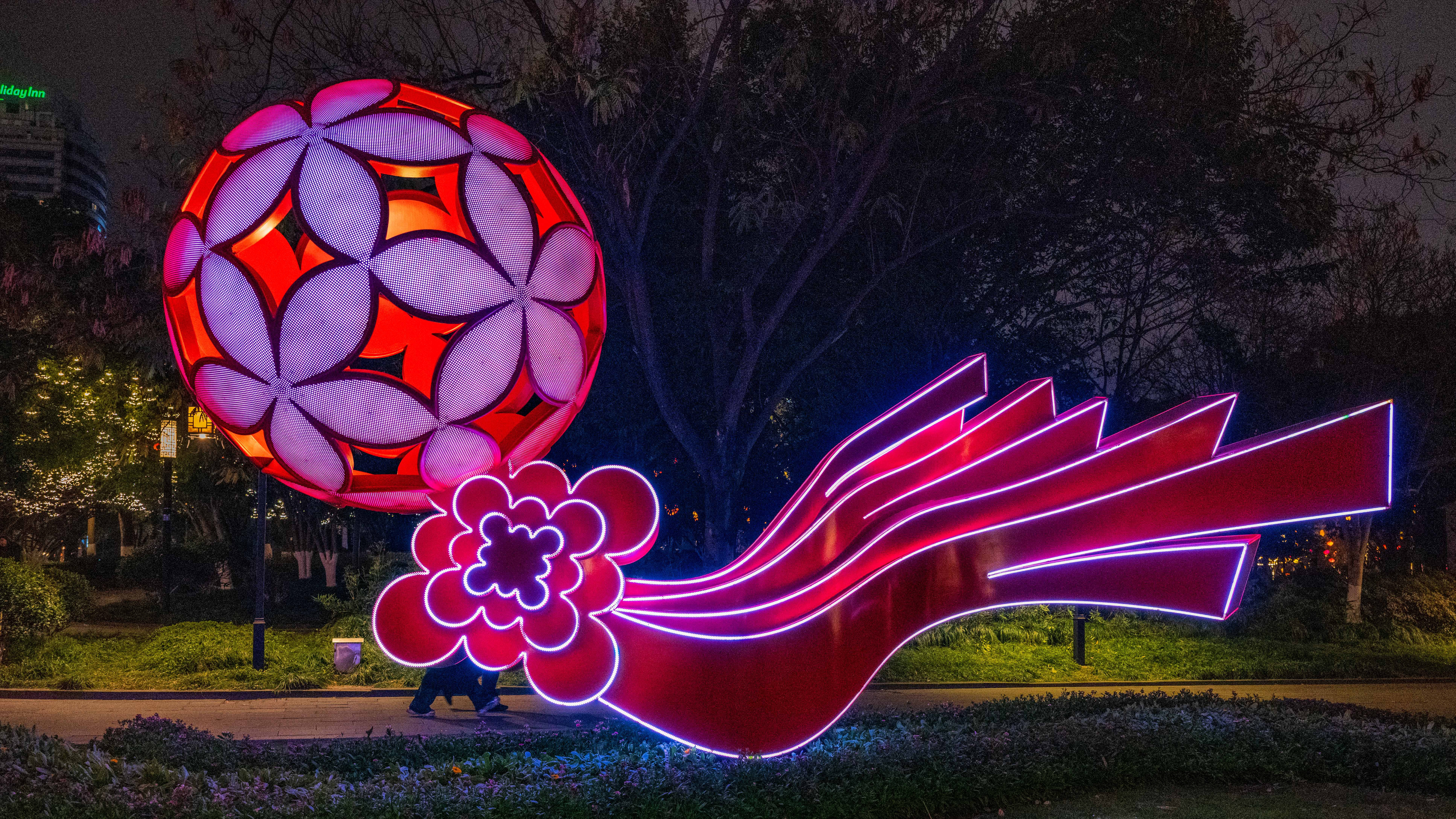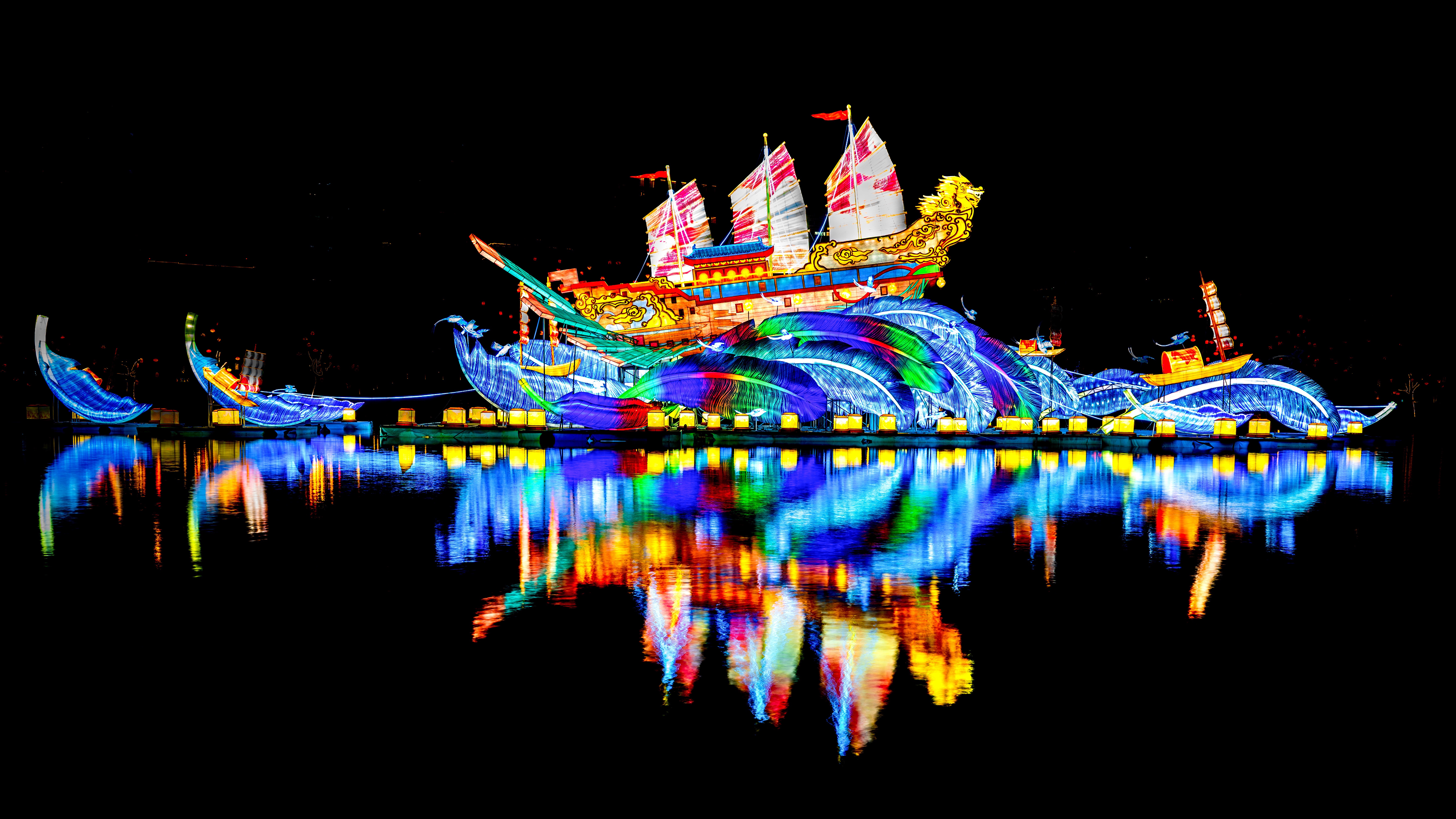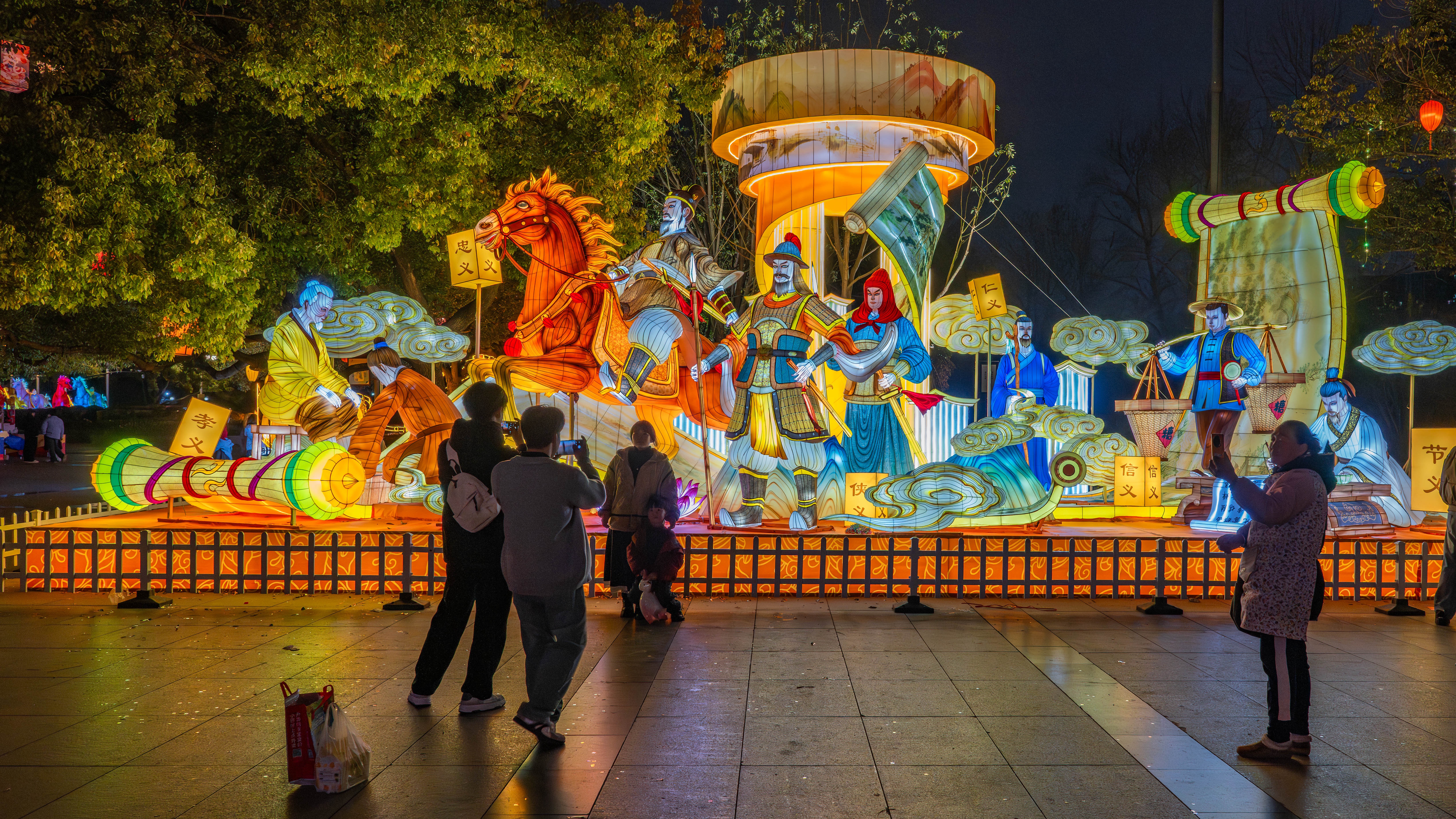 灯会分为绣湖广场和绣湖公园两大区域,主题分别围绕“策马奔腾 盛世华章”和“家和岁韵 福满商城”展开,整体以“义马当先 乌启新章”为核心,融合商贸人文元素。