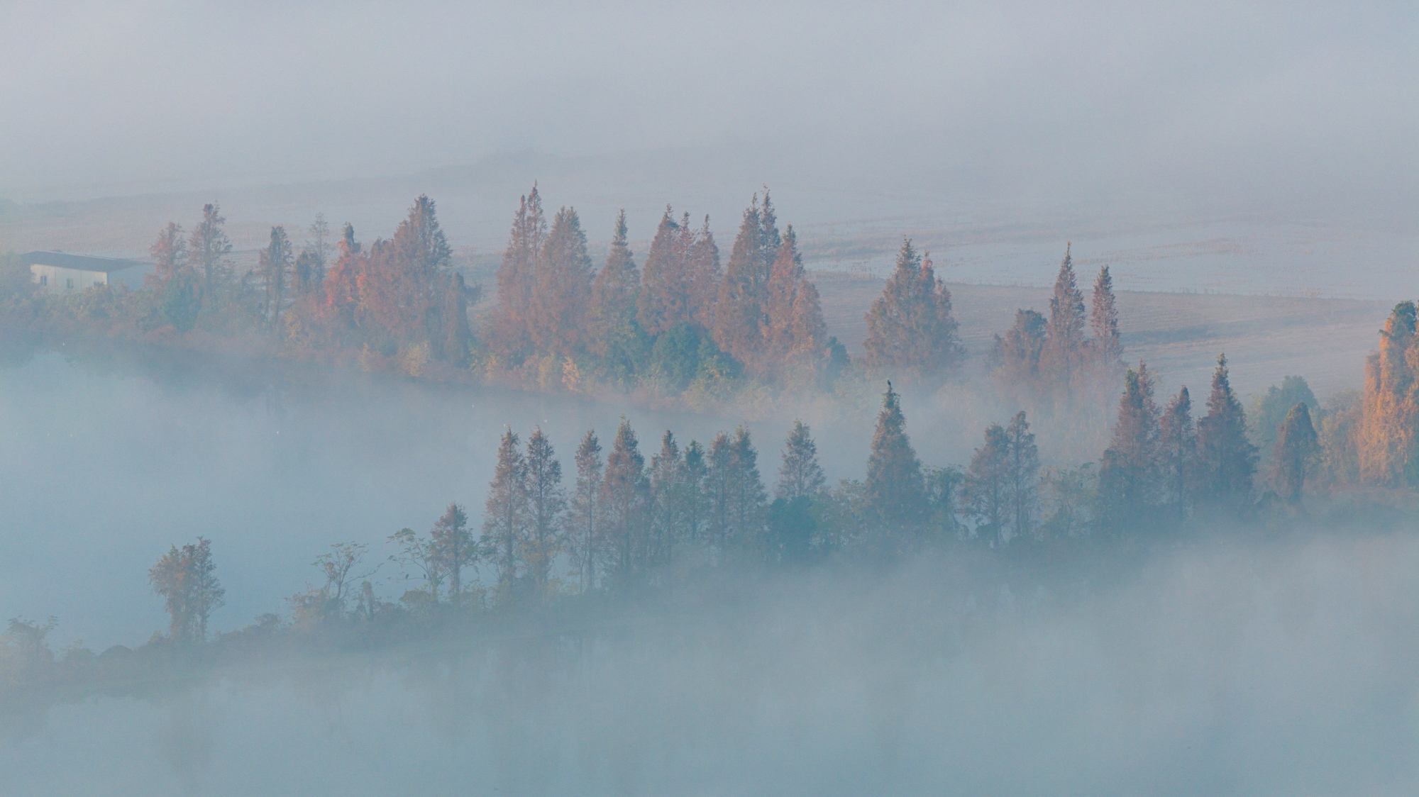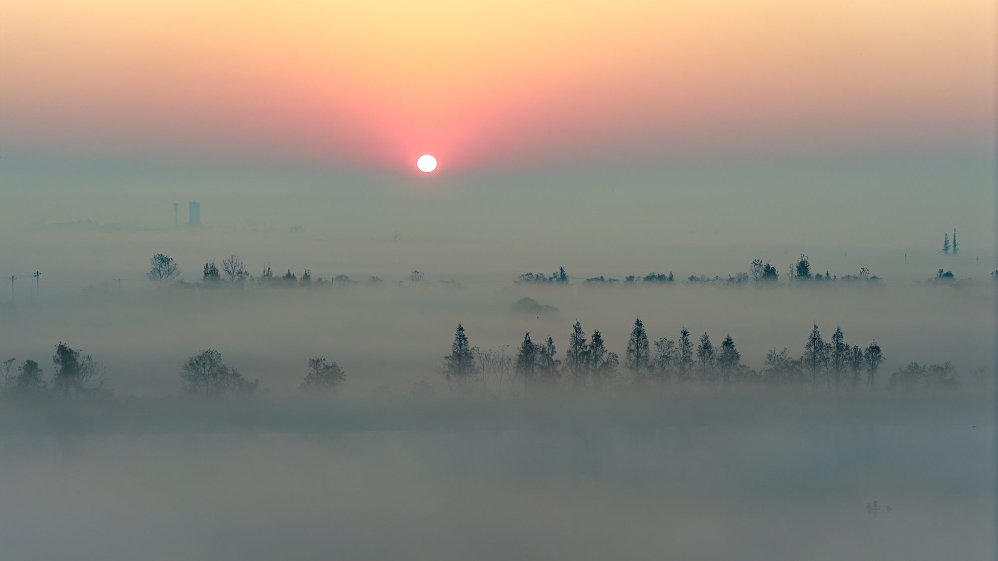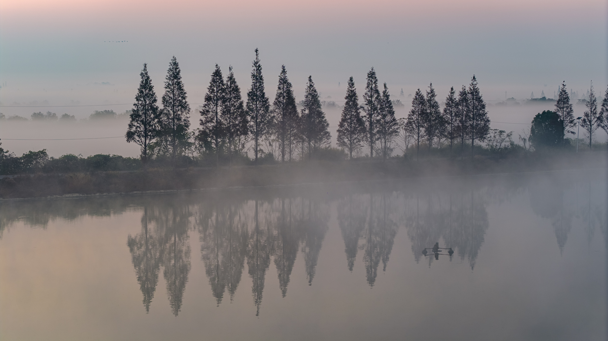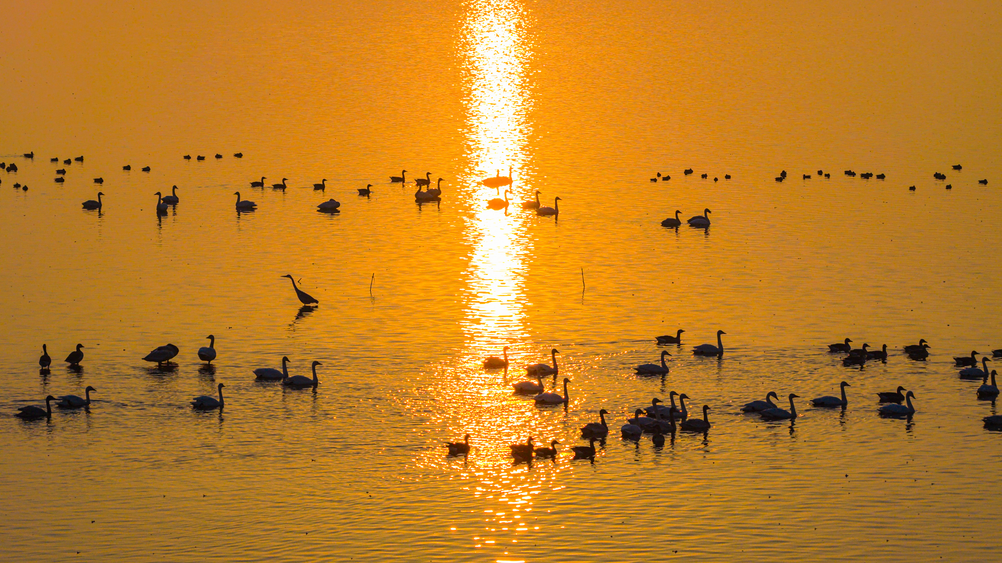 【江西余干:雾锁康山堤 霞染鄱湖岸】鄱阳湖畔的江西省上饶市余干县康山大堤,清晨薄雾氤氲。红日破雾升腾,橙粉霞光漫染天际,水杉林隐于雾中,如写意水墨;湿地湖面波光粼粼,天鹅、鸬鹚翩跹嬉戏。雾、霞、林、鸟相映成趣,勾勒出一幅灵动的冬日生态图景,引得游人纷至沓来。