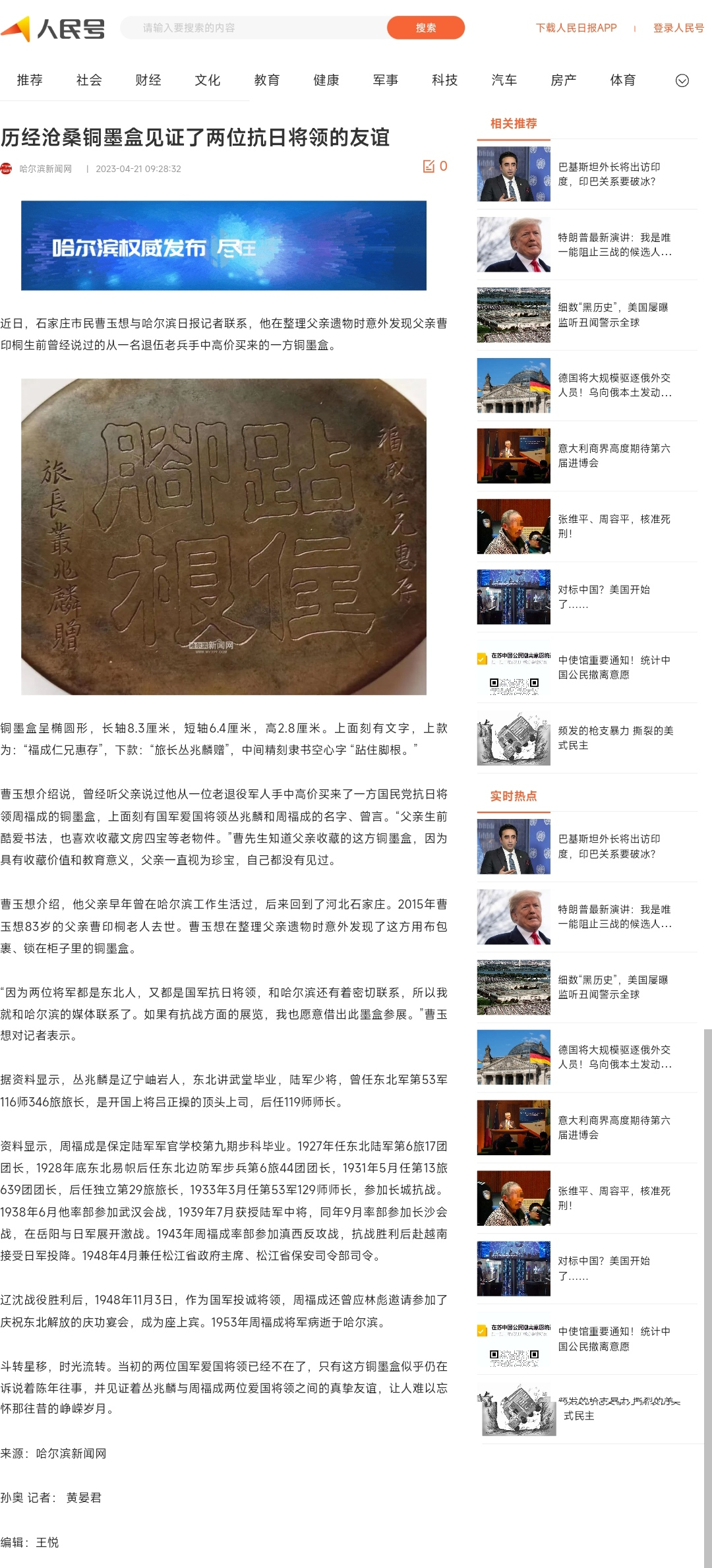 《人民号》历经沧桑铜墨盒见证了两位抗日将领的友谊