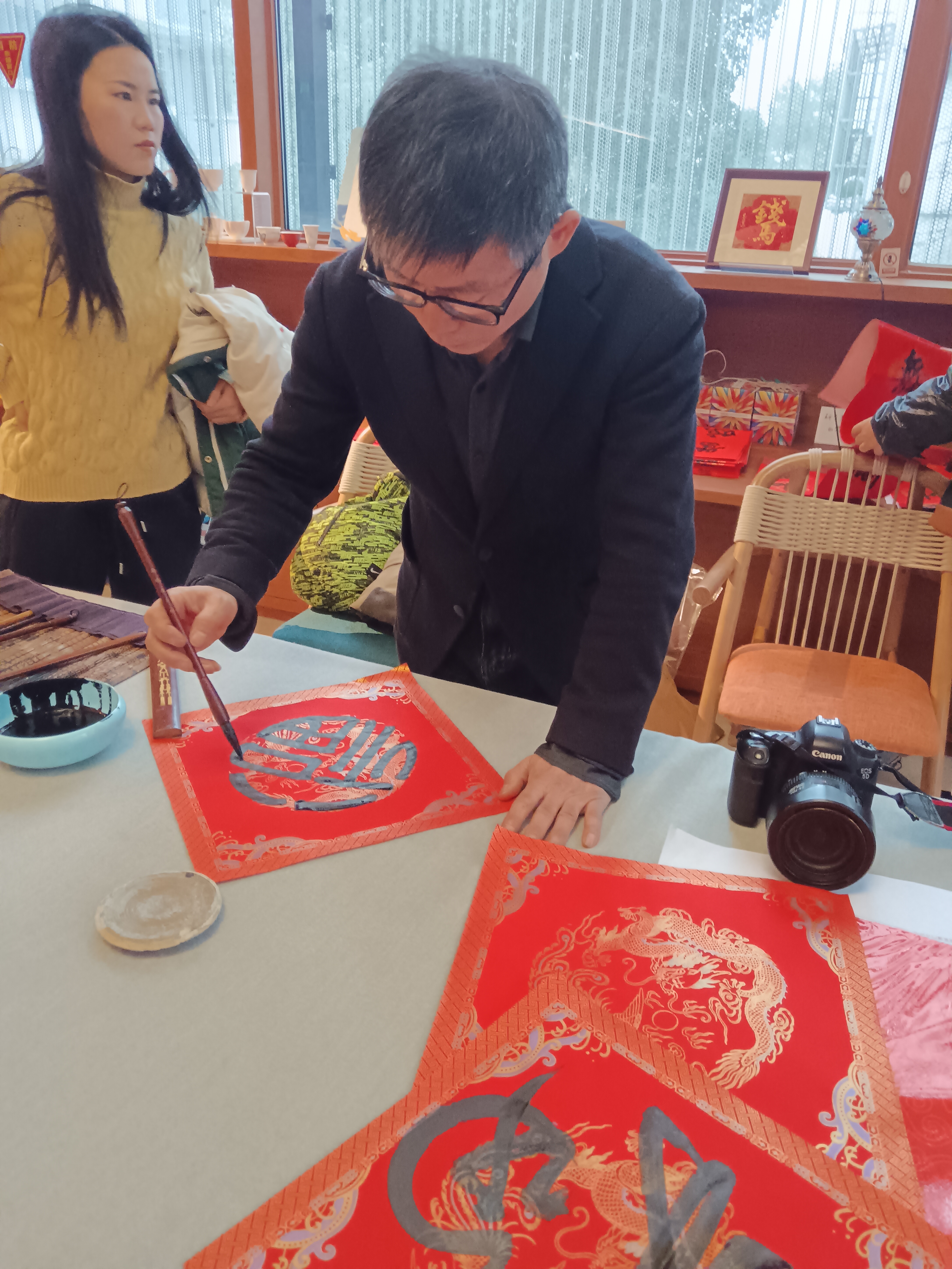 窗边阳光正好,红纸铺开,墨香四溢。看老师写福字,龙腾纸上,年味瞬间拉满,咔嚓定格这温暖一幕。