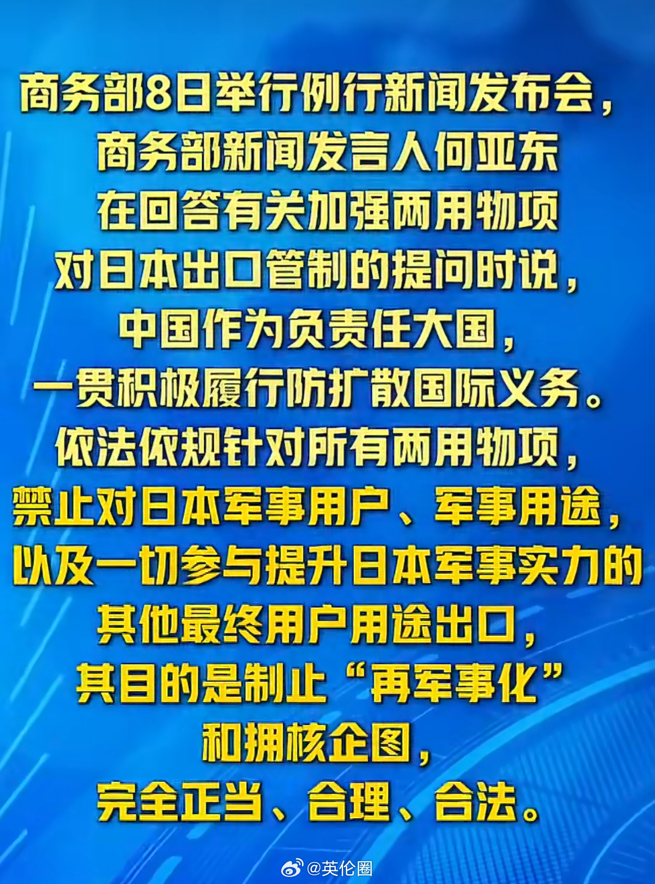 日本军事工业遭中国斩首 【中国军号: 中国为何对日发出严厉管制禁令 防止日本军国主义借尸还魂】 中国断供日本军事工业遭斩首 1月6日,商务部发布2026年第一号公告,明确加强对日本两用物项出口管制,核心可概括为三个“禁止”:禁止所有两用物项对日本军事用户出口;禁止用于日本军事用途;禁止任何有助于提升日本军事实力的最终用户和用途。 【管制力度空前:168页清单锁死关键】 所谓“两用物项”,指兼具民用与军用潜力的物品、材料、软件和技术。中国在2025年12月31日更新《两用物项和技术出口许可证管理目录》,新版清单厚达168页,涵盖高性能复合材料、精密机床、特种化学品、先进传感器、半导体设备及相关软件,几乎覆盖现代军工体系全部基础环节。 清单的体量与时点,表明这不是象征性表态,而是系统评估后的精准行动,既符合防扩散原则,也释放出明确信号:中国将以实际行动阻断军国主义复活的技术通道。 【断供即废功:核心命脉被精准狙击】此次并非泛化制裁,而是对日本军事工业的“外科手术式”打击,直指高性能材料供应链。 例如,中国掌控全球约85%的钐钴磁体产量。钐钴永磁体广泛用于卫星姿态控制、航天惯导、雷达系统等关键领域。美国防部报告亦指出,稀土永磁体是F-35战机、弗吉尼亚级潜艇、战斧导弹等核心部件。全球超85%的稀土冶炼与分离产能集中在中国,这意味着即便日本从他国进口稀土矿,其精炼仍高度依赖中国——这一次,不只是“无米之炊”,连“灶台”都被拿走。 再叠加钛及合金等关键材料纳入清单,短期将面临库存耗尽、成本飙升、工程停滞;长期重建独立供应链,资金、时间与技术门槛皆高不可攀。这把“锁喉之钳”,已精准卡住日本军事装备制造的咽喉。(北京日报)