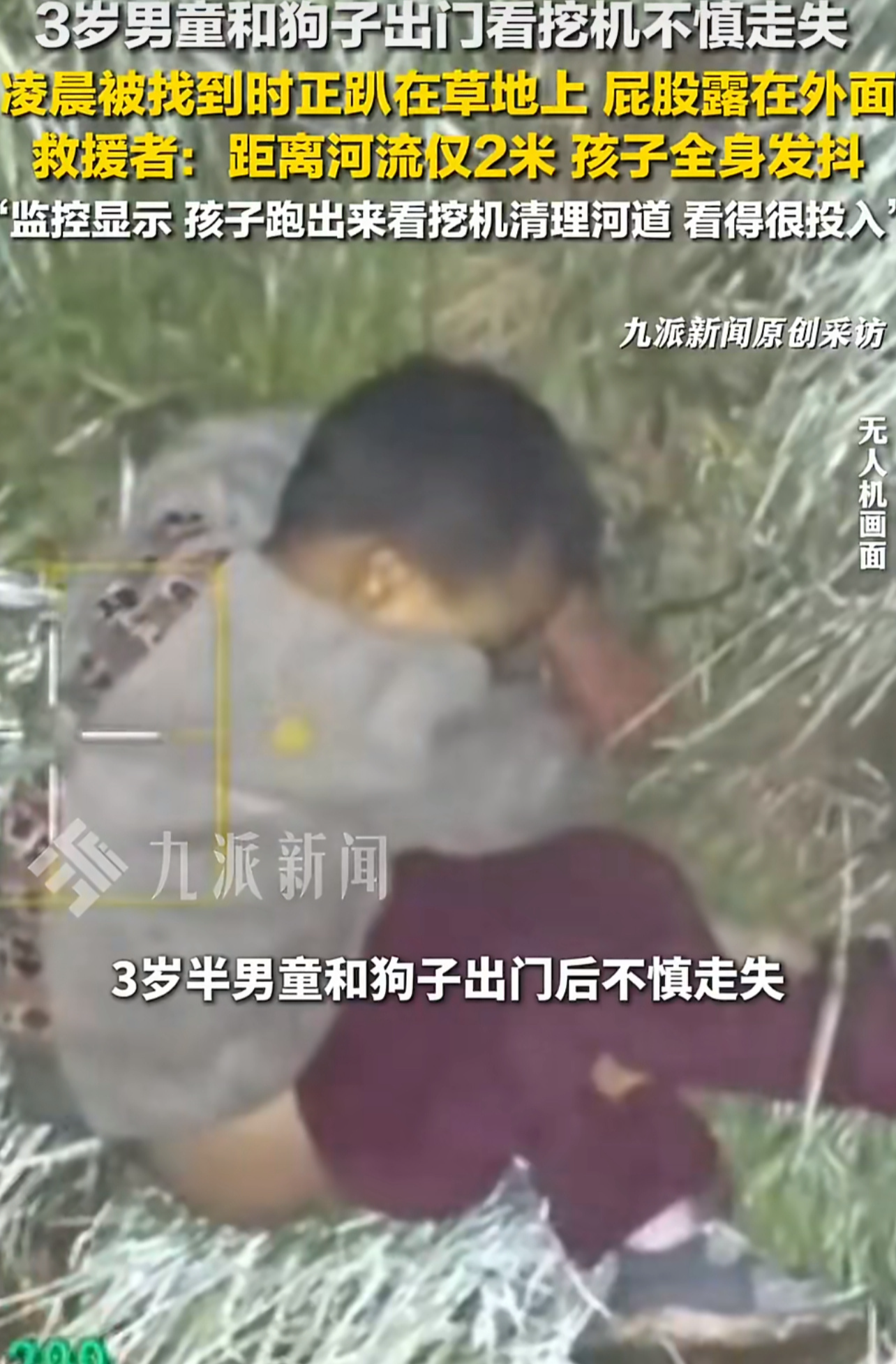 【3岁男童看挖机走失找到时出现失温】3岁男童和狗看挖机走失救援者发声,四川邻水。3岁半男童与家中狗子出门后不慎走失,救援队连夜搜寻6小时成功找回。 1月8日,参与救援的志愿者向 九派新闻 记者介绍,6日晚10点接到协助请求,调取监控后锁定大致范围,凌晨2点左右抵达现场,并通过无人机发现走失男童。孩子被找到时距离河流仅约2米。 当晚气温接近0℃,男童趴在草地上已出现失温反应,全身发抖、脸色发白,身上有擦伤,裤子脱落,情况较为危险。所幸发现及时,随后已安全交由家属。 志愿者回忆,监控显示男童是跟着家里的狗一起跑出来的,手里还拿着玩具卡车。河边当时有挖机清理河道,孩子看得十分投入,可能因此越走越远。