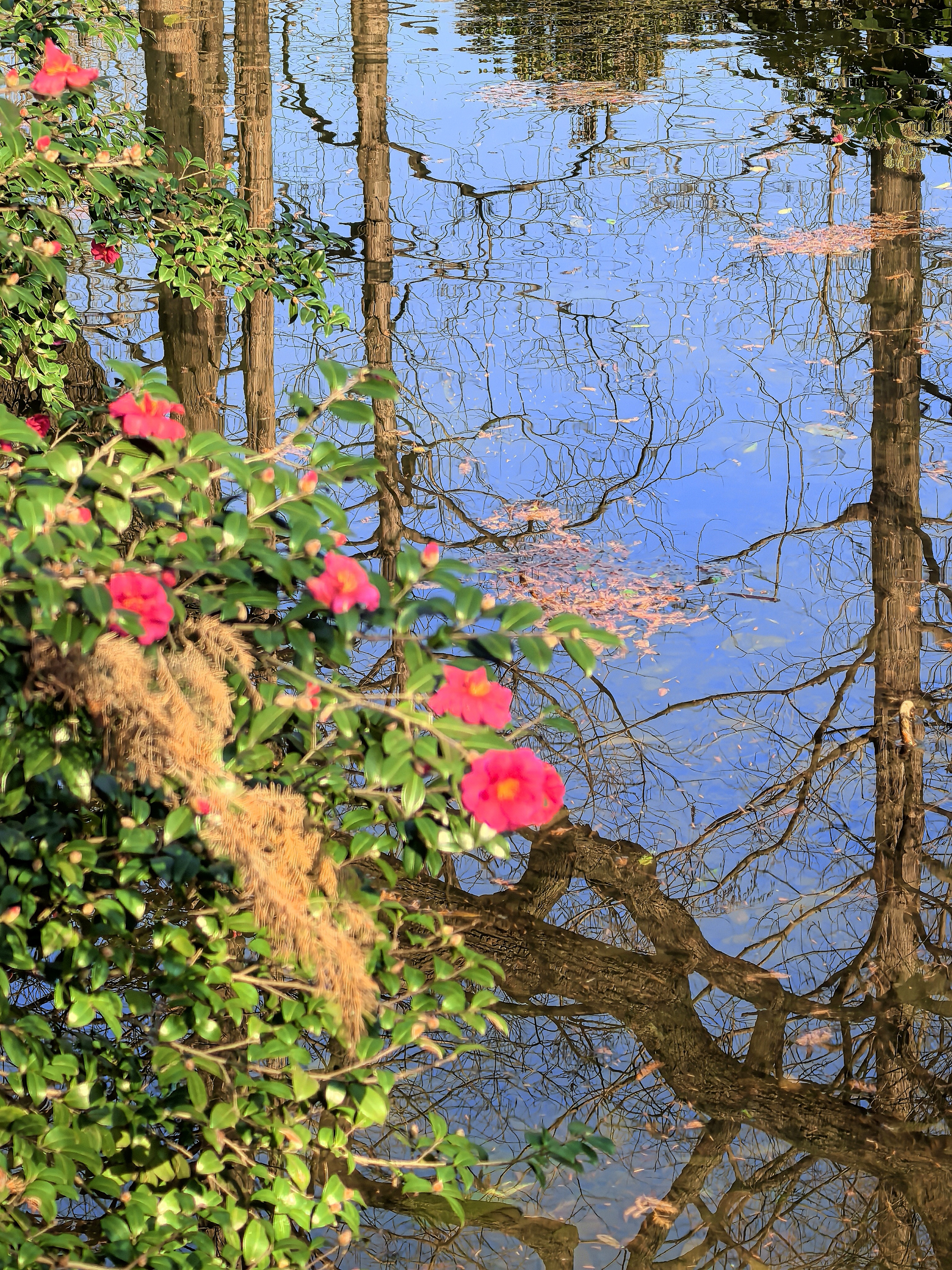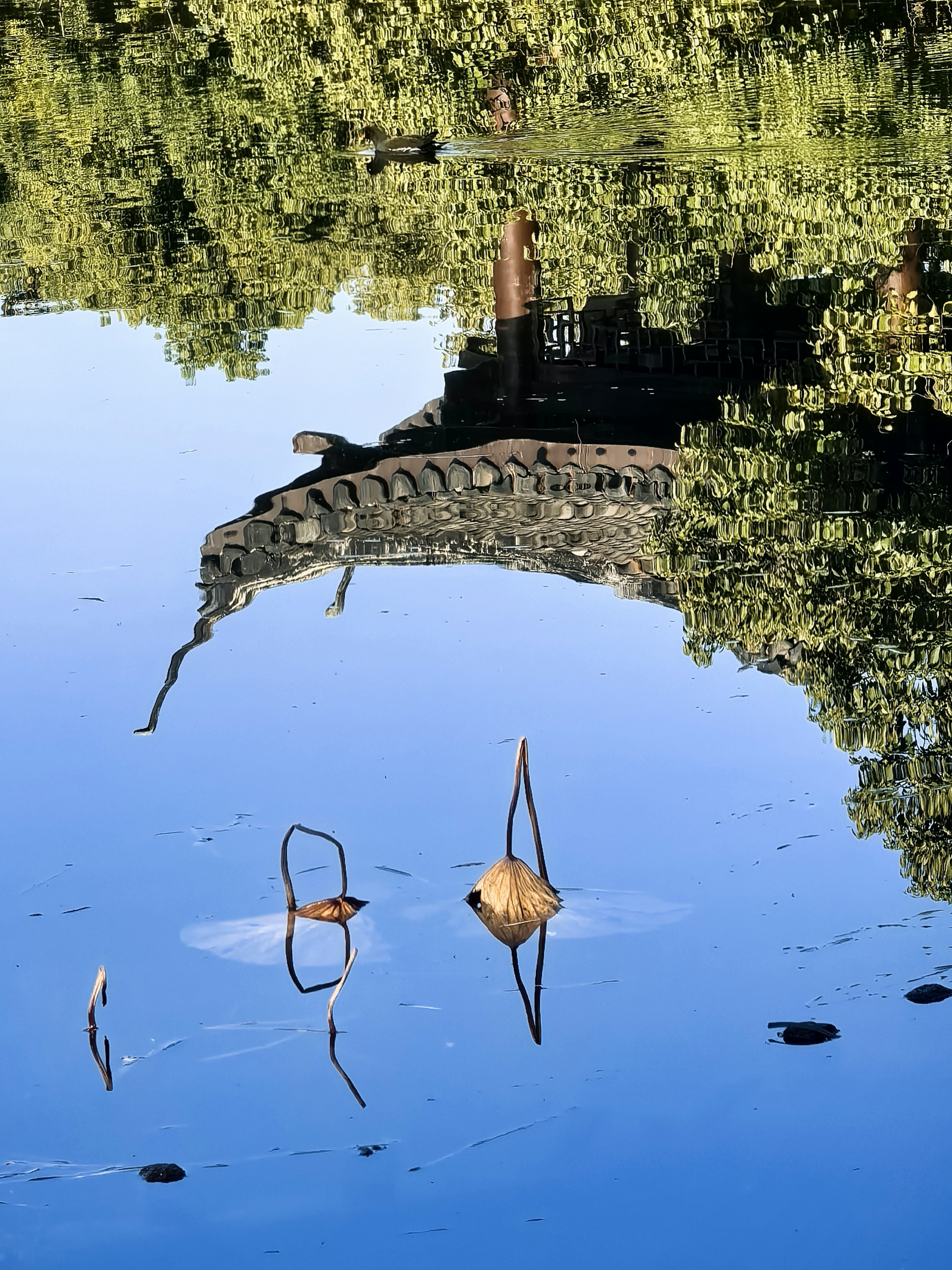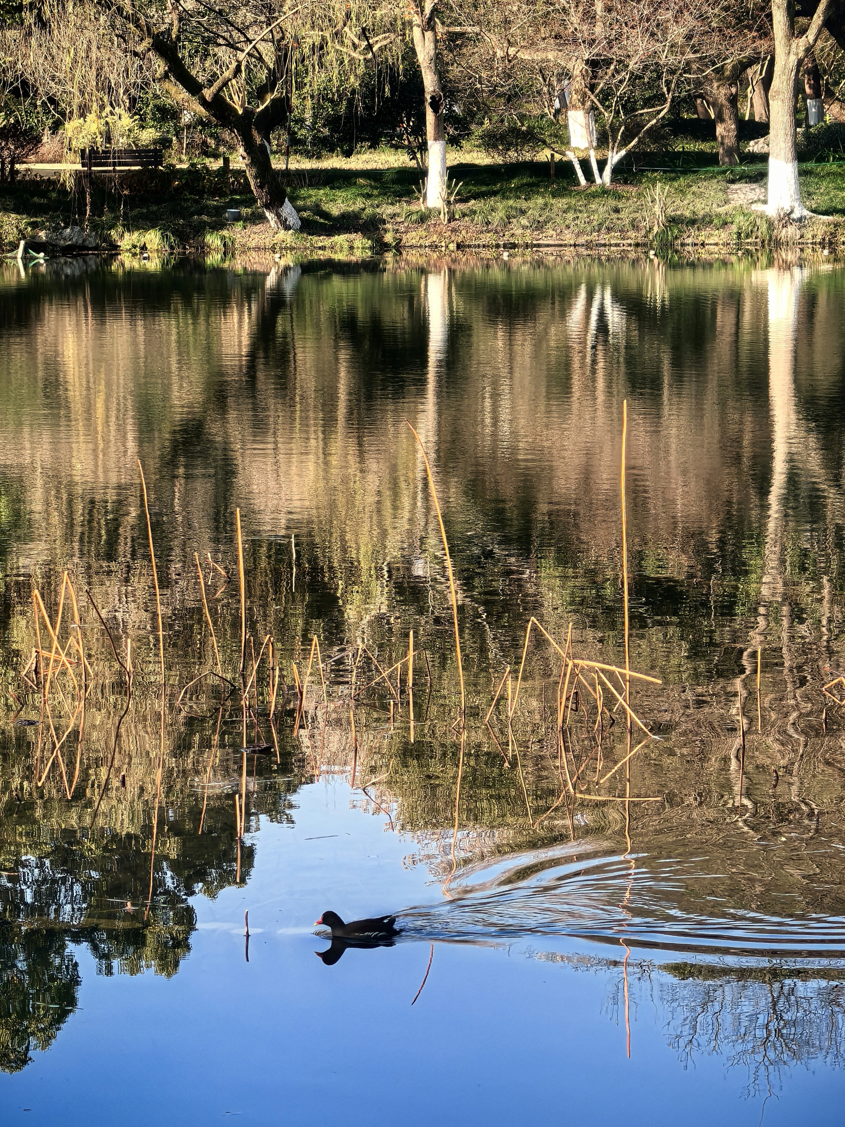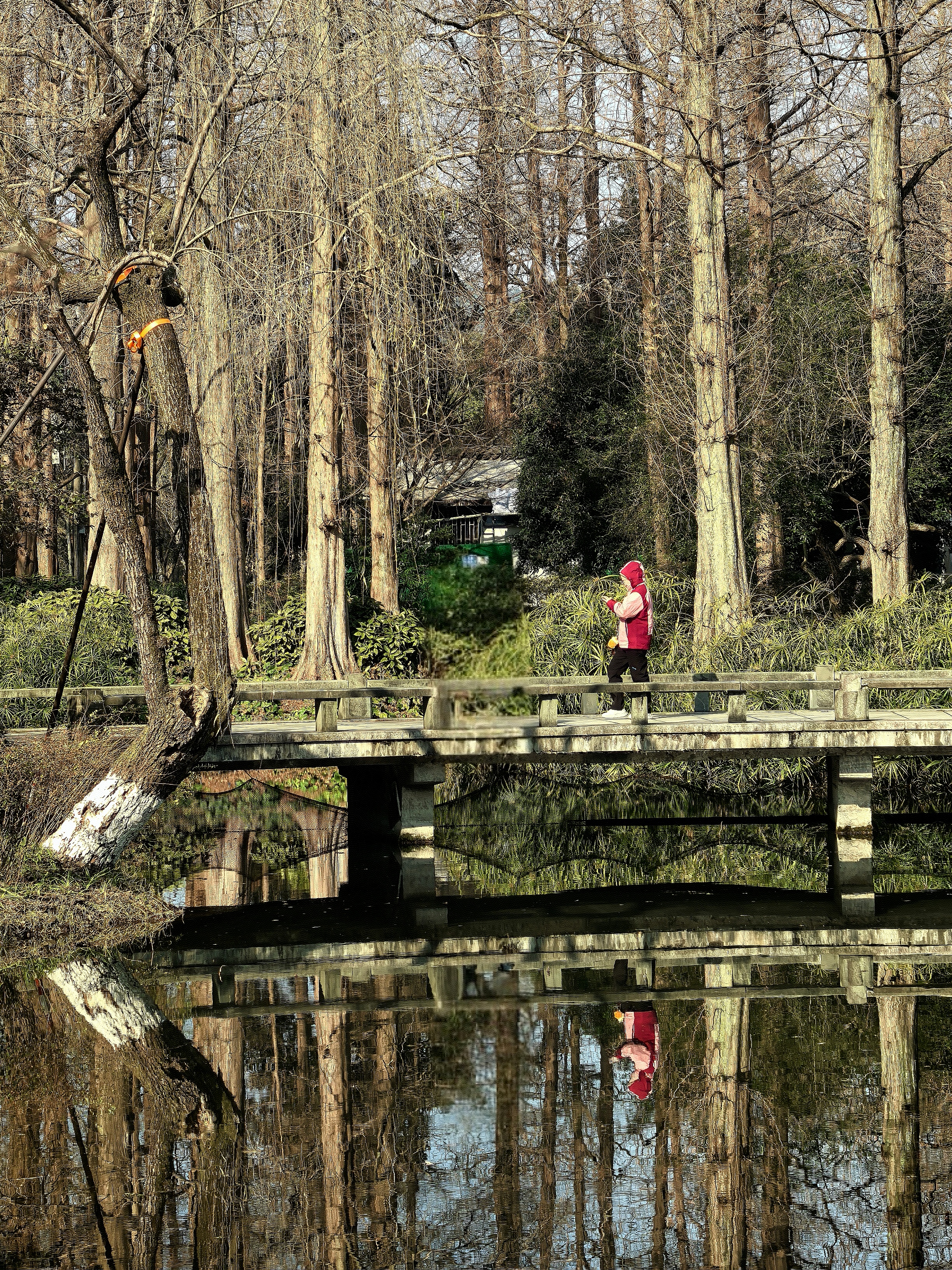 冬日的曲院风荷,是一轴缓缓铺展的水墨长卷。湖水沉静如墨玉,将天地万物温柔地拥入怀中。湖上的涟漪揉碎了岸树的形影,光秃的枝桠是遒劲的笔锋,残留的绿意是未干的淡彩,树干下那一圈圈雪白的防冻灰,仿佛是冬阳特意留下的吻痕。 亭台的飞檐在水中勾勒出黛色的曲线,与枯荷瘦梗的寂寥线条相偎;忽而有黑水鸭巡游而过,漾起粼粼的柔纹,水底的朱栏彩檐便随着光影微微颤动,恍如梦境。 这一带有许多的水杉林,都褪去了之前暗红色的羽杉叶,一株株瘦削的树梢伸向水里,水影微澜中好像还在赛着各自的身影,哪个更苗条一些。 最惊艳是那一簇茶花的倒影,炽烈的绯红在青灰的调子里泅开,像是寂静岁月里不肯熄灭的灯火。风来时,影就碎了,一切又渐渐聚拢成画。 我突然想起刘欢的老歌:“天上有个太阳 水中有个月亮,我不知道, 我不知道,那个更圆, 那个更亮”。在这虚实交错的光影中,西湖正以它独有的方式,在湖上和湖下低声吟唱着冬日最深沉的小调,不知你听见了没有?