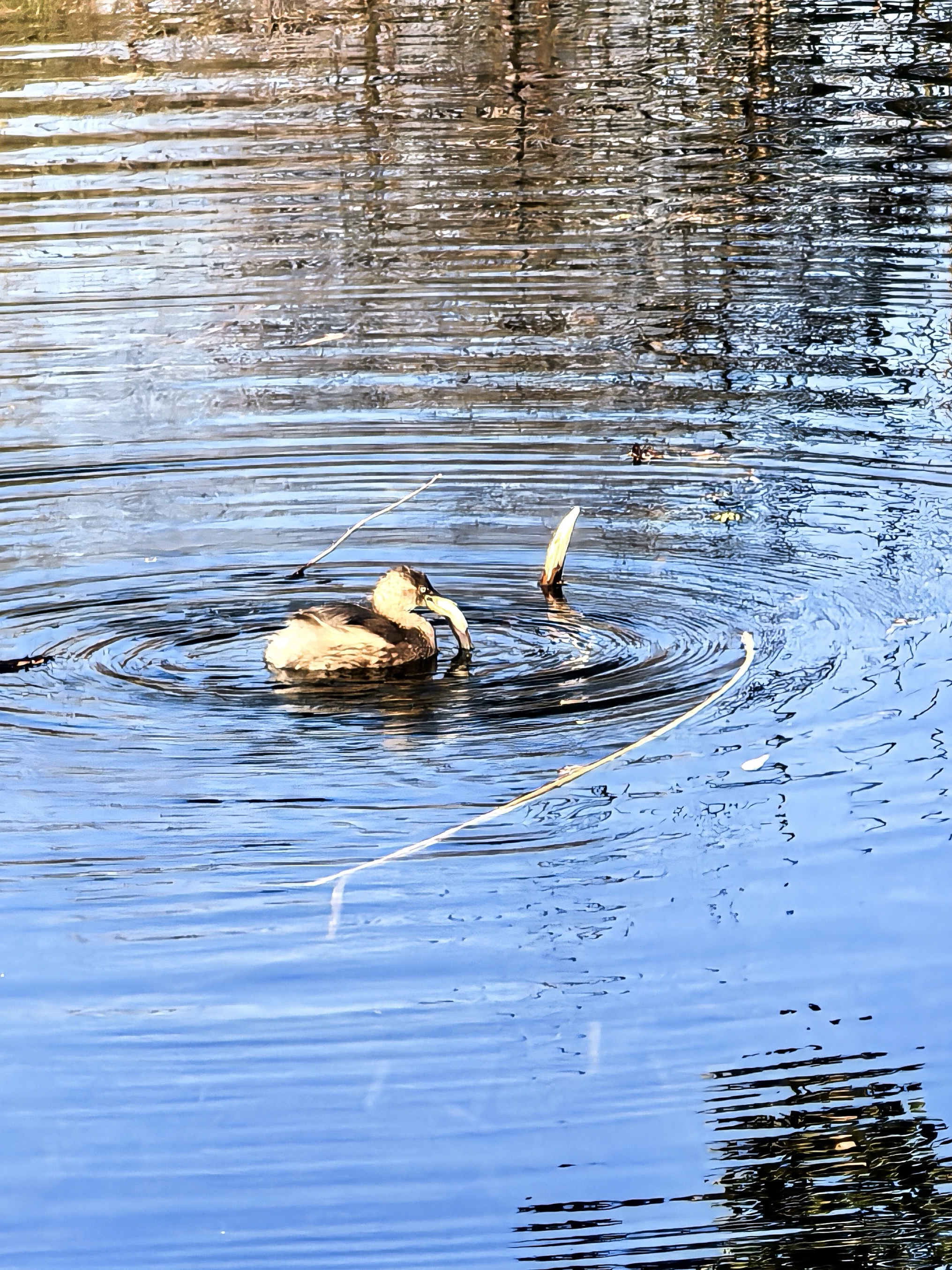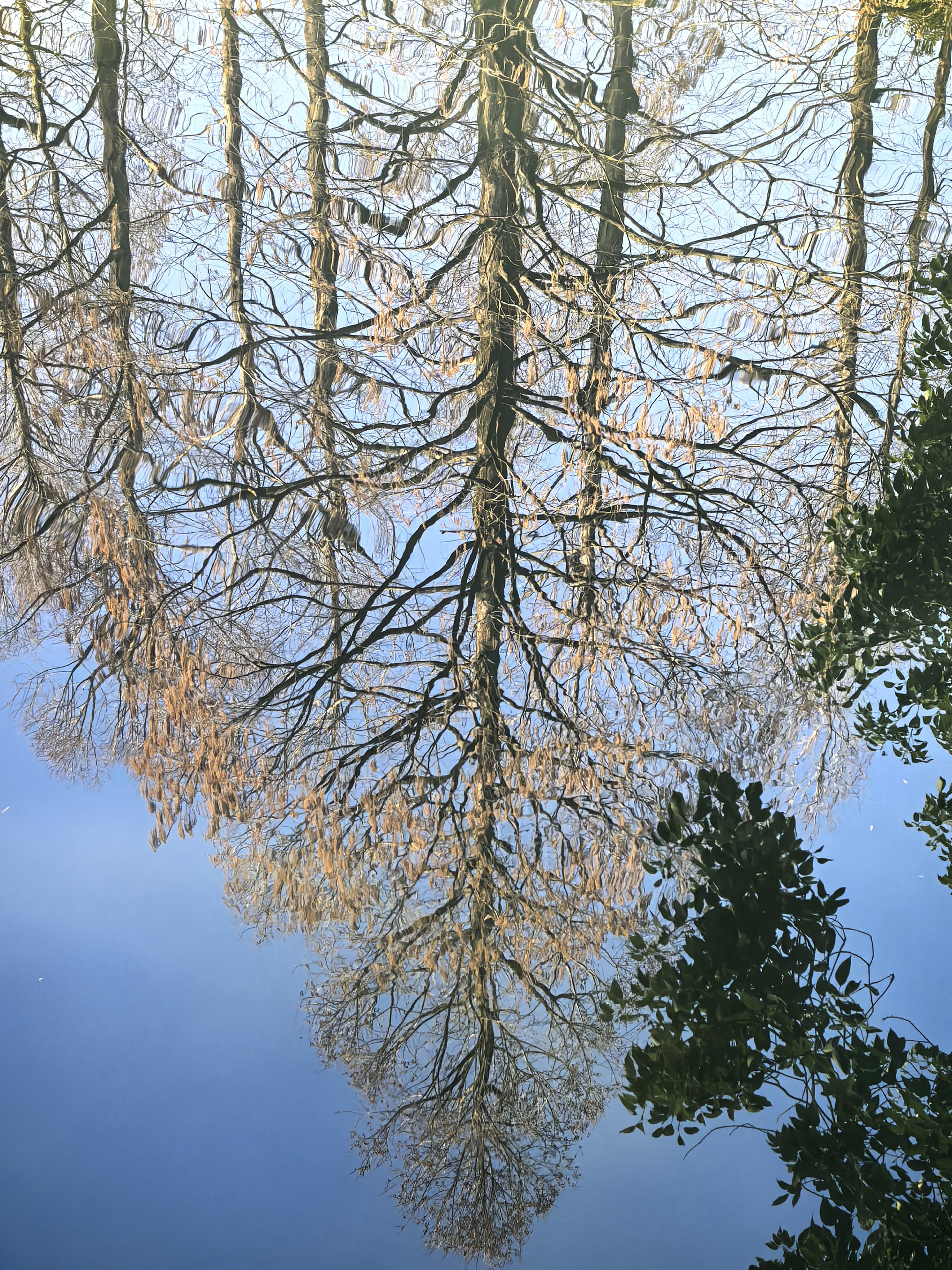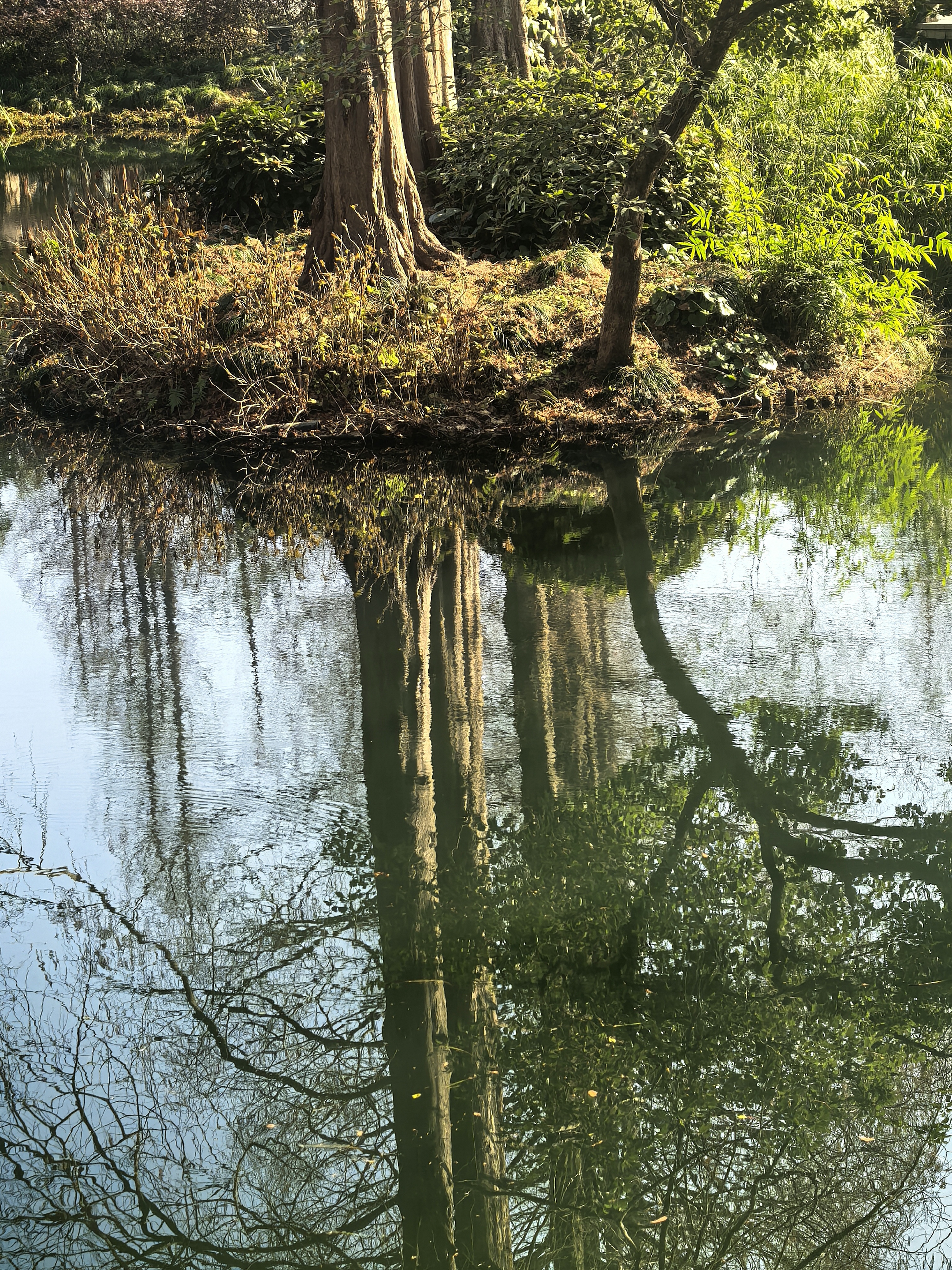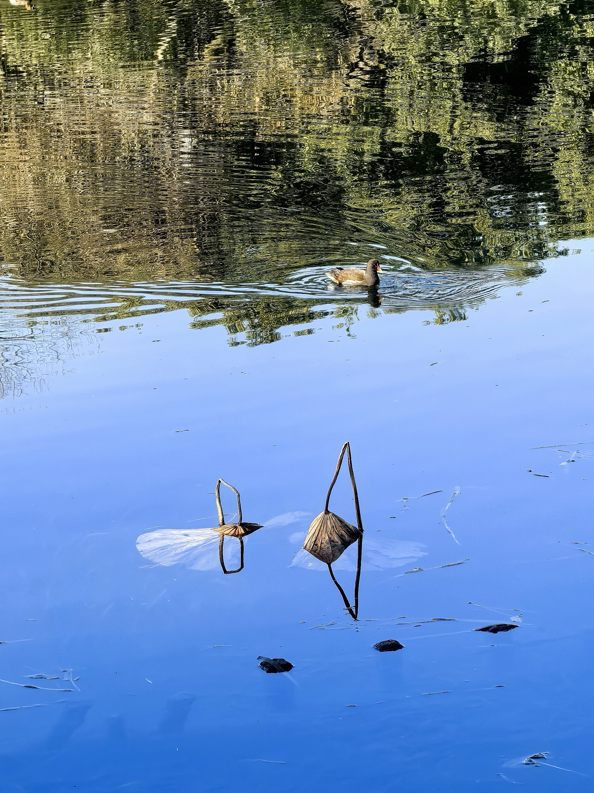 冬日的曲院风荷,是一轴缓缓铺展的水墨长卷。湖水沉静如墨玉,将天地万物温柔地拥入怀中。湖上的涟漪揉碎了岸树的形影,光秃的枝桠是遒劲的笔锋,残留的绿意是未干的淡彩,树干下那一圈圈雪白的防冻灰,仿佛是冬阳特意留下的吻痕。 亭台的飞檐在水中勾勒出黛色的曲线,与枯荷瘦梗的寂寥线条相偎;忽而有黑水鸭巡游而过,漾起粼粼的柔纹,水底的朱栏彩檐便随着光影微微颤动,恍如梦境。 这一带有许多的水杉林,都褪去了之前暗红色的羽杉叶,一株株瘦削的树梢伸向水里,水影微澜中好像还在赛着各自的身影,哪个更苗条一些。 最惊艳是那一簇茶花的倒影,炽烈的绯红在青灰的调子里泅开,像是寂静岁月里不肯熄灭的灯火。风来时,影就碎了,一切又渐渐聚拢成画。 我突然想起刘欢的老歌:“天上有个太阳 水中有个月亮,我不知道, 我不知道,那个更圆, 那个更亮”。在这虚实交错的光影中,西湖正以它独有的方式,在湖上和湖下低声吟唱着冬日最深沉的小调,不知你听见了没有?
