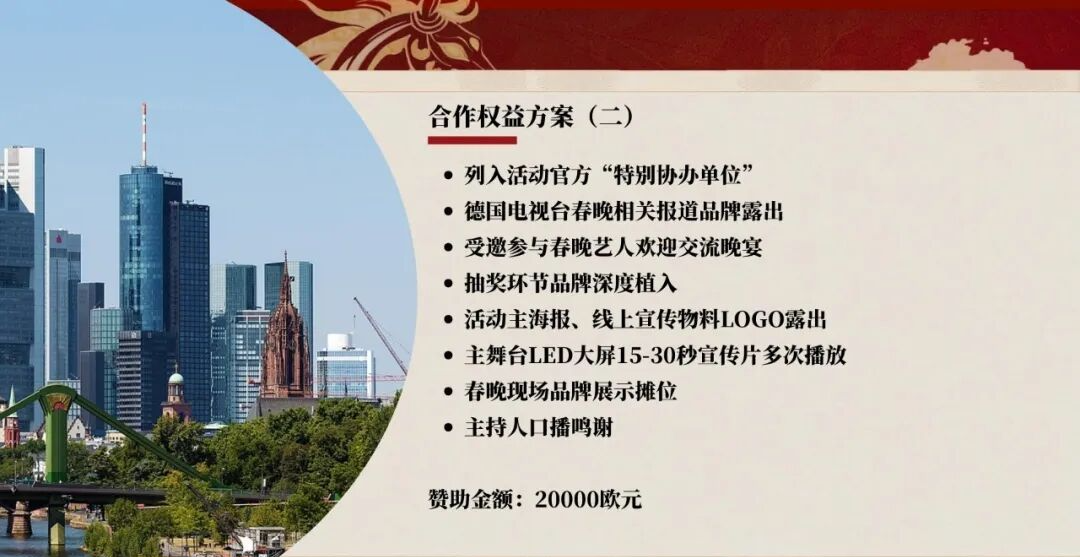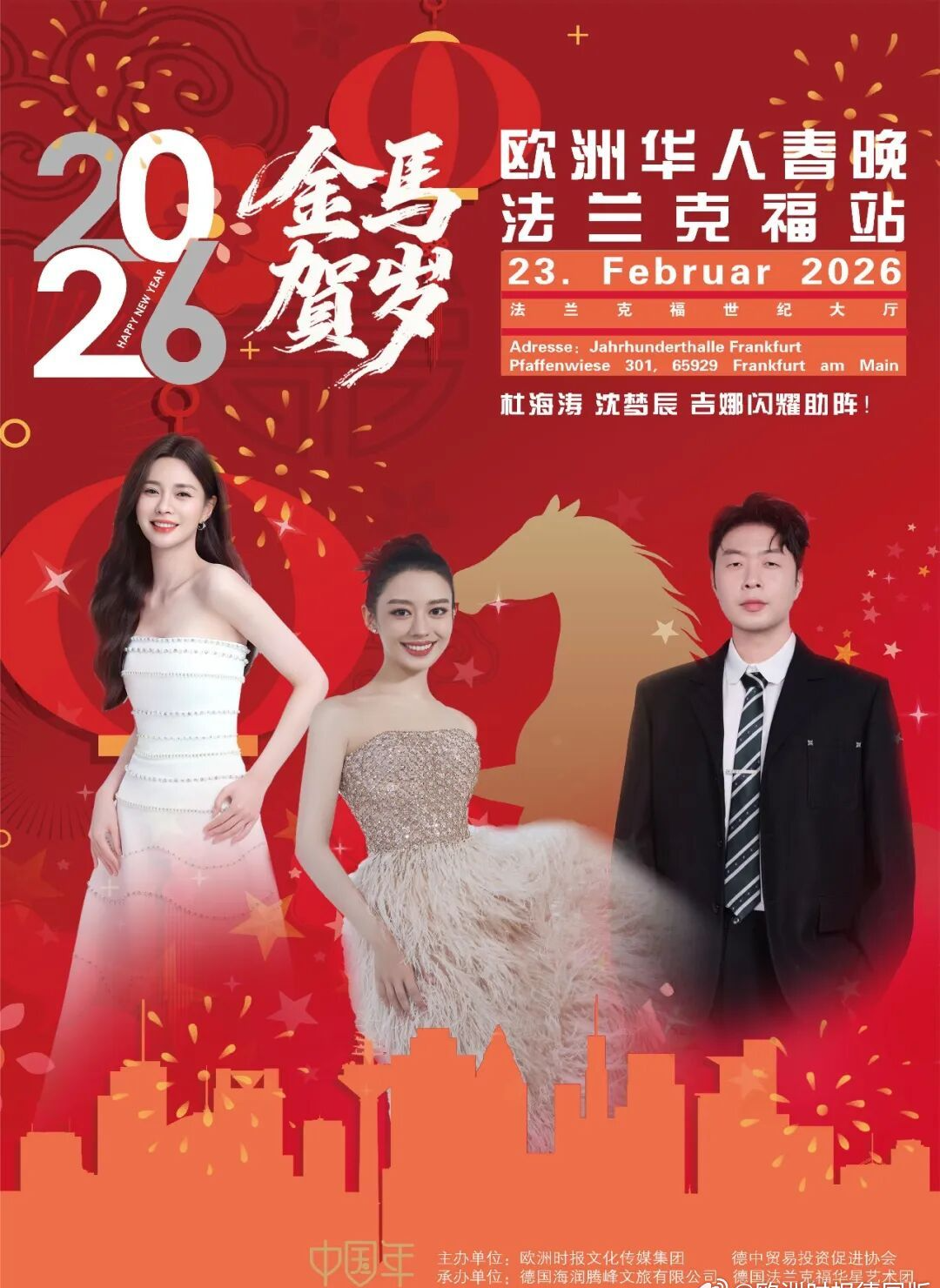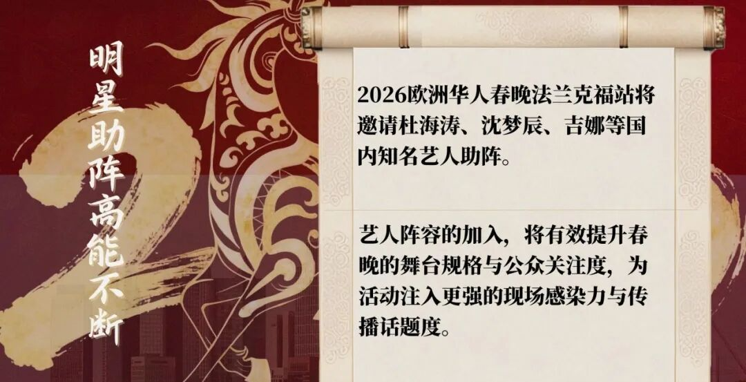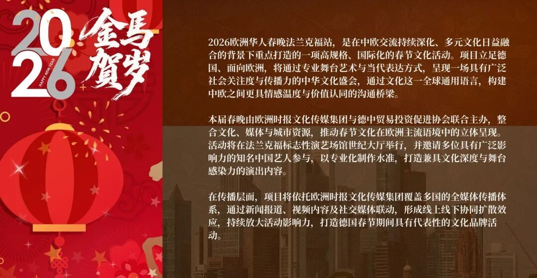 2026欧洲华人春晚!杜海涛×沈梦辰×吉娜 陪你过大年啦 谁懂!在欧洲过年总缺家里那股热闹劲儿 2026春节不用羡慕国内啦!华人专属盛大春晚来啦 ✨ 2026欧洲华人春晚·法兰克福站 时间:2026年2月23日 地点:世纪大厅(欧洲顶级演艺场馆!) 这夜直接拉满“年味+团圆”,在欧洲也能沉浸式过年! 必冲理由戳这里! ▫️ 明星空降嗨翻全场! 杜海涛、 沈梦辰、 吉娜爱丽丝Gina 领衔,还有神秘嘉宾惊喜现身~ 近距离互动狂欢,过年仪式感拉满! ▫️ 顶级舞台视听盛宴!世纪大厅见证过无数世界级演出,国内顶级歌舞团不间断表演,全程高能! ▫️ 美食自由一站式get!下班直接冲,无需转场!现场有传统美食摊:豆腐脑、Q弹鱼丸、香酥小酥肉… 边吃边看,嘴上香心里暖~ ▫️ 笑点密集不冷场!超会唠的青年脱口秀演员加盟,笑着迎新年! 重点预告! 节目单、票务信息之后放送!想蹲的宝子关注+留言,出来挨个踢~ 招商通道开启!品牌速来对接 明星光环加持+线下+全媒体流量矩阵,高触达、高停留、高记忆点,轻松拿捏节日流量红利! 想让品牌贴合春节氛围、牵手明星、触达欧洲华人的,速来对接! 提供灵活合作方案,一起打造2026最闪耀的春节舞台! 宝子们~这波春节狂欢别错过!约上小伙伴热闹过大年~ 品牌大大们也别错失这泼天的流量呦!