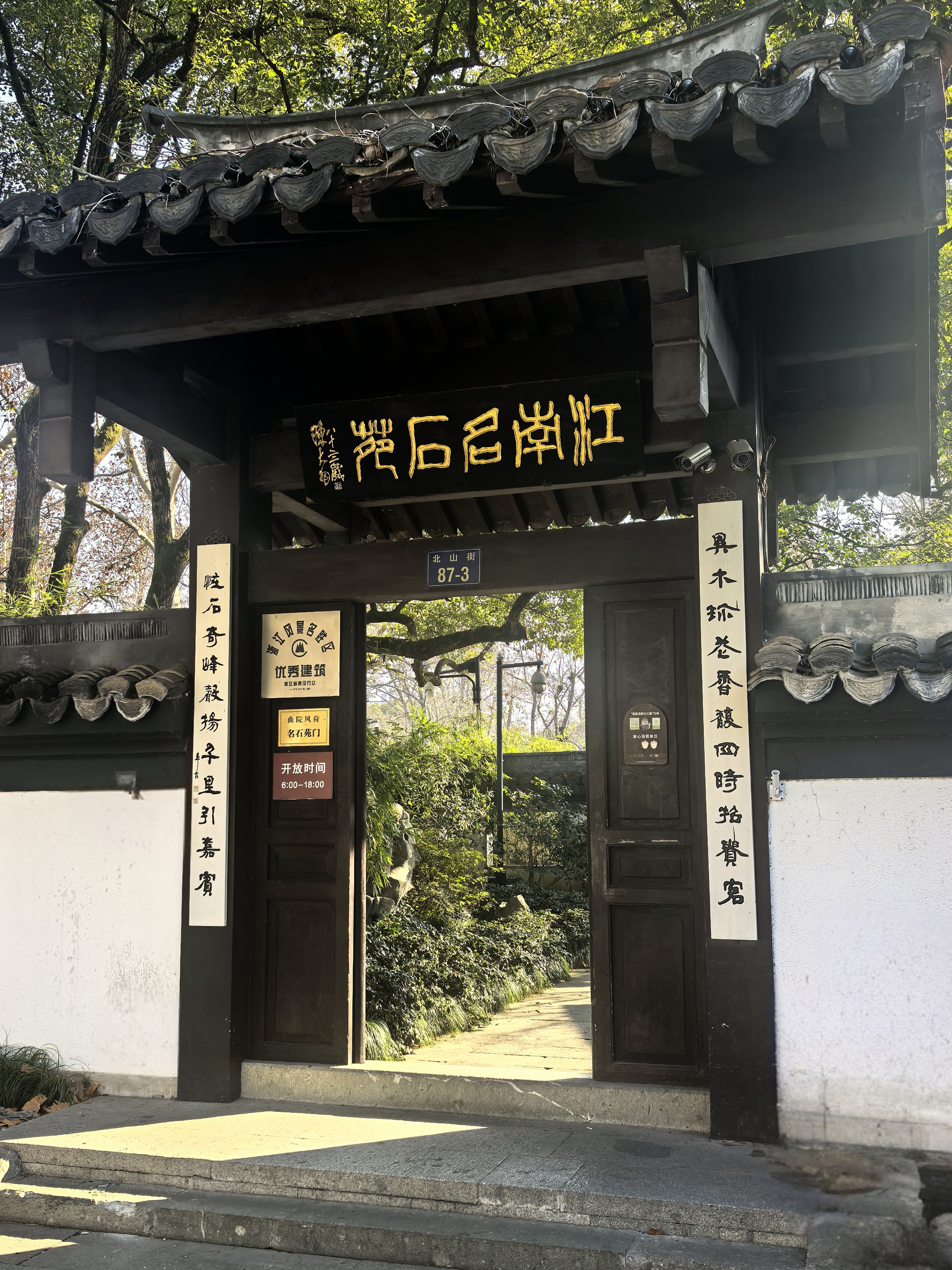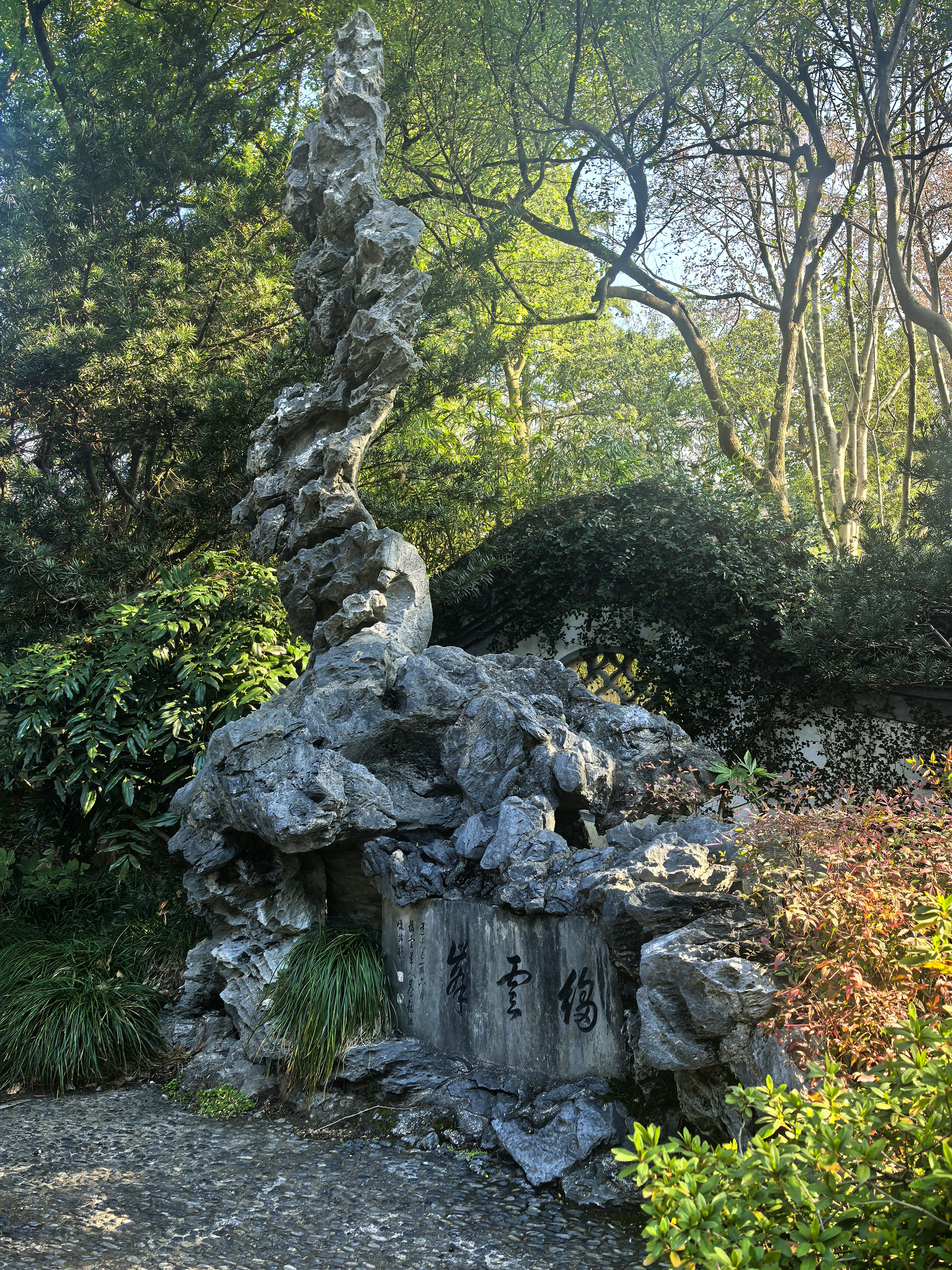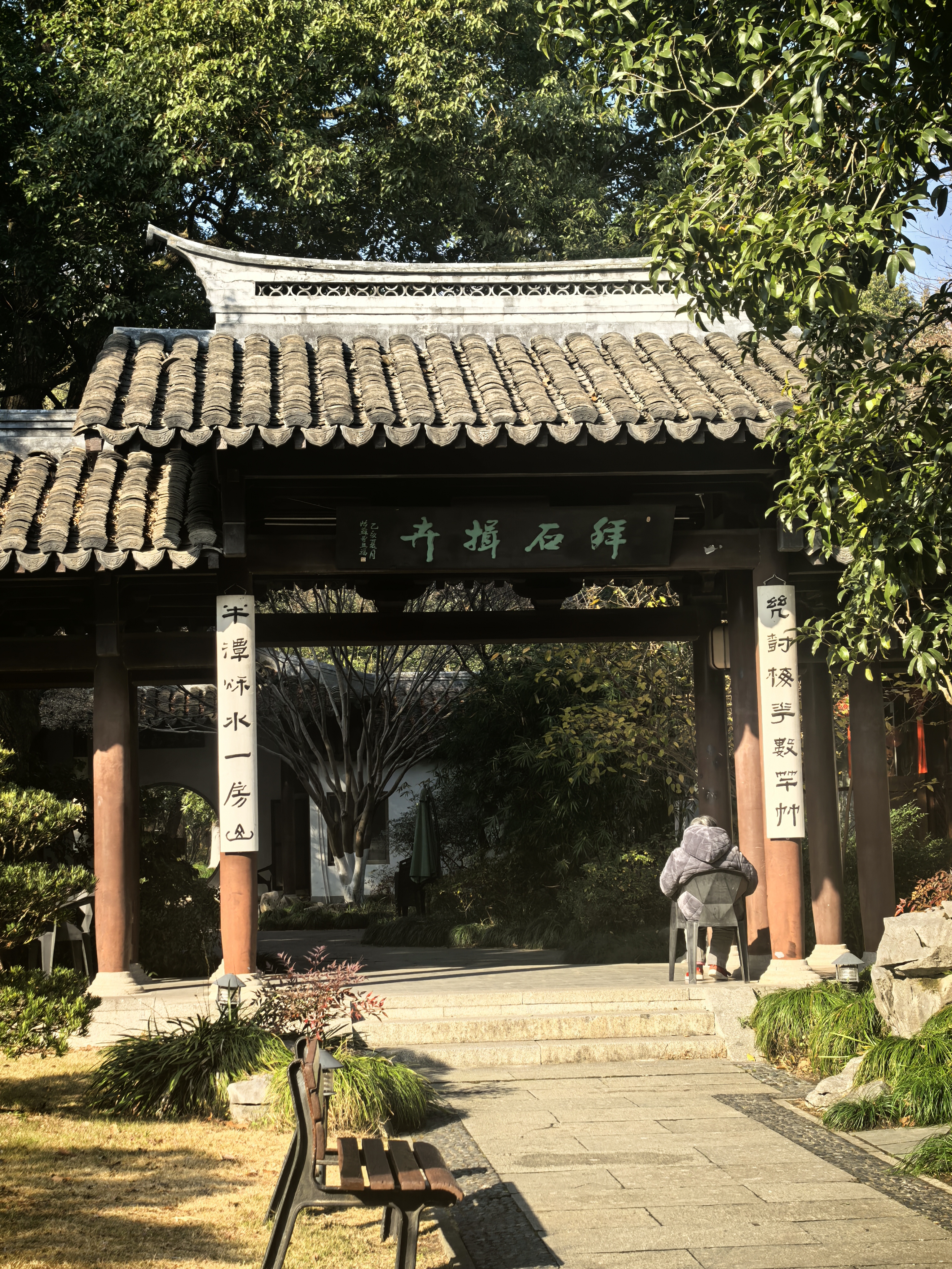 竹素园是曲院风荷的园中园,一般人不会太在意。尤其是旅游淡季,这里更像是一方被时光遗忘的净土,园内几乎见不到几个游人,但见一二个人在廊下晒着太阳,一片静谧恬淡的气氛萦绕着这片樟树蓊郁的小园。 可是,在清代时这里是大名鼎鼎的湖山春社所在地,雍正九年(1731)由浙江巡抚李卫所造,当时凿池置石,构筑亭轩,栽培四时花木,引桃溪清流,屈曲环注,有曲水流觞之意,是当时的西湖十八景之首。 那时湖山春社是以花神庙祭花神和“曲水流觞”为主题的活动场所,非常热闹。后来,乾隆皇帝南巡杭州,到“湖山春社”游览小憩,写下了“面水背山地,涵今茹古园。娱情惟翰墨,扑鼻有兰荪。 会景皆诠理,沿波欲讨源。白苏胥未识,诗句向谁论”的诗句,并御书匾额“竹素园”悬于正中堂上,所以改名为“竹素园”。 园内,江南奇石绉云峰静静伫立。它作为三大江南奇石之一,以独特的造型和纹理吸引着无数目光。其峰峦起伏、沟壑纵横,似一幅天然的水墨画卷,让人不禁感叹大自然的鬼斧神工。 草坪上,往昔常有人在此拍摄婚纱写真,新人们的欢声笑语仿佛还在耳边回荡。冬日的清淡让这里更显空灵。餐厅依旧静静立着,春秋时节常有老同志活动聚餐的热闹场景。 在冬日的竹素园里徜徉,每一处角落都诉说着过往的故事,让人在时光流转中,品味历史的韵味。