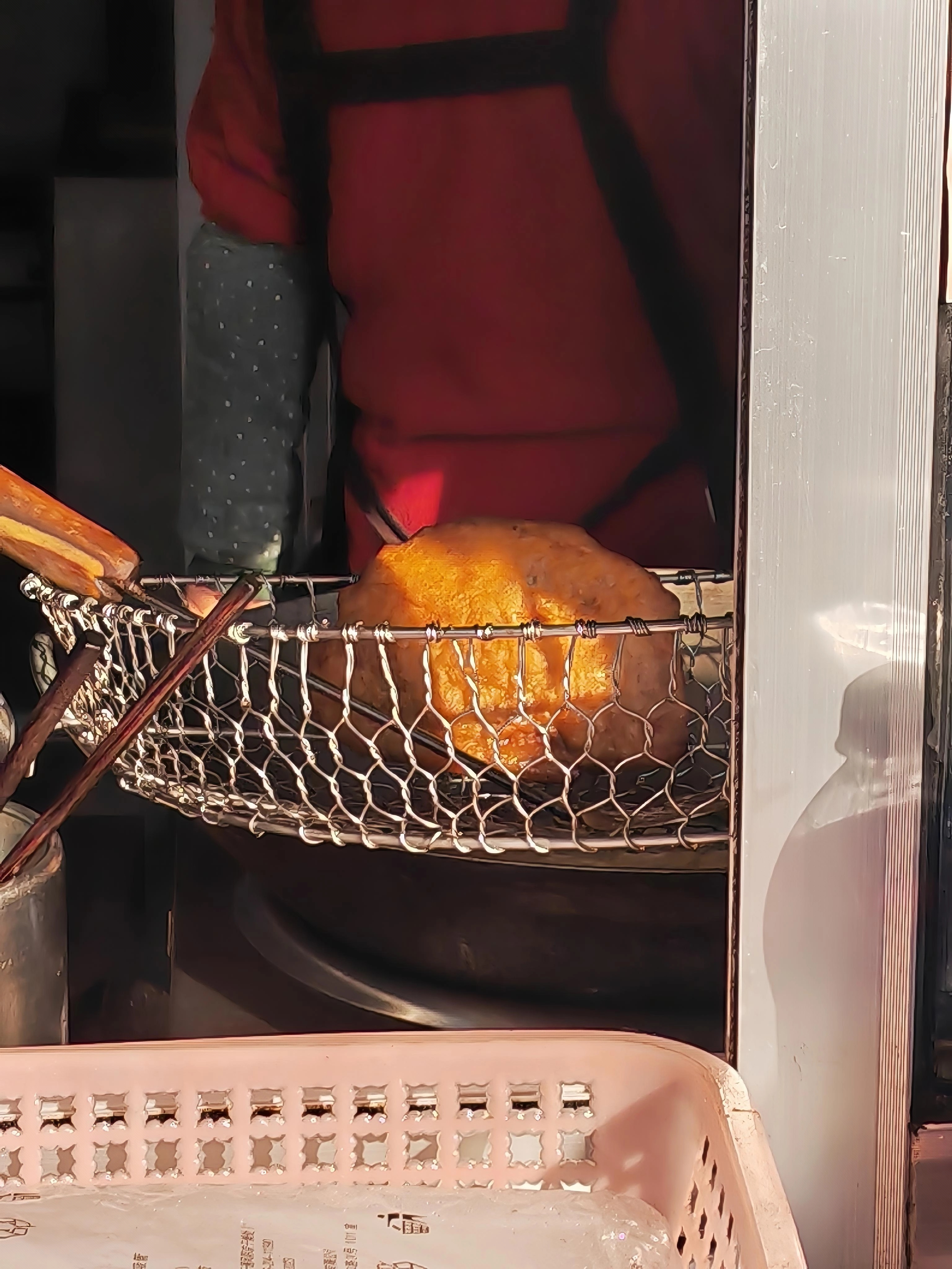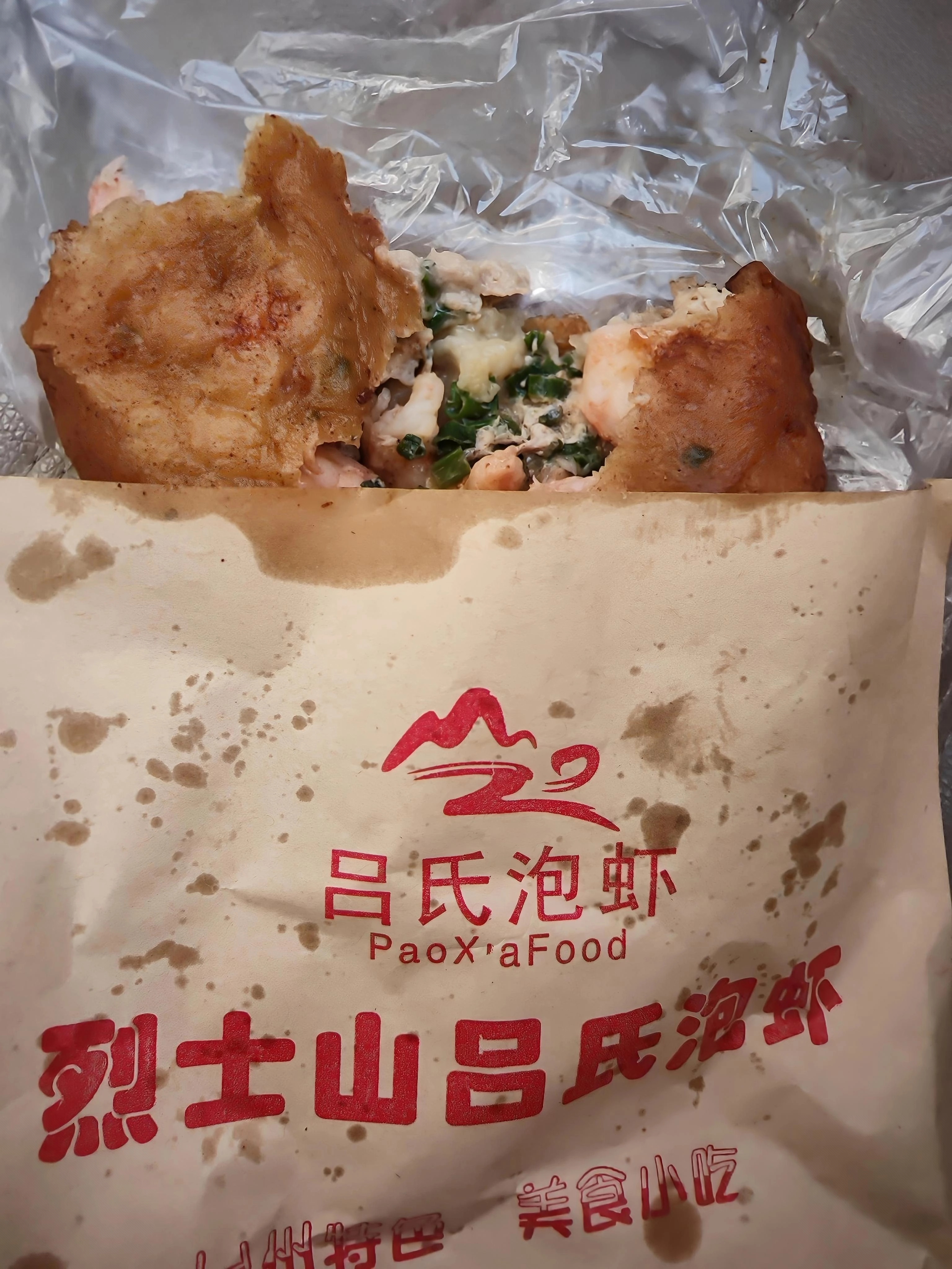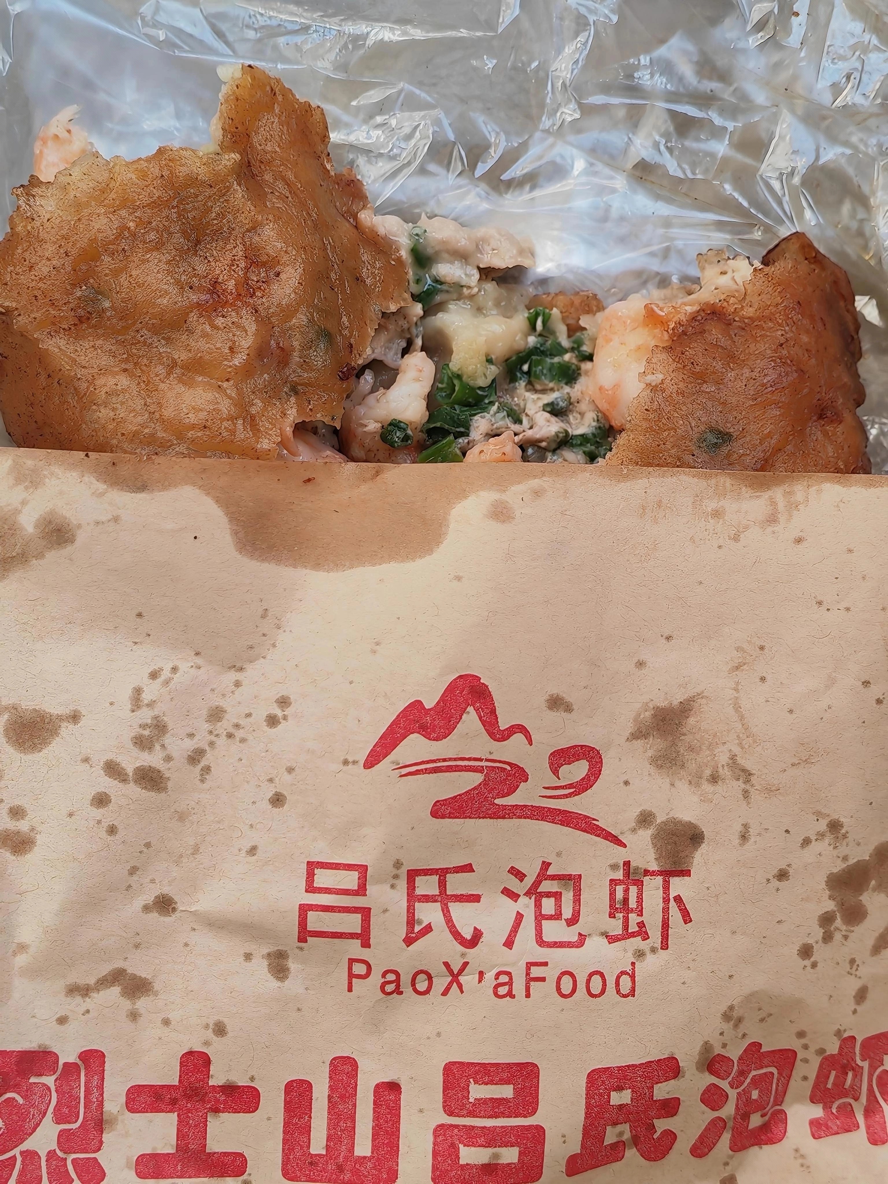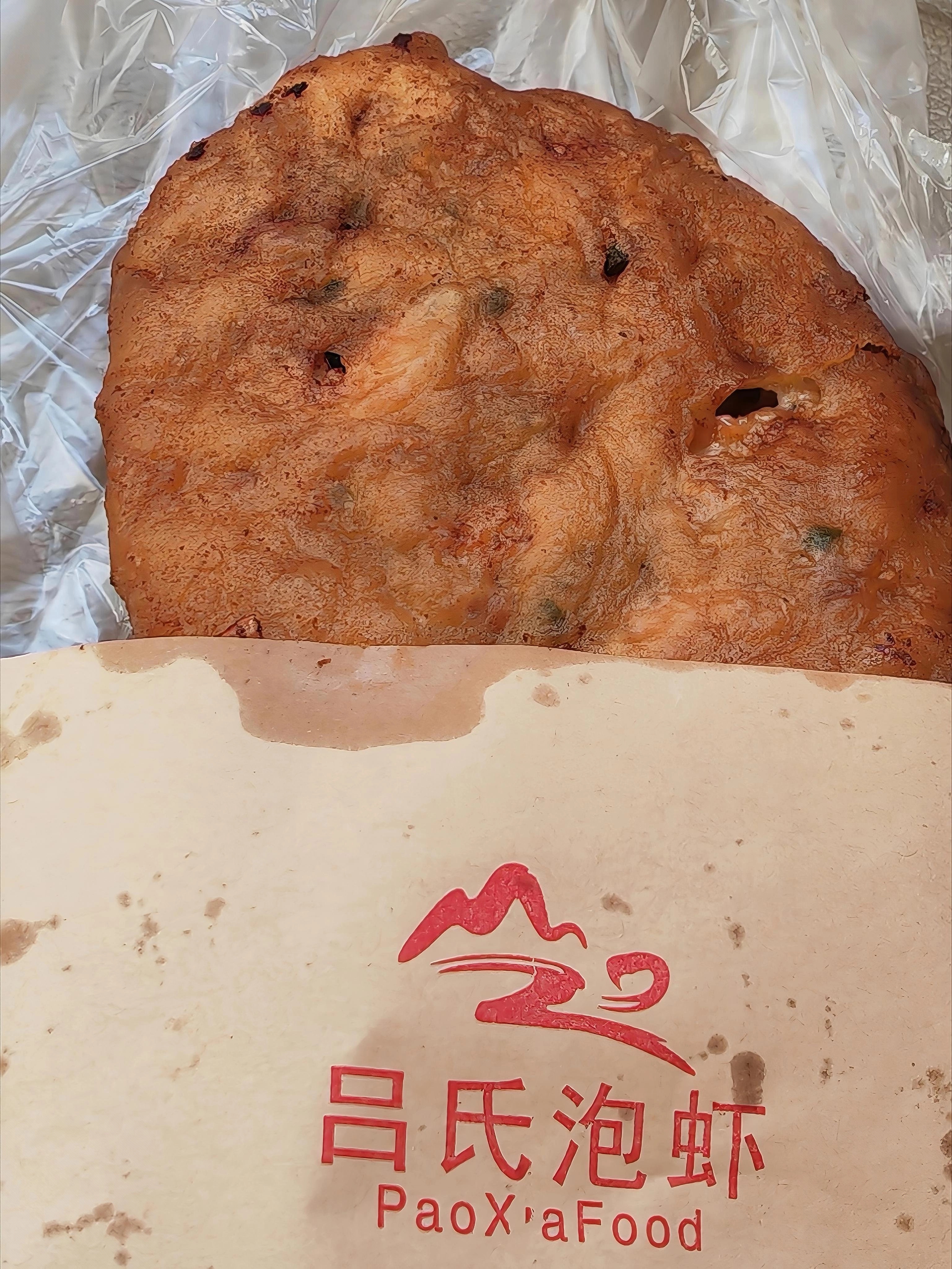 陵园路有间烈士山下泡虾🦐老店,很是出名,央视春晚还推荐过,但附近的市立医院几年前搬迁了,也不知这间泡虾店是不是还开着。带着疑问驾车来到陵园路,往日车满为患的停车位上空空如也,打开车门远远就闻到了间有烧油条、烤里脊、烤鱿鱼的诱人浓香,知道这间泡虾老店还在营业。前面等有2位女士和一位先生,还有一位在隔壁享用小吃的食客定了一只,我在忙着拍照时后面又来一位,我才想起慌忙先定一只。泡虾是台州特色小吃,属油炸类面食,舀一杓稀薄的面糊,倒入翻滚的油锅里慢慢地炸,大概有浸泡于滚油之意。至于虾,则有点费解,不知是不是确也有包裹有大虾,还油炸成稍发紫之面块形似大虾🦐,反正我们童年记忆中吃的泡虾大多无虾,偶尔奢侈一回,才有虾。当然,更无肉。现在工艺改进了,基础版就是包裹了厚厚的肉末,还可加虾,又可加鱿鱼。我点的是加肉加虾,没要辣。我在重庆吃过10余年的麻辣火锅,吃辣自然不在话下,但我没点辣,要的就是接近童年记忆中的味道。