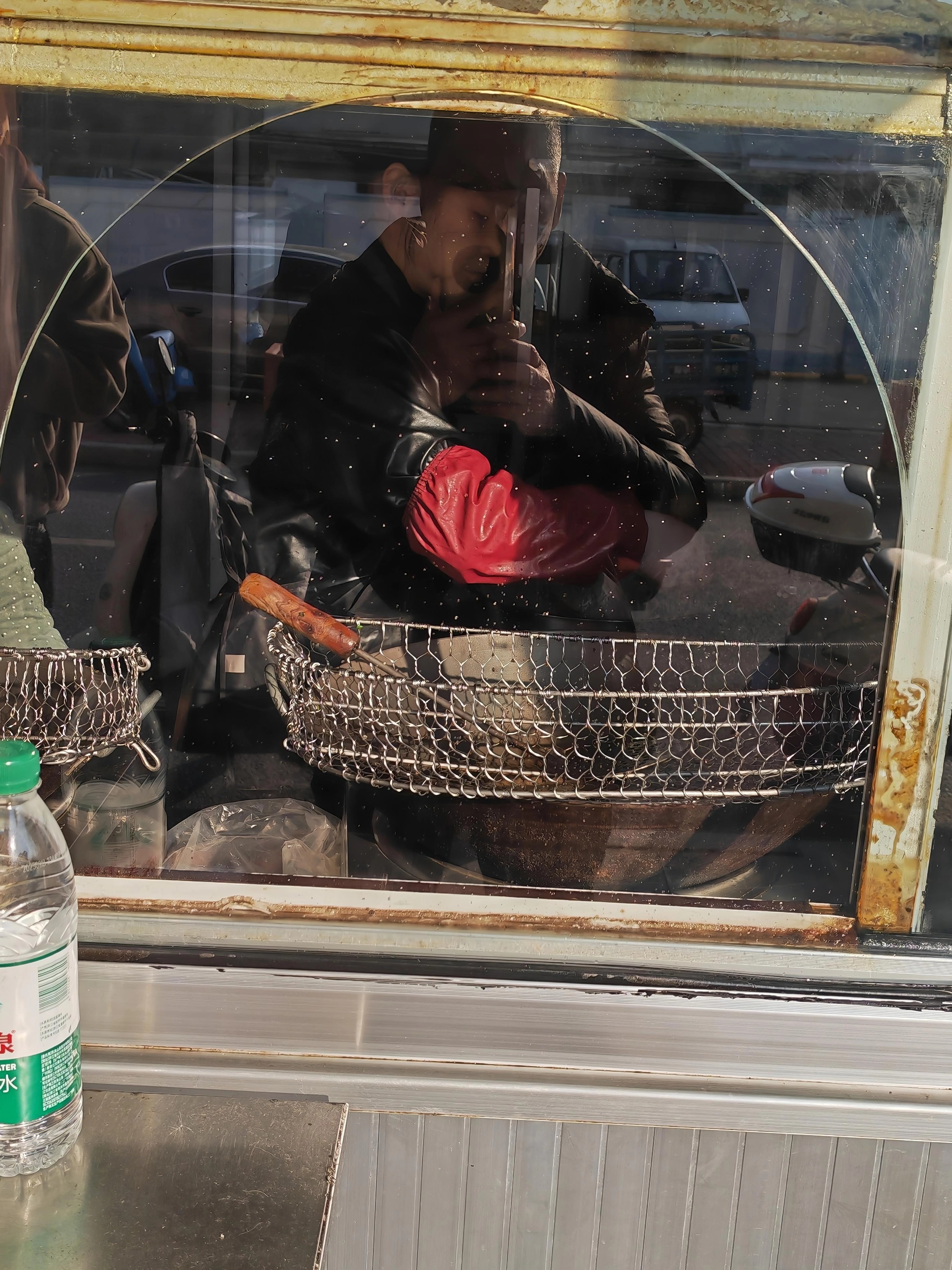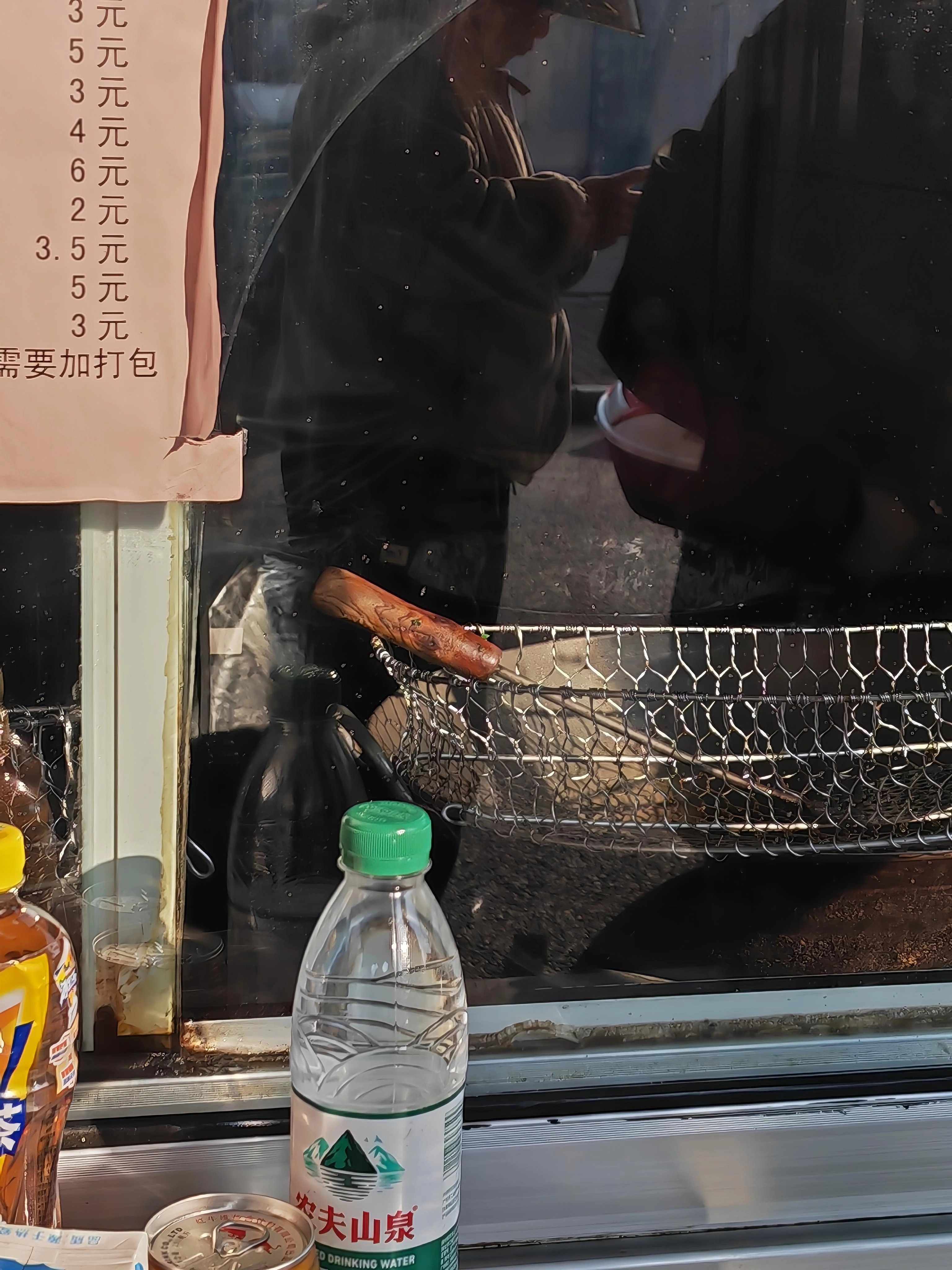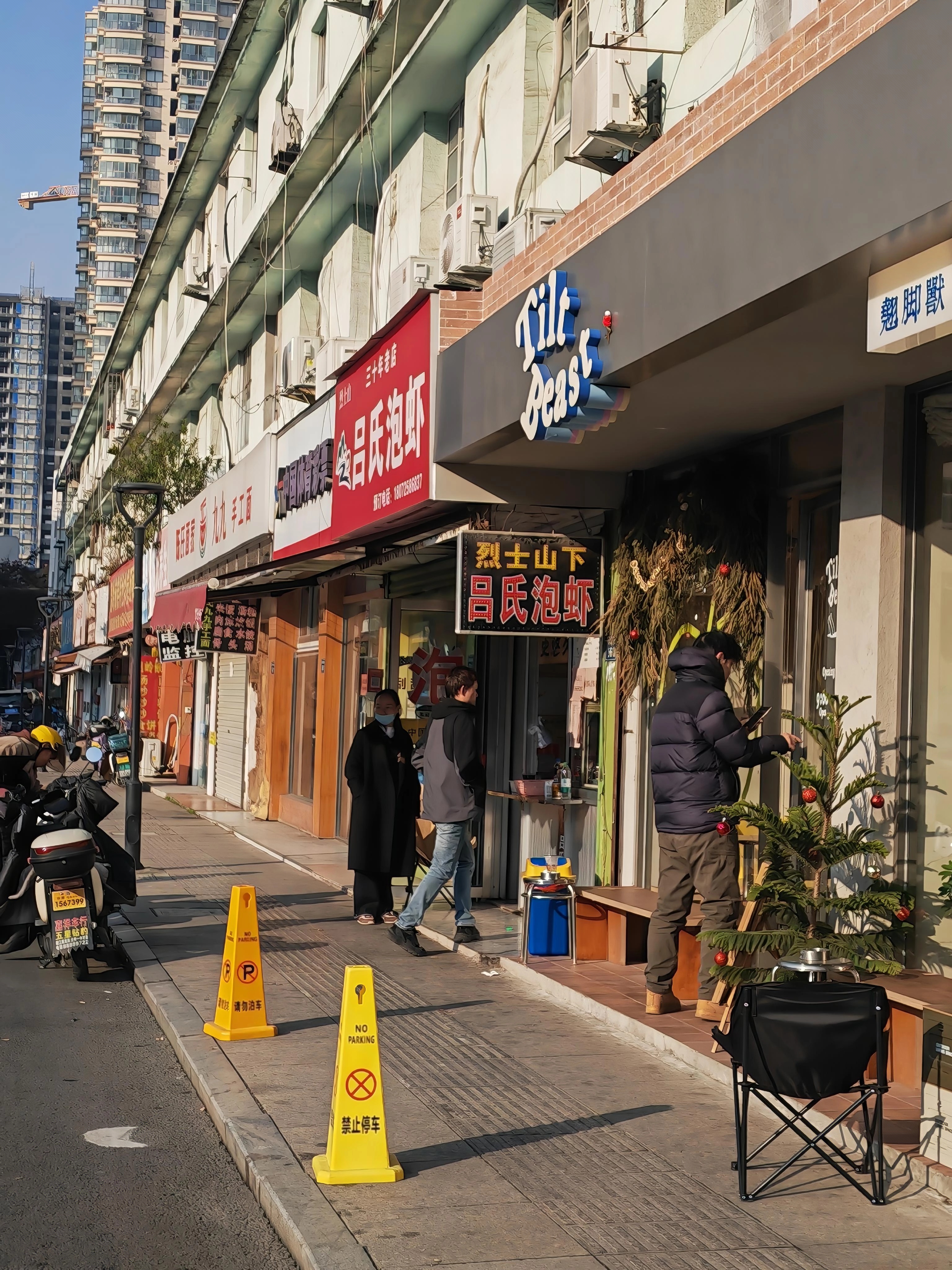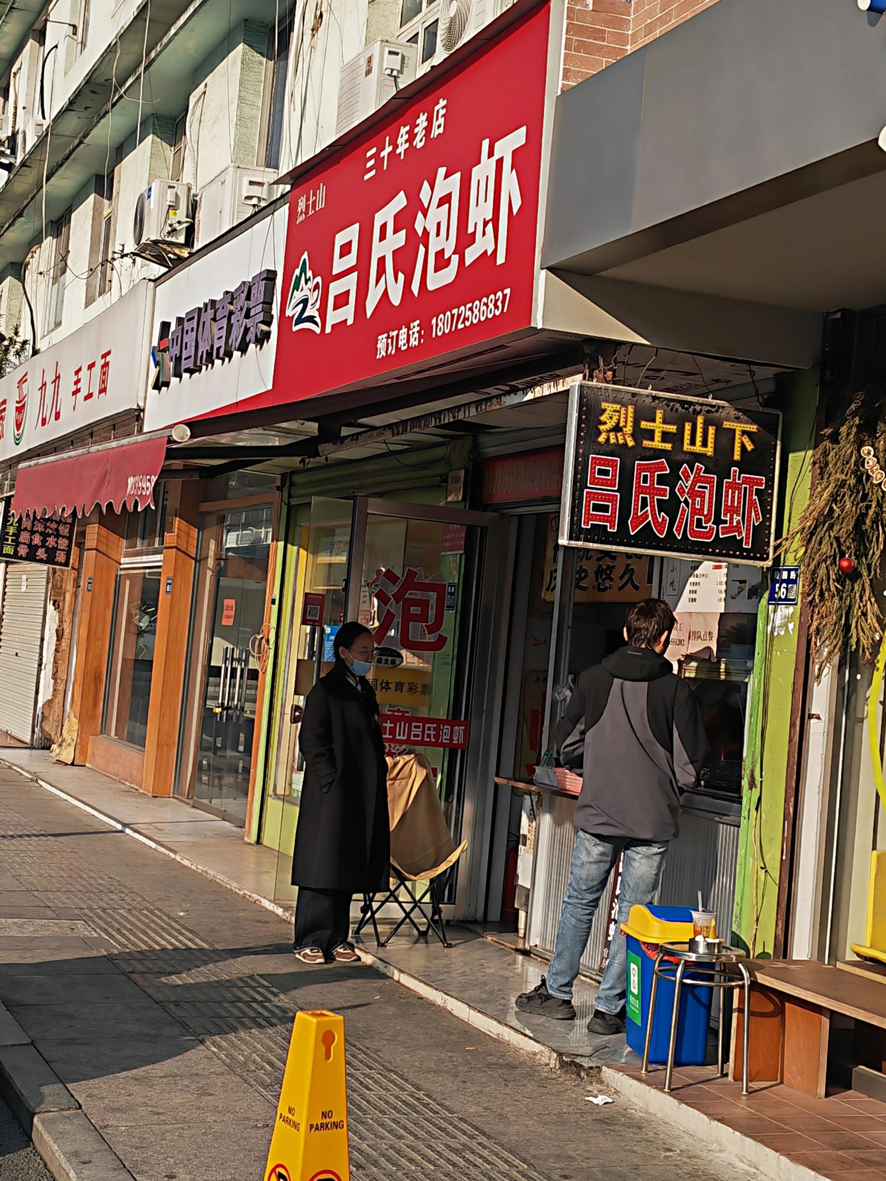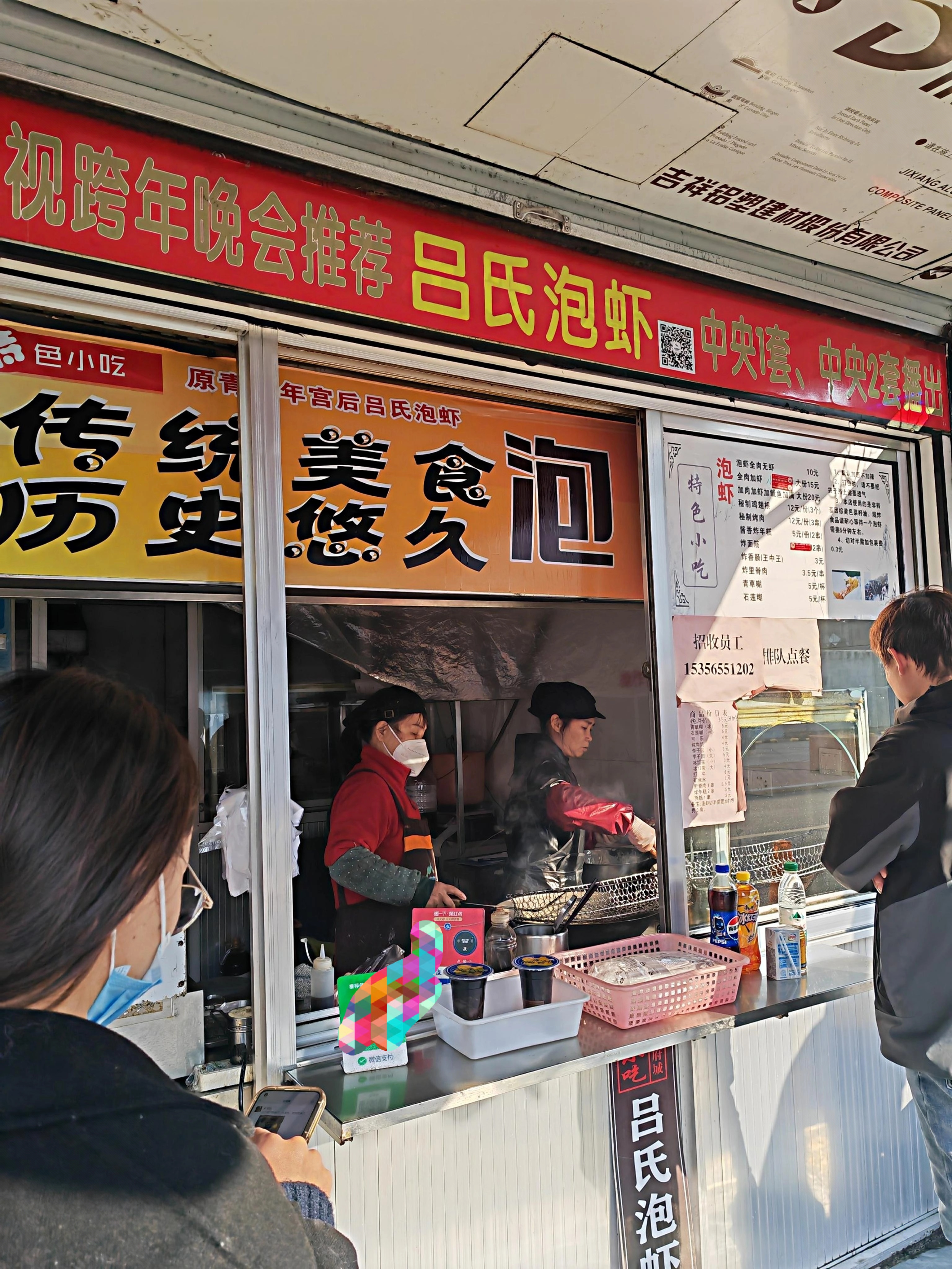 陵园路有间烈士山下泡虾🦐老店,很是出名,央视春晚还推荐过,但附近的市立医院几年前搬迁了,也不知这间泡虾店是不是还开着。带着疑问驾车来到陵园路,往日车满为患的停车位上空空如也,打开车门远远就闻到了间有烧油条、烤里脊、烤鱿鱼的诱人浓香,知道这间泡虾老店还在营业。前面等有2位女士和一位先生,还有一位在隔壁享用小吃的食客定了一只,我在忙着拍照时后面又来一位,我才想起慌忙先定一只。泡虾是台州特色小吃,属油炸类面食,舀一杓稀薄的面糊,倒入翻滚的油锅里慢慢地炸,大概有浸泡于滚油之意。至于虾,则有点费解,不知是不是确也有包裹有大虾,还油炸成稍发紫之面块形似大虾🦐,反正我们童年记忆中吃的泡虾大多无虾,偶尔奢侈一回,才有虾。当然,更无肉。现在工艺改进了,基础版就是包裹了厚厚的肉末,还可加虾,又可加鱿鱼。我点的是加肉加虾,没要辣。我在重庆吃过10余年的麻辣火锅,吃辣自然不在话下,但我没点辣,要的就是接近童年记忆中的味道。