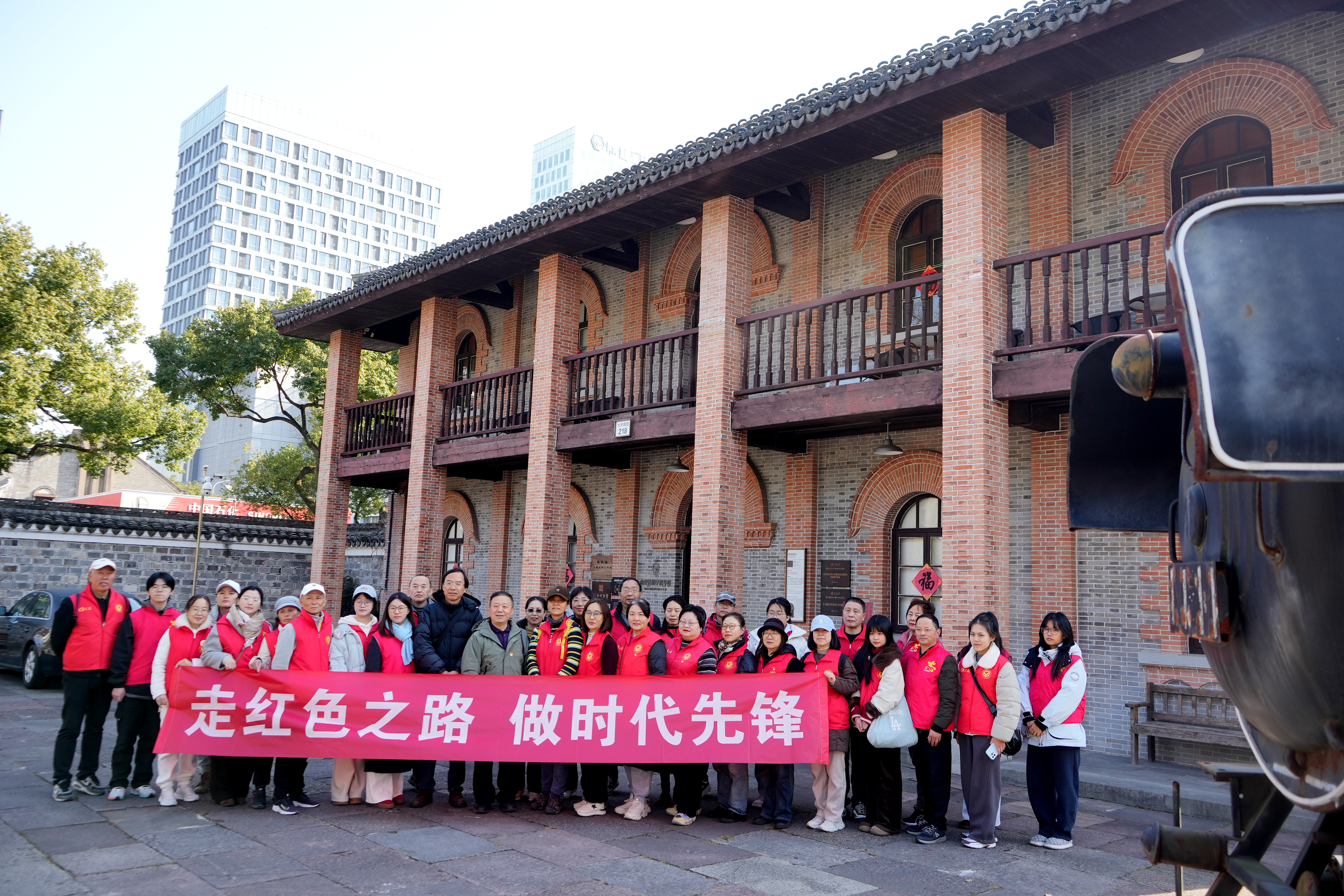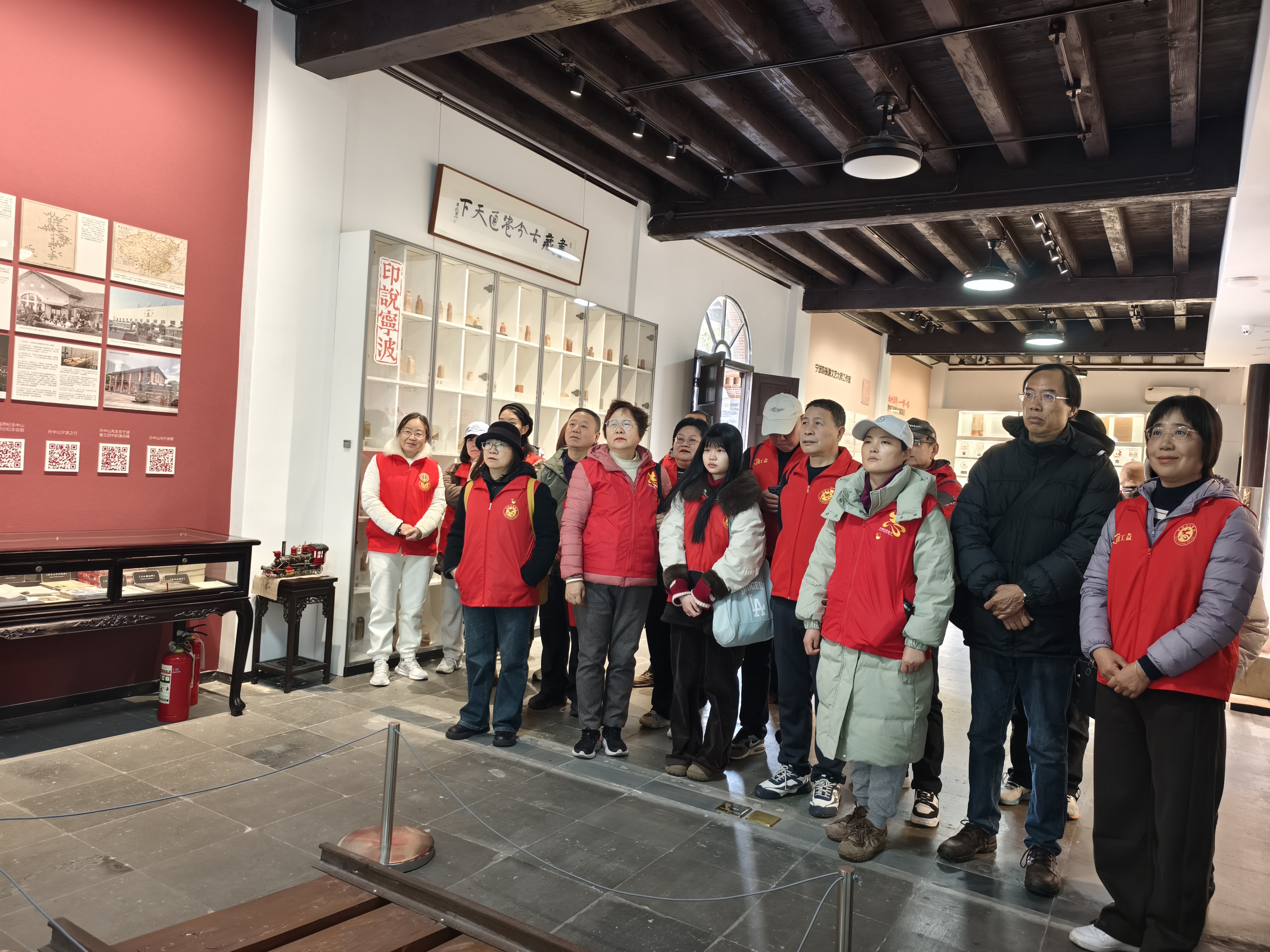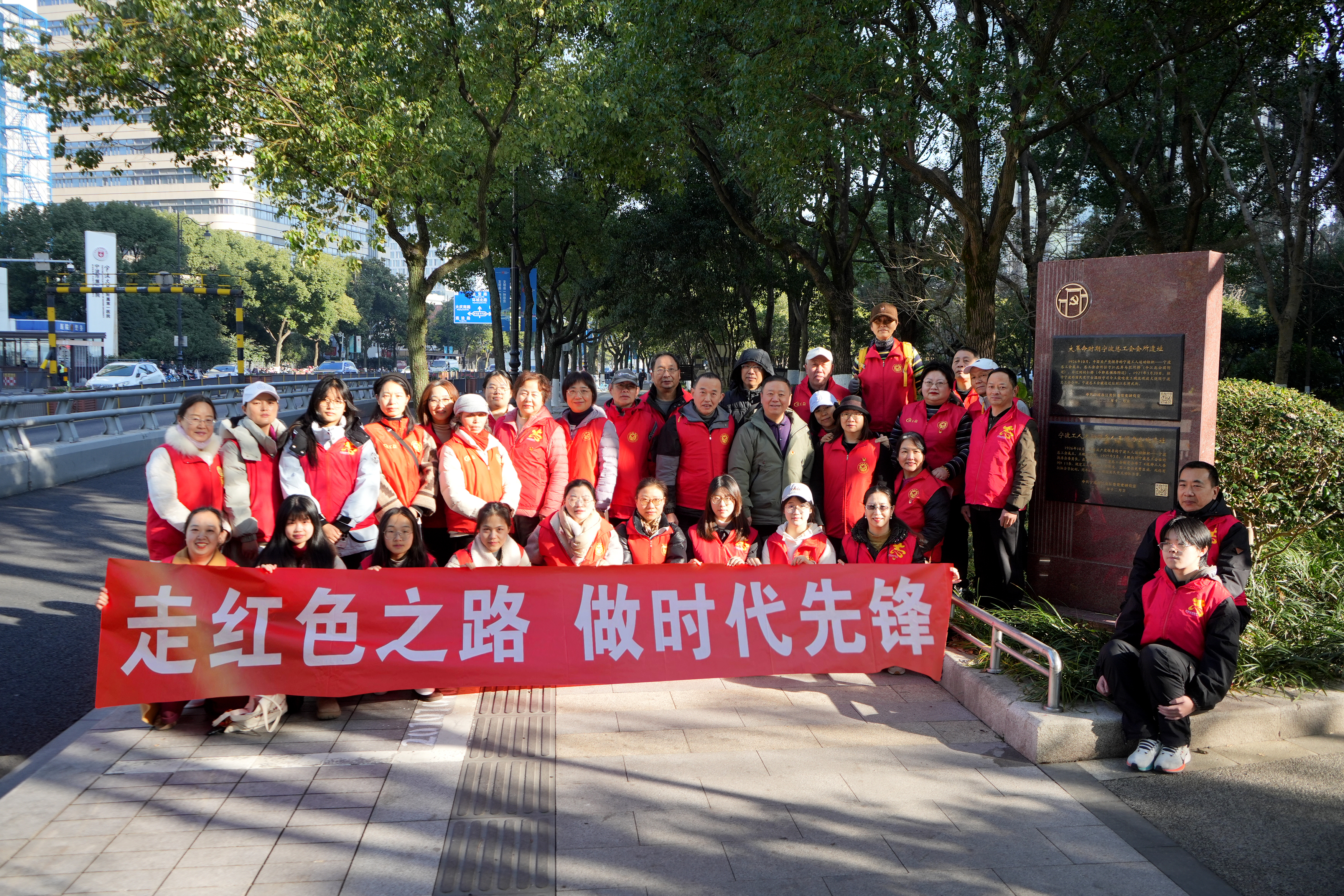 2026年1月10日上午,冬日的阳光里带着一点寒意。宁波工人运动纪念馆,组织37名单位干部、职工以及志愿者,进行了一场别开生面的“重走工运路”沉浸式徒步红色研学活动。 首站江北区大革命时期宁波总工会会所遗址。两块斑驳的石碑静静矗立——“大革命时期宁波总工会会所遗址”与“宁波工人运动领导人王鲲办公处遗址”。随后,队伍徒步探访浙海关住宅楼与邮政局旧址。穿梭于中西合璧的百年建筑群间,大家仿佛仍能听见当年外滩码头上,工人们劳作足音。行程来到甬曹铁路纪念馆。这里是重建后的精神地标,见证了王鲲同志深入铁路基层、组建工人纠察队的峥嵘岁月。馆内陈列的革命文献与影像史料,无声诉说着那段热血沸腾的历史;尤为珍贵的是,这里还记载了孙中山先生唯一一次莅临宁波视察甬曹铁路的重大史实。参观后大家都感悟万千,唯有不忘初心,传承红色基因。我们的民族方能凝聚磅礴伟力。(文/俞晓军、方琪平;摄影:戈永平)