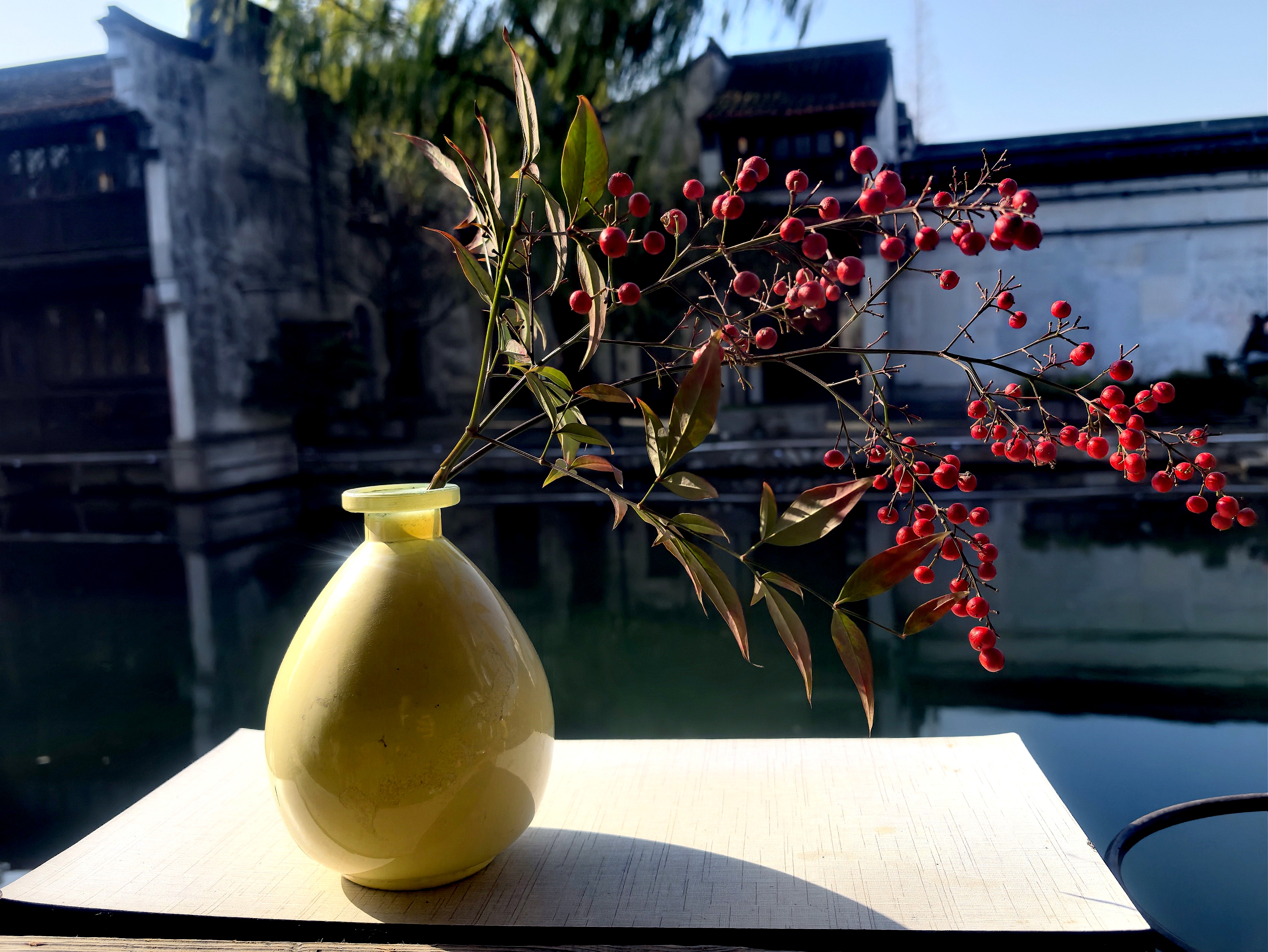 江南水乡的冬日,黄瓶盛艳果,红珠缀枝头,白墙黛瓦作底色,皆是温柔。