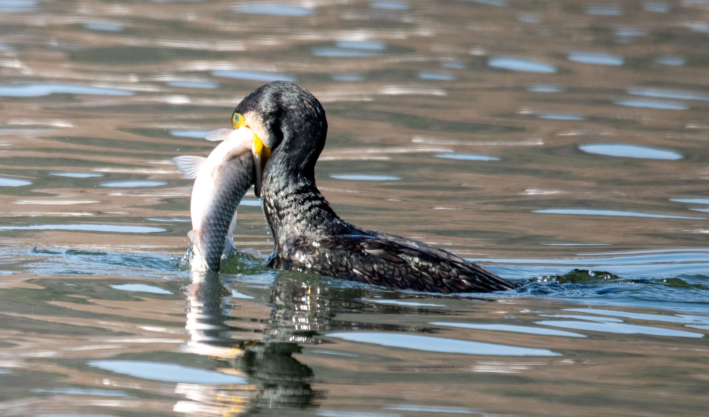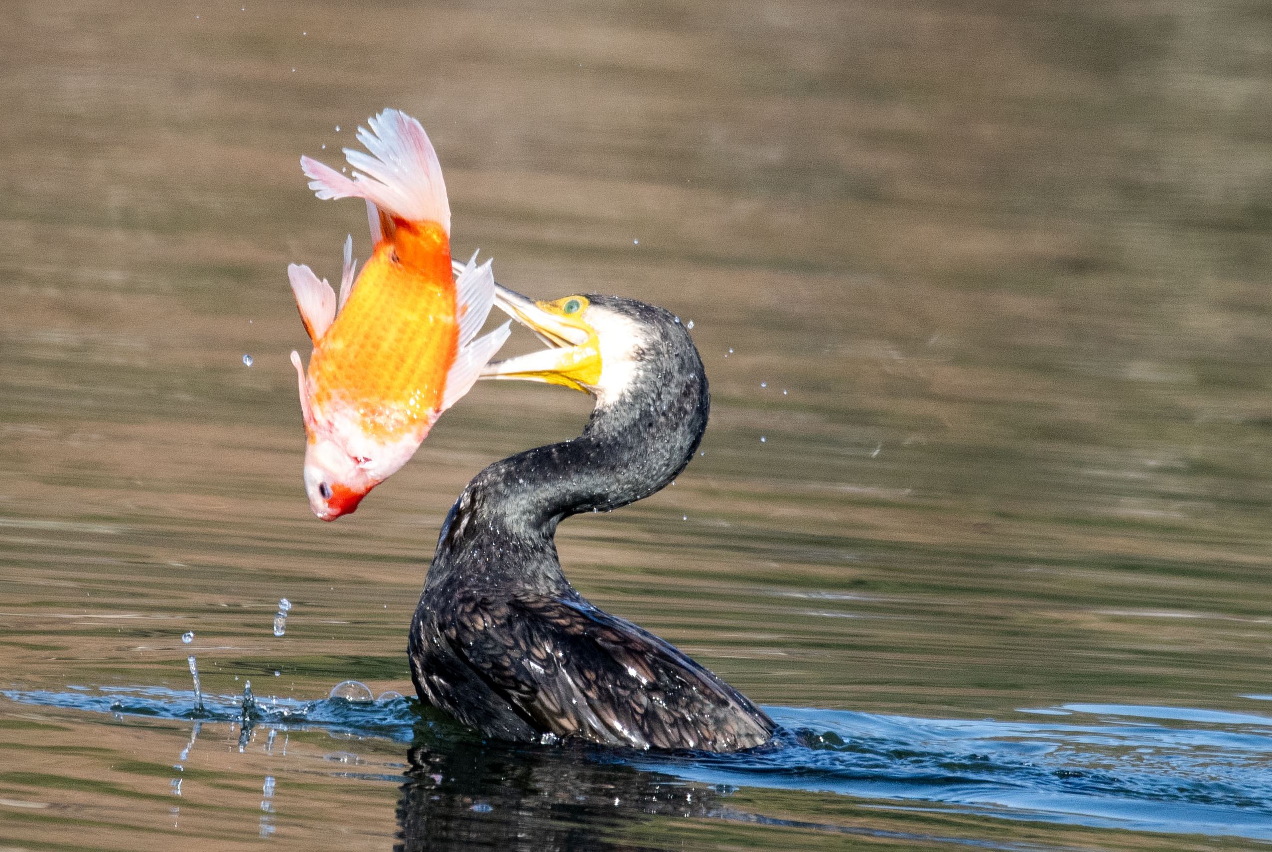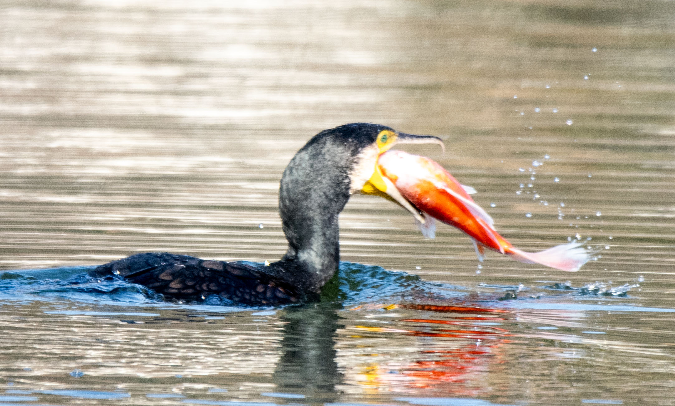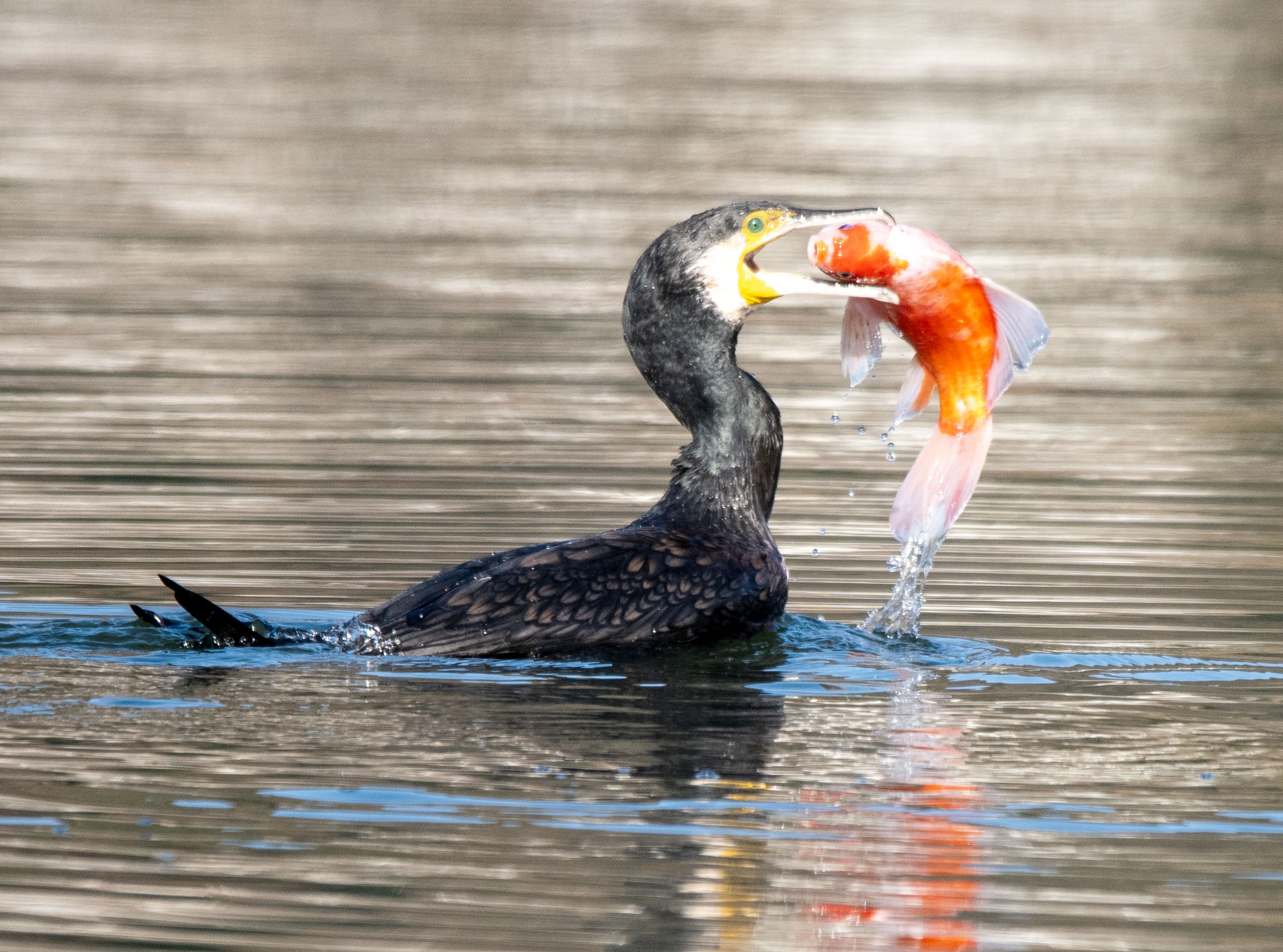 西湖这位年轻气盛的捕鱼小能手鸬鹚,一瞅见那漂亮鱼和大鲫鱼,激动得跟啥似的,结果一个猛子扎下去,鱼没叼着,倒给自己给“砸晕”了,鱼都没吞下去!得咖,只能委屈巴巴地抓点小鱼来解饱咯∽