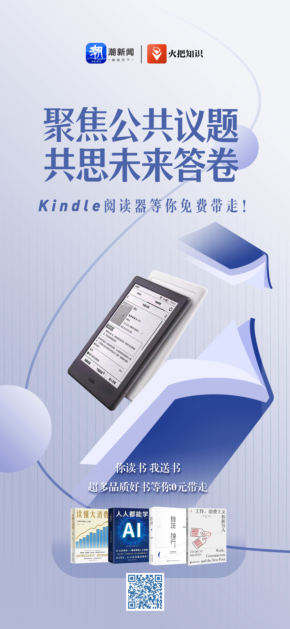 潮新闻“悦视听”频道“阅读”版块特别策划以“聚焦公共议题,共思未来答卷”为主题的阅读挑战,精选党建引领、科技创新、经济发展、生活消费等领域的好书,邀请您在字里行间紧跟两会步伐,聚焦热点议题! 值得一提的是,本期阅读挑战重磅加码Kindle阅读器奖励,完成阅读任务即有机会0元带回家,让这座线上图书馆陪伴你的新年阅读之旅!更有超多纸质好书等你带回家哦!