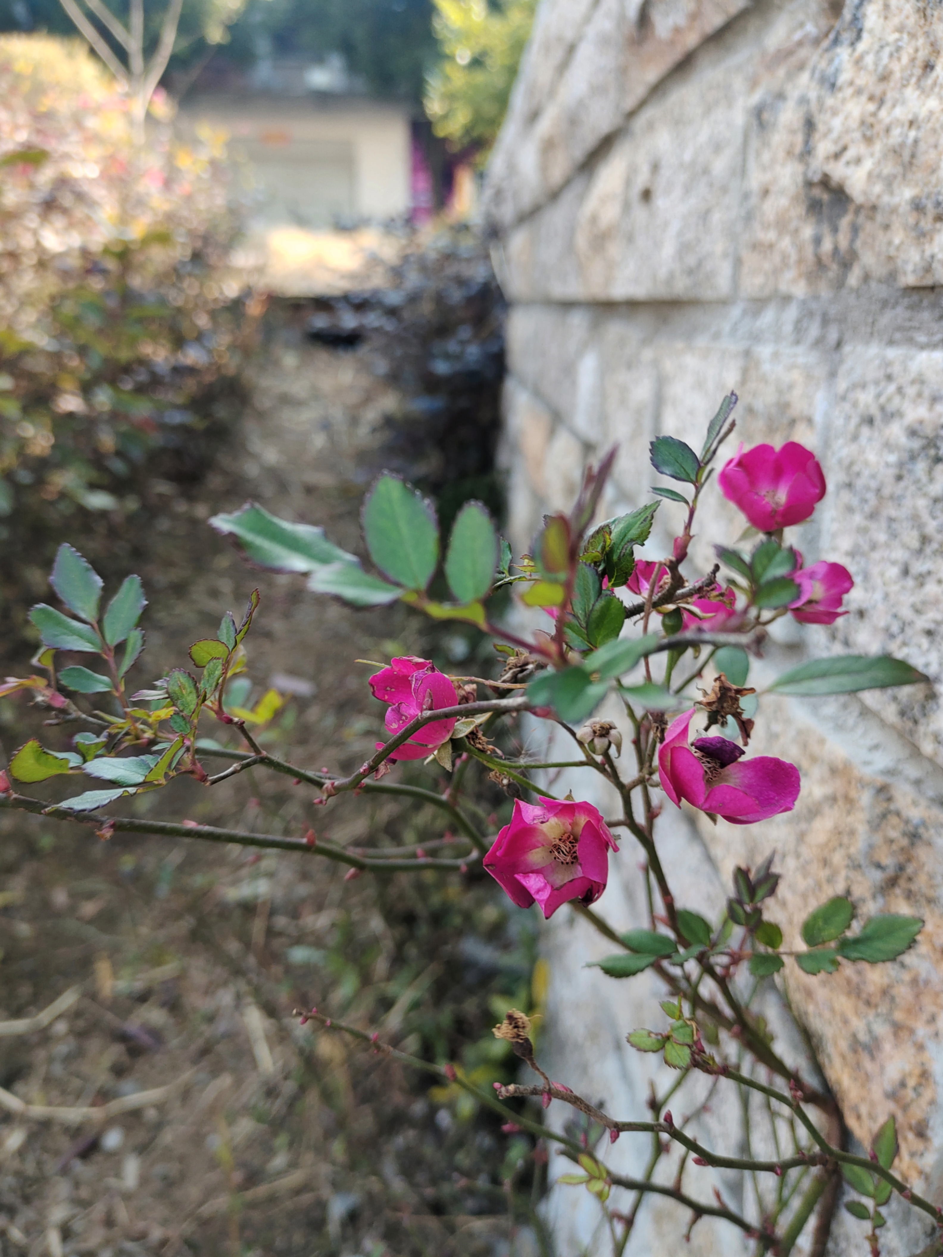 冬日小院,阳光穿过枝条,粉红玫瑰在石墙边悄悄绽放,绿叶衬着花蕾,野蔷薇也来凑热闹,自然的美最治愈。