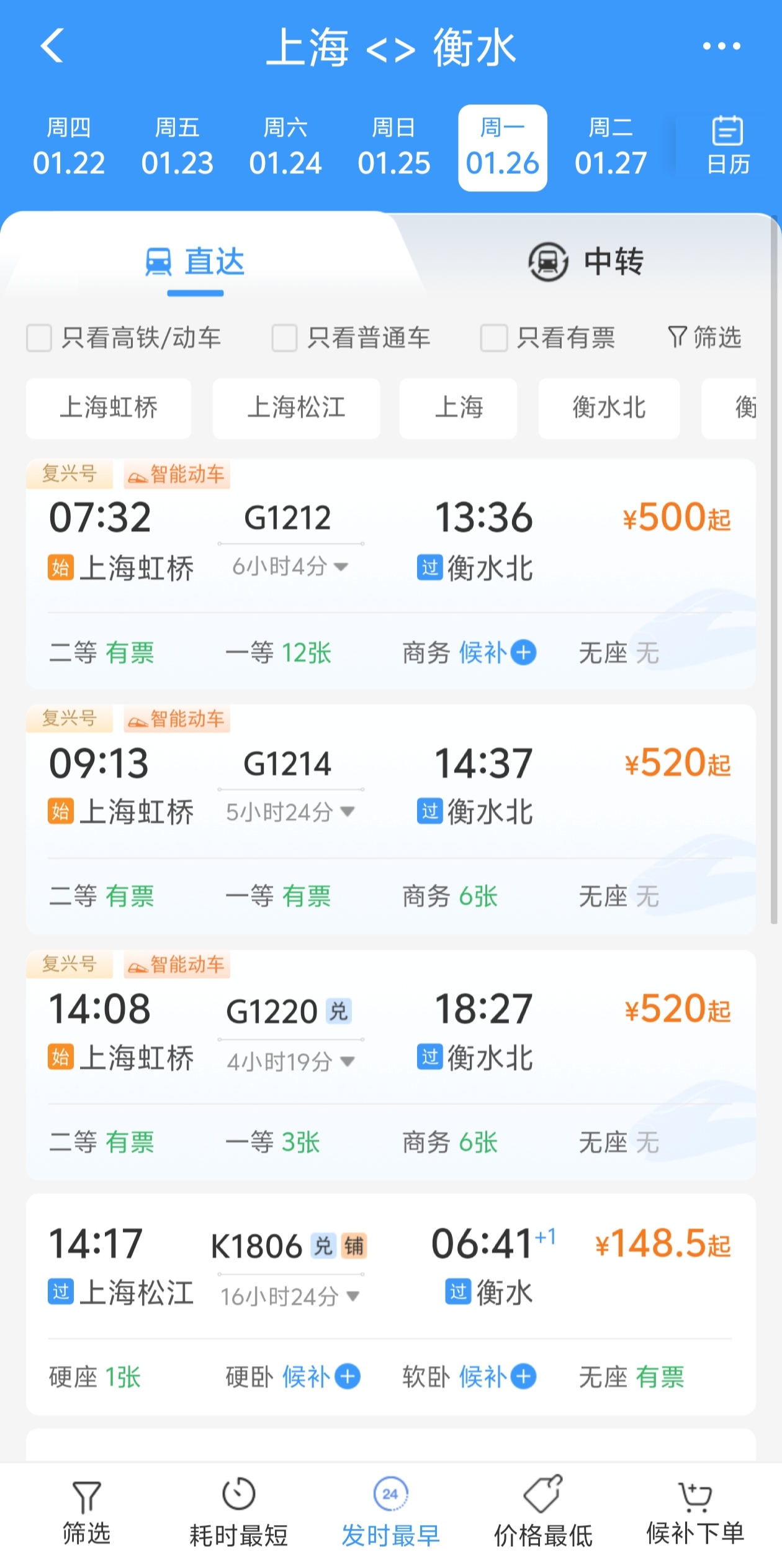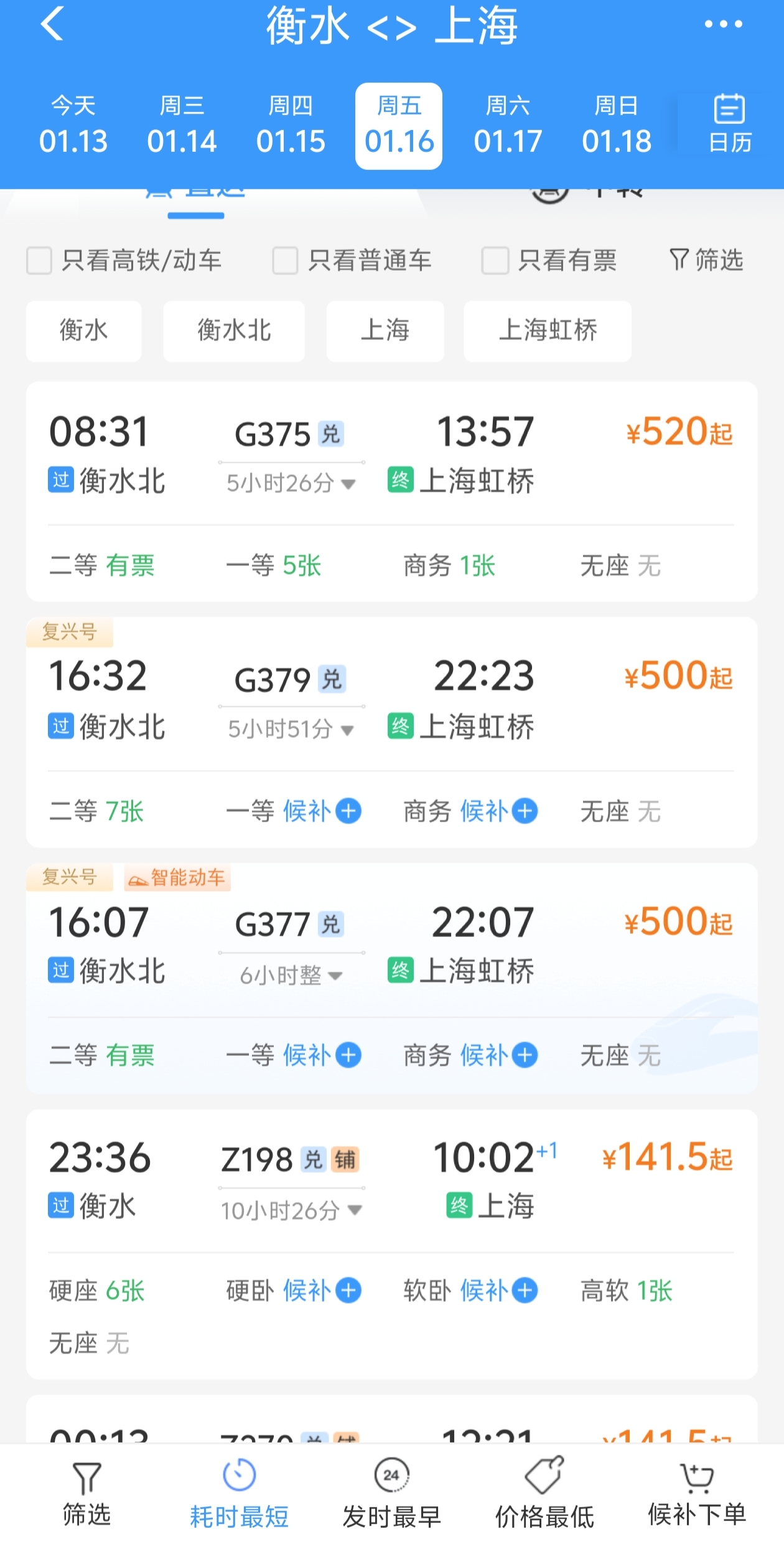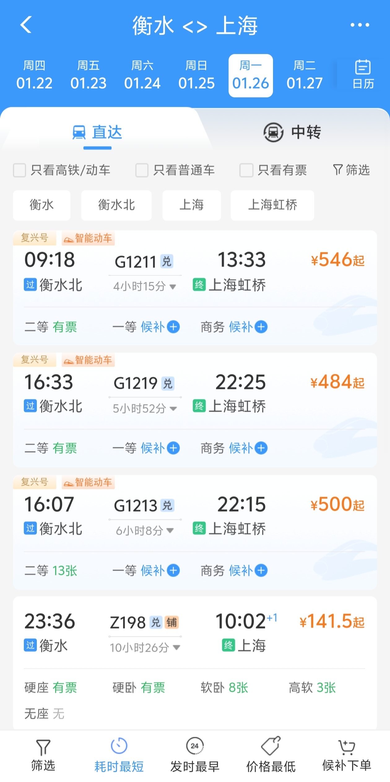 1月26日起,衡水北站途经济南、南京、苏州,4小时15分钟到上海虹桥! 自2026年1月26日起,衡水北至上海虹桥运行时间由之前的5小时26分钟缩短至4小时15分钟标志着两地正式迈入“朝发夕归”交通新阶段。 G1211次9时18分自衡水北站出发,13时33分抵达上海虹桥站,用时4小时15分钟,返程G1220次14时8分从上海虹桥站开出,18时27分返回衡水北站,用时4小时19分 。旅客可通过铁路12306官方网站及手机App购买车票。