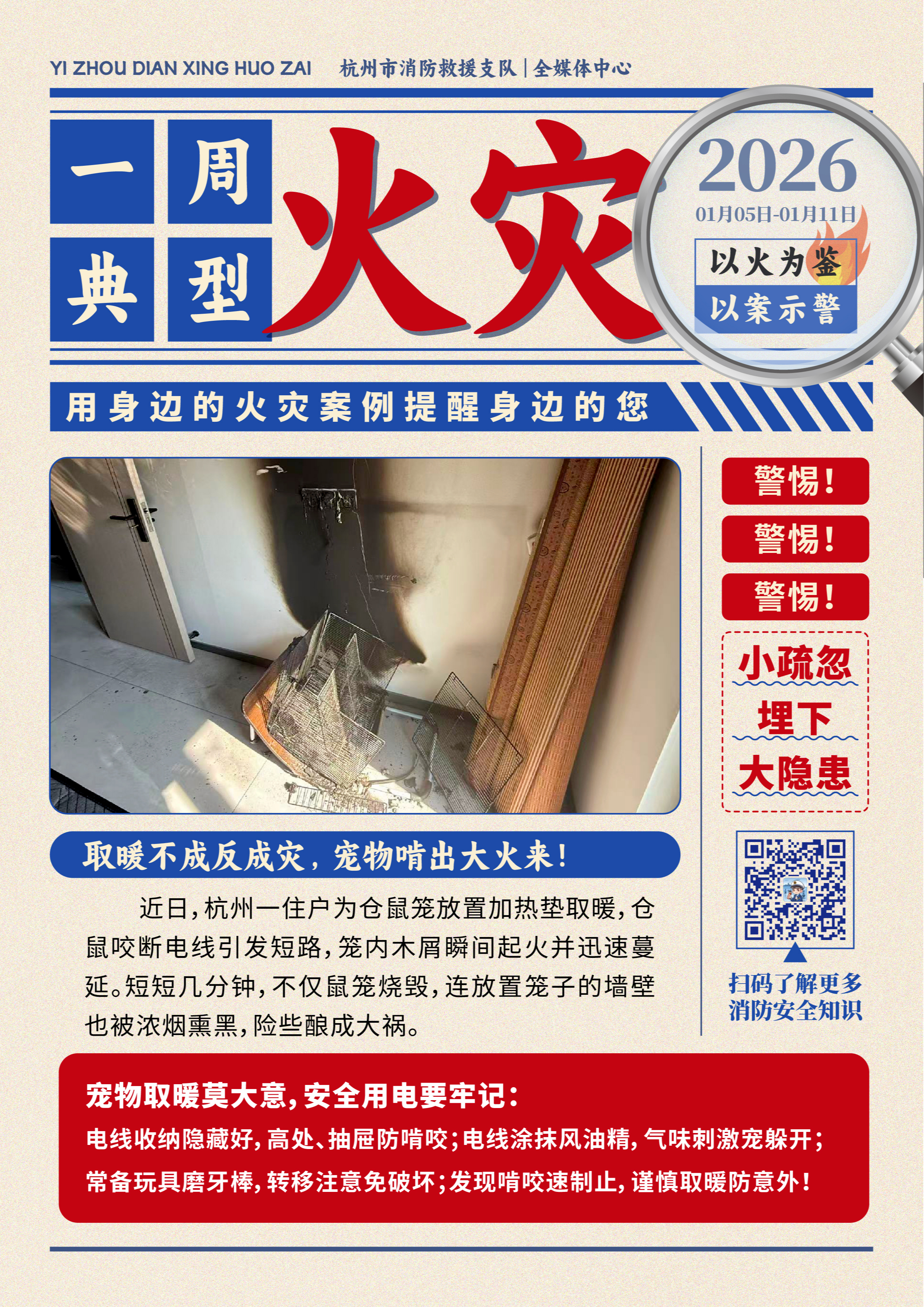 取暖不成反成灾,宠物啃出大火来! 近日,杭州一住户为仓鼠笼放置加热垫取暖,仓鼠咬断电线引发短路,笼内木屑瞬间起火并迅速蔓延。短短几分钟,不仅鼠笼烧毁,连放置笼子的墙壁也被浓烟熏黑,险些酿成大祸。 宠物取暖莫大意,安全用电要牢记:电线收纳隐藏好,高处、抽屉防啃咬;电线涂抹风油精,气味刺激宠躲开;常备玩具磨牙棒,转移注意免破坏;发现啃咬速制止,谨慎取暖防意外!